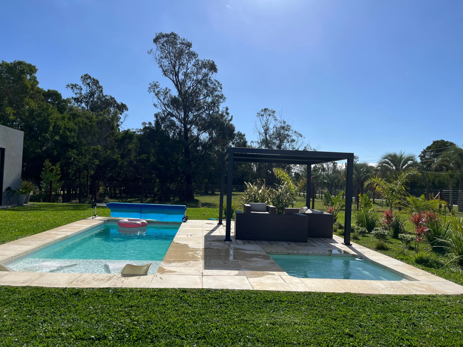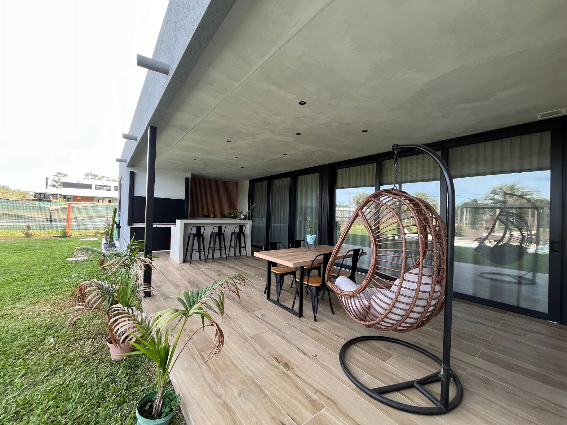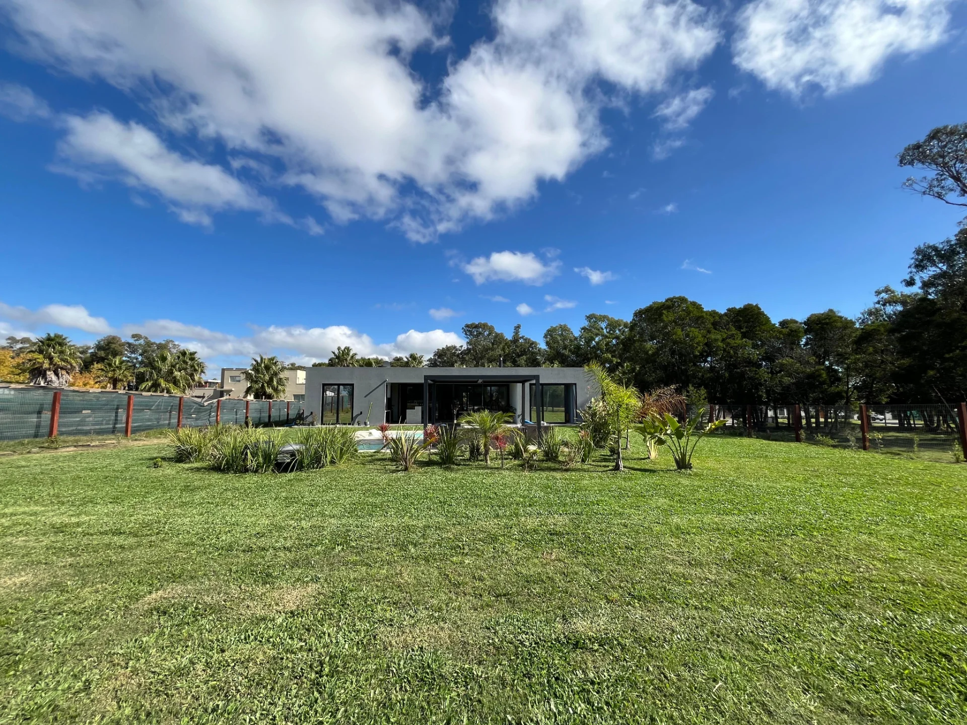 En el exterior, la casa dispone de una piscina rodeada de áreas verdes y un sector de quincho techado, ideal para actividades al aire libre. La propiedad admite mascotas, lo que la hace adecuada para familias que buscan un espacio amplio y funcional. El diseño de la casa incorpora materiales y terminaciones que se aprecian en las imágenes, con espacios pensados para el confort y la integración con el entorno.