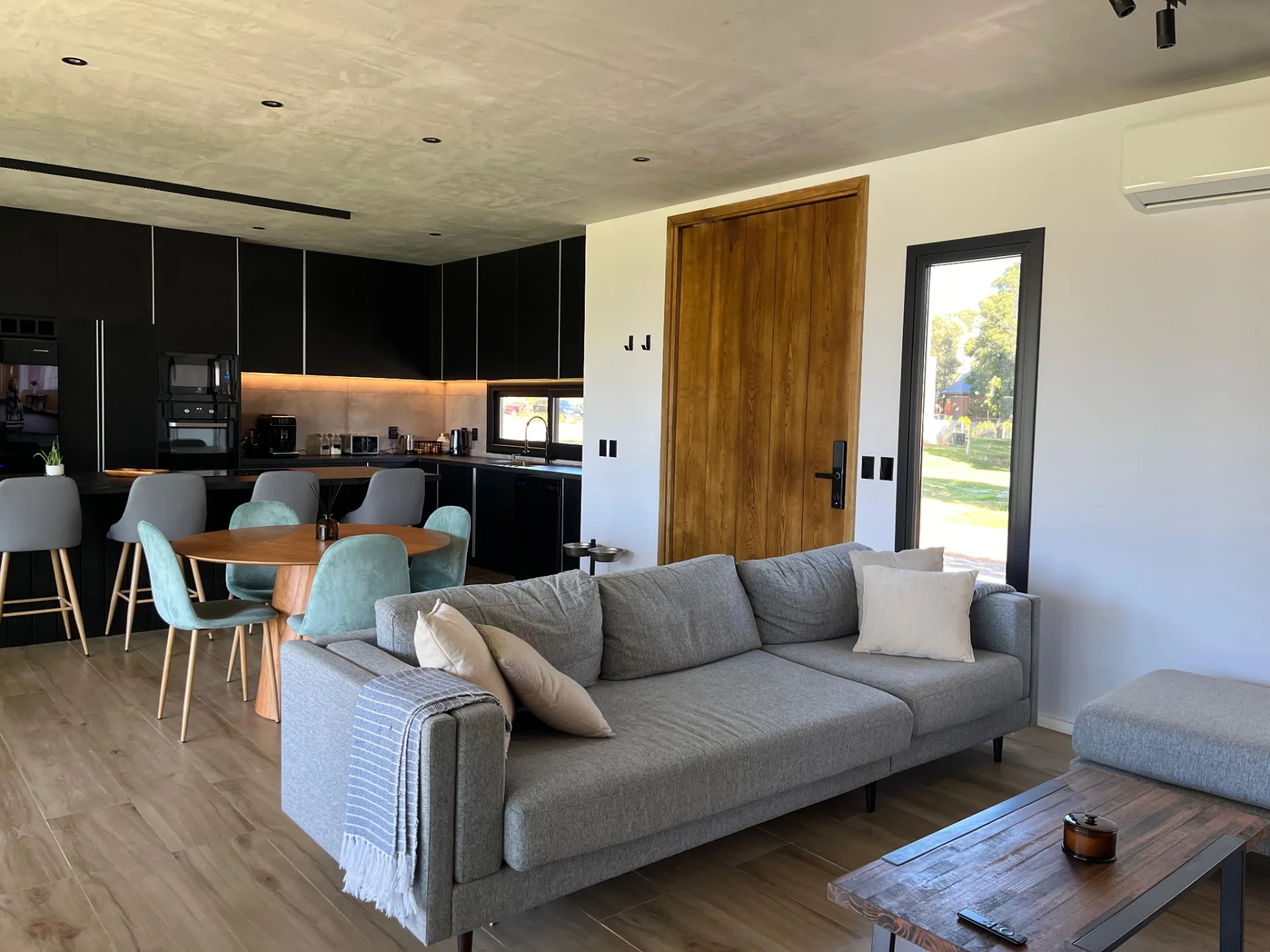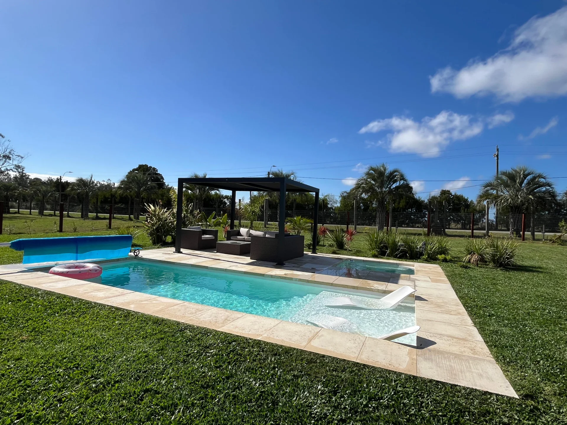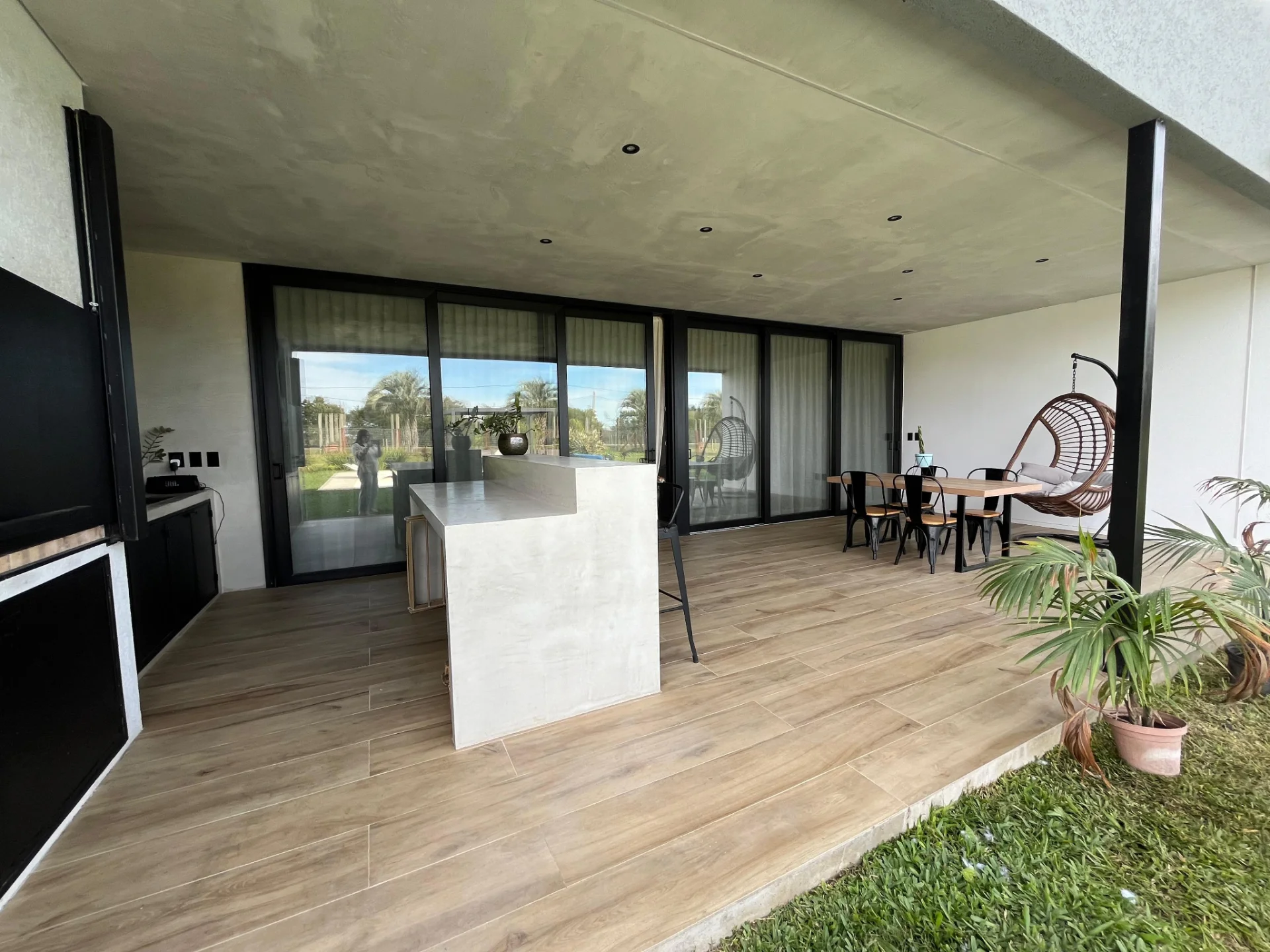 En el exterior, la casa dispone de una piscina rodeada de áreas verdes y un sector de quincho techado, ideal para actividades al aire libre. La propiedad admite mascotas, lo que la hace adecuada para familias que buscan un espacio amplio y funcional. El diseño de la casa incorpora materiales y terminaciones que se aprecian en las imágenes, con espacios pensados para el confort y la integración con el entorno.