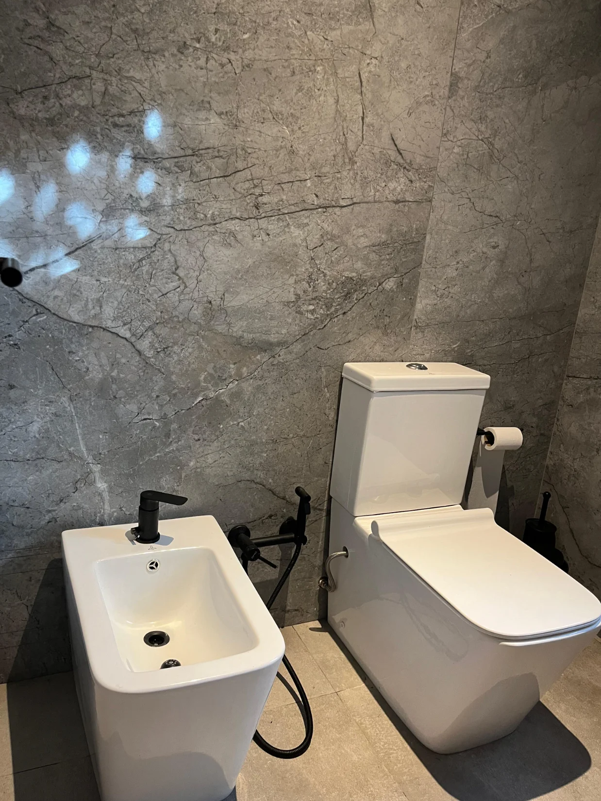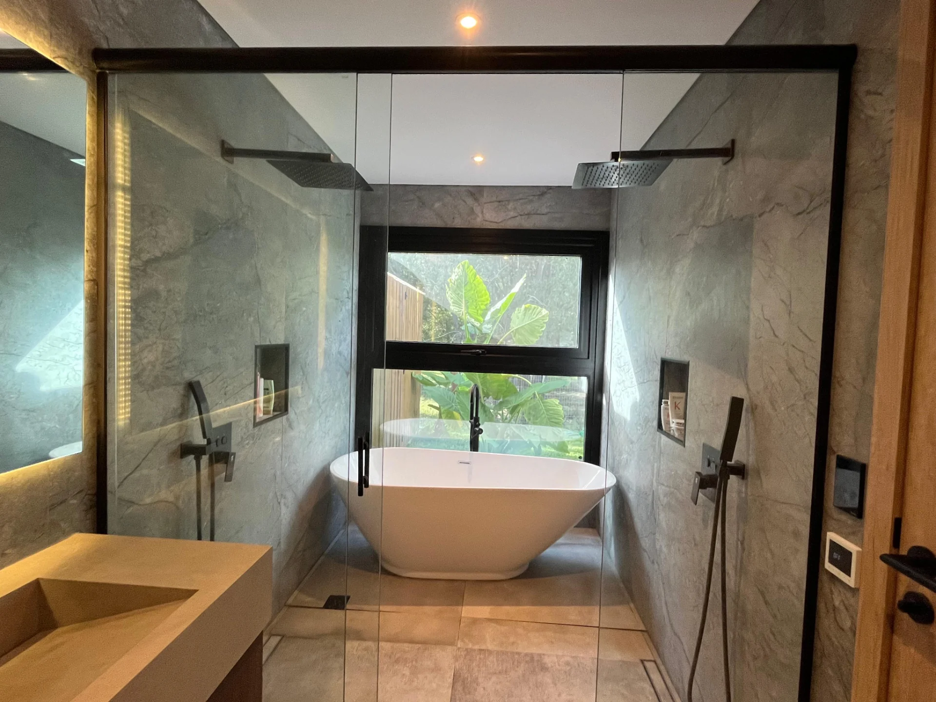 -1 baño en suite compartimentado un área con bañera exenta, doble ducha, calienta toallas, lavado doble, y otra área water y bidet separado