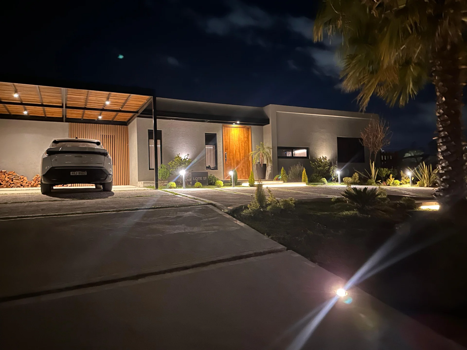 Casa ubicada en un entorno natural, con una superficie total de 1271 m² y un área privada de 204 m² con barbacoa techada. El acceso principal se encuentra rodeado de jardines y áreas verdes, con iluminación exterior y un sector de estacionamiento techado. La propiedad cuenta con tres dormitorios y dos baños (1 en suite), permitiendo una distribución funcional y cómoda para sus habitantes. El living y comedor se integran en un espacio amplio, con ventanales que ofrecen vistas al exterior y acceso directo a la zona de jardín.