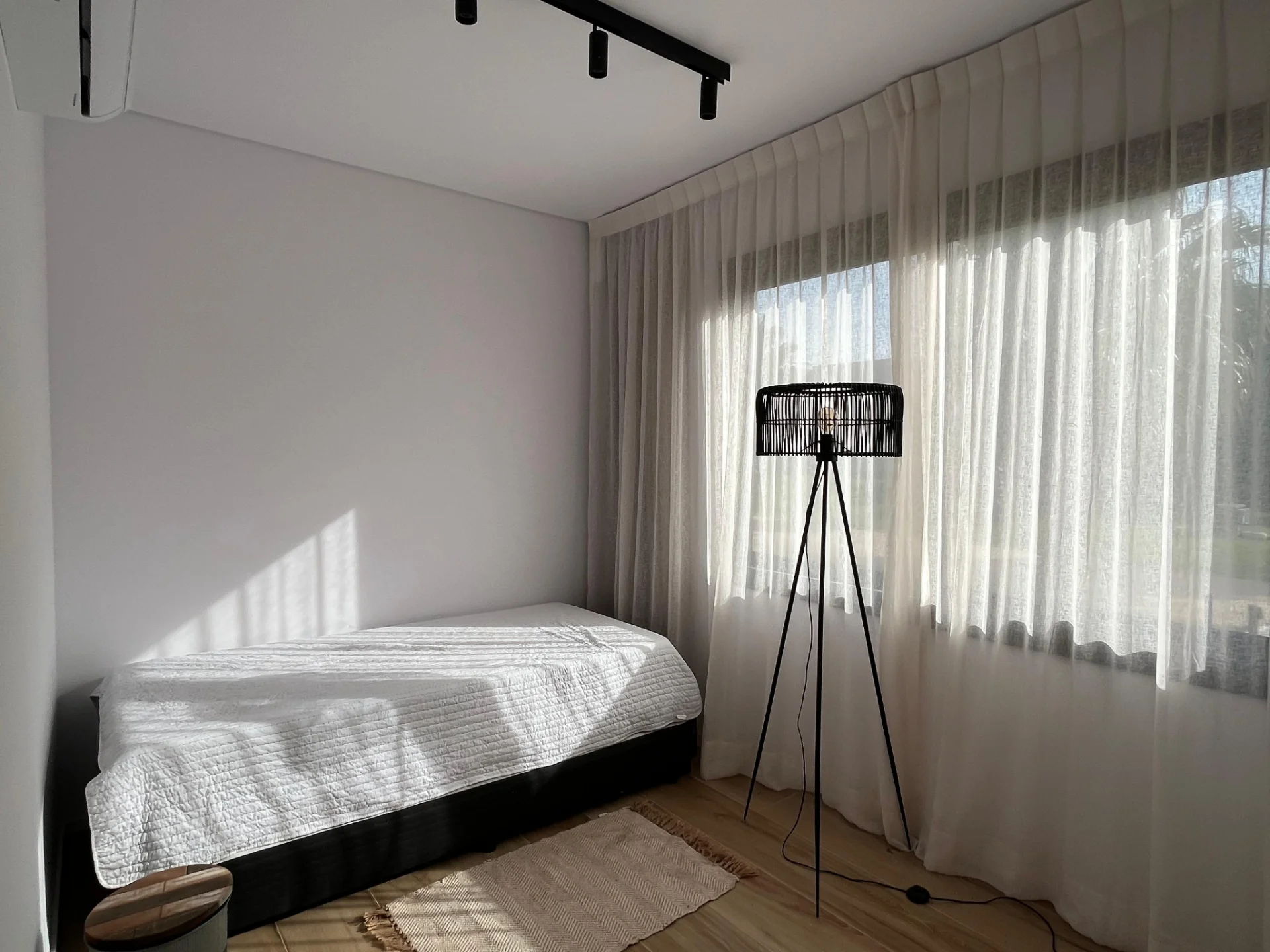 La cocina está equipada y presenta mobiliario de líneas rectas, con una barra central y espacio para comedor diario. Los baños incluyen detalles en revestimientos y equipamiento, destacando la presencia de una bañera y doble lavamanos en uno de ellos. Los dormitorios cuentan con ventanas al exterior, proporcionando luz natural y vistas al entorno.