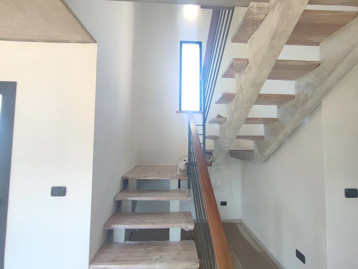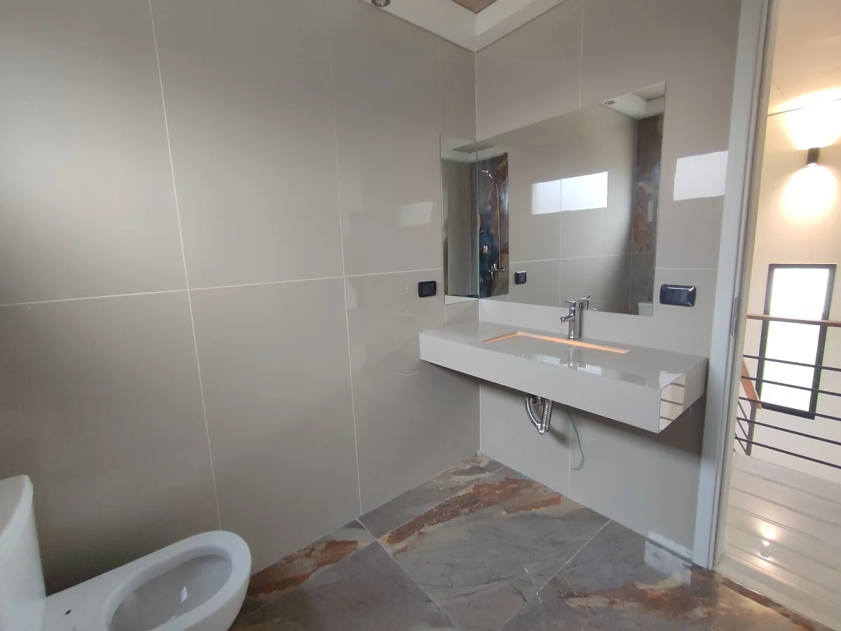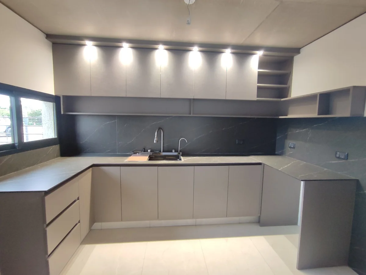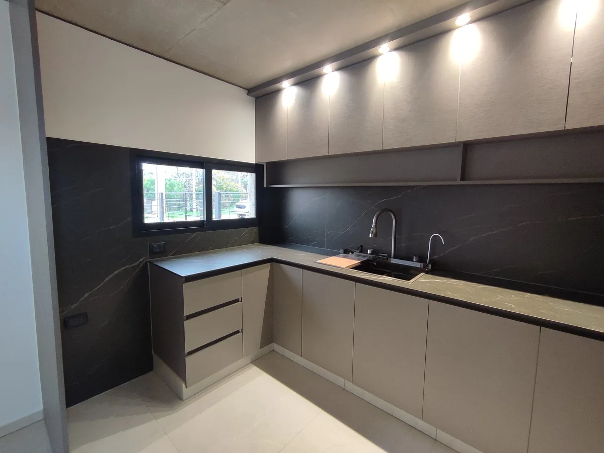 Construcción clásica con paredes de ticholo ladrillo o similar, pisos internos en porcelanatos, los cuales también cubren las paredes de cocina generando integración en las terminaciones de este sector. Baño revestidos con cerámicas de primera calidad. Dicroicas en los tránsitos de espacios sociales y sobre barra de cocina. Los muebles de cocina son de primer nivel, mesada de porcelanítico con acabados de paredes de la mismas terminaciones, todos los cerramientos de aluminio anodizado y reja perimetral frontal con portón automatizado y veredas transitables en todo el perímetro de la casa como el espacio vehicular (dentro del cual caben dos vehículos sin problemas).