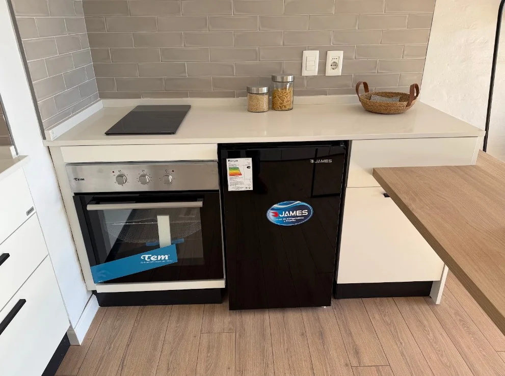 Cocina con barra, horno empotrado, anafe y frigobar