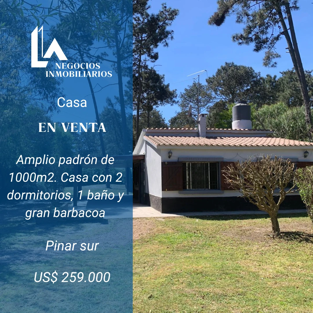 Laura Amaro Negocios inmobiliarios vende: Casa en PADRON UNICO, ubicada en Pinar Sur sobre Av. Manuel Oribe esquina Adolfo Joanicó, en un terreno de 1.000 m2 que brinda un entorno natural. (20 mt de frente por 50 mt de largo) La propiedad cuenta con una superficie edificada de 63 m2 en una planta, integrando living al frente, comedor con cocina integrada y baño completo reciclado recientemente. Los dos dormitorios disponen de placard, uno al frente y otro hacia el contrafrente, además de amplio espacio de bohardilla para guardado (sobre el techo del baño). Todas las aberturas cuentan con rejas. ventanas de aluminio con mosquiteros y postigones de madera que permiten una visión despejada hacia el parque. La casa dispone de pozo de 25 mt con previsión para riego. En el exterior, destaca la barbacoa techada de 50 m2 equipada con parrillero, horno de barro, y espacio techado para estacionar autos. Incluye también depósito con conexión para lavarropas, extenso parque adelante y al fondo, y acceso por calle asfaltada. La propiedad se encuentra a 600 metros de la playa y a 800 metros de Av. Giannattasio, sobre calle asfaltada, lo que asegura facilidad de acceso y proximidad a servicios relevantes. El predio representa una gran oportunidad para quienes buscan espacio y versatilidad en una ubicación de fácil acceso. Costo de Contribución anual: $34.000 aprox. Costo de Primaria anual: $11.000 aprox. Precio de venta: US$ 259.000. Medidas de los ambientes: 3.2x3.6 dormitorio al frente 3.2x2.8 dorm al contrafrente 3.6x2.8 living al frente 4.5x2.8 comedor-cocina 1.5x2.1 baño completo BENEFICIOS EXCLUSIVOS PARA NUESTROS CLIENTES!! Coordine su visita "Tu lugar ideal, nuestra prioridad". IMPORTANTE: LOS DATOS AQUÍ EXPUESTOS SON APORTADOS POR LOS PROPIETARIOS. Las medidas publicadas son aproximadas y la ubicación del mapa puede no ser exacta.