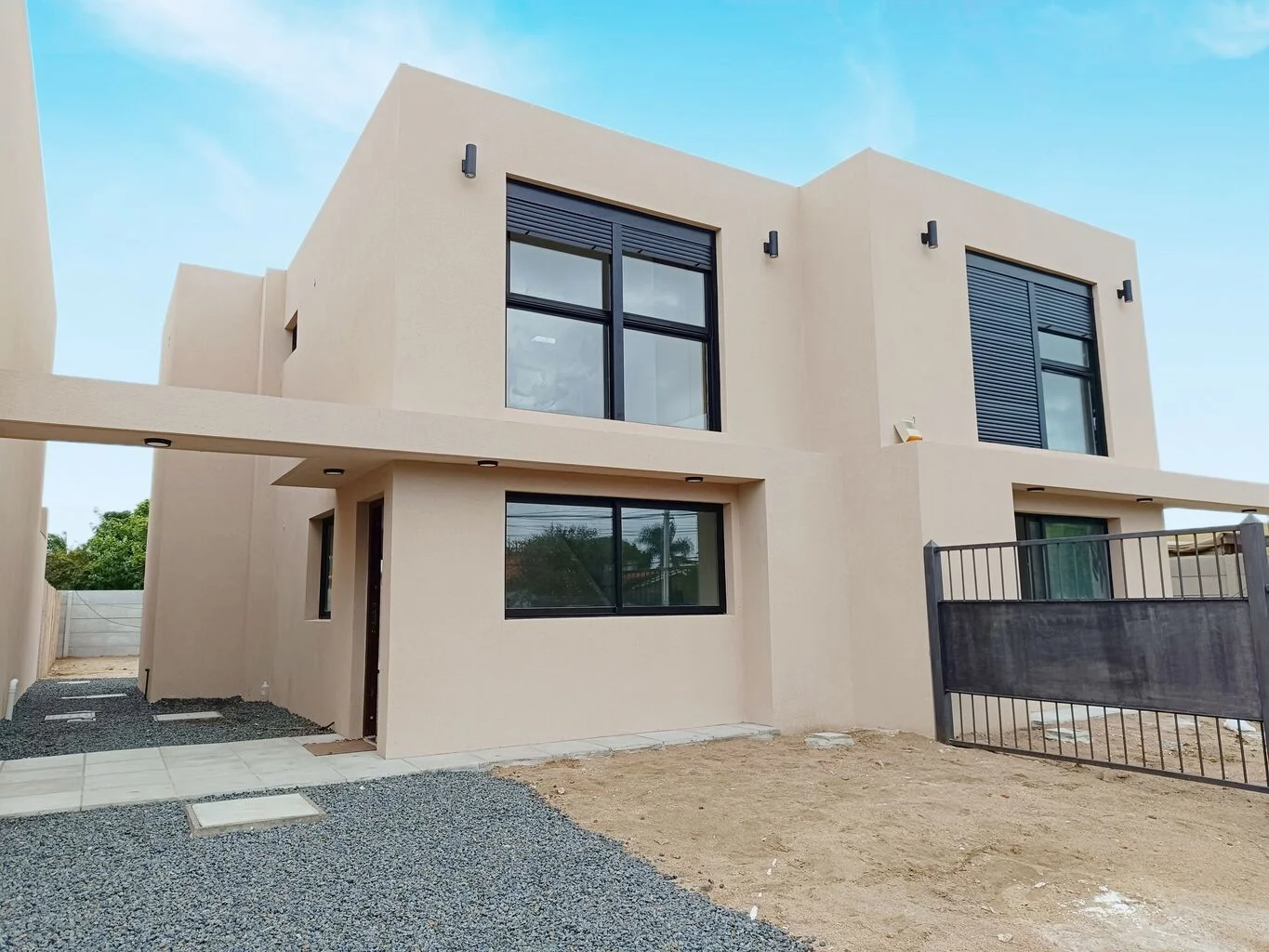 Cerramiento perimetral al frente con rejas, portón vehicular y peatonal, al fondo cerramiento perimetral con polines y muro.