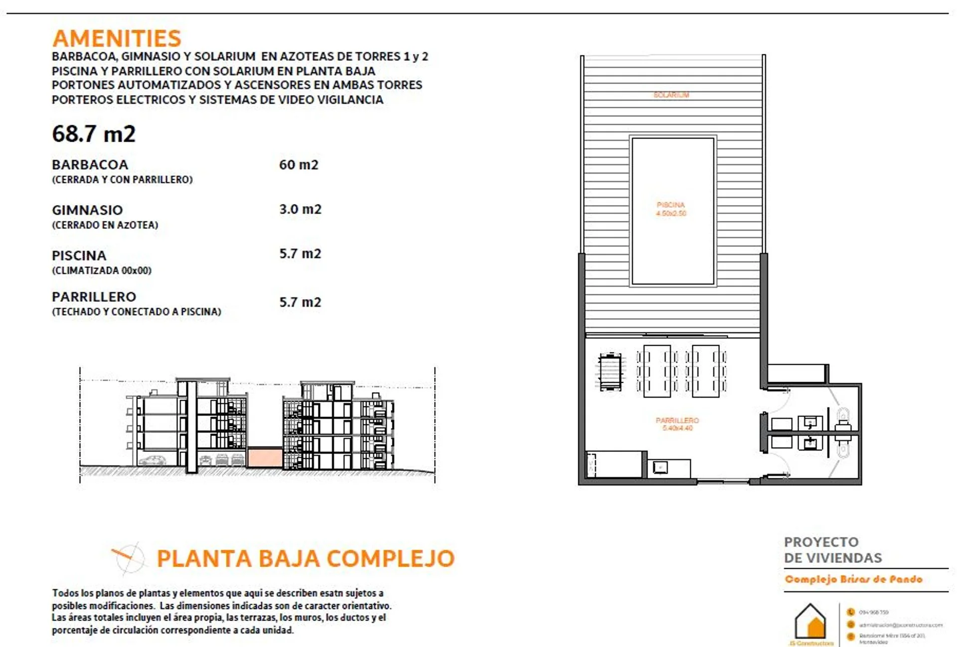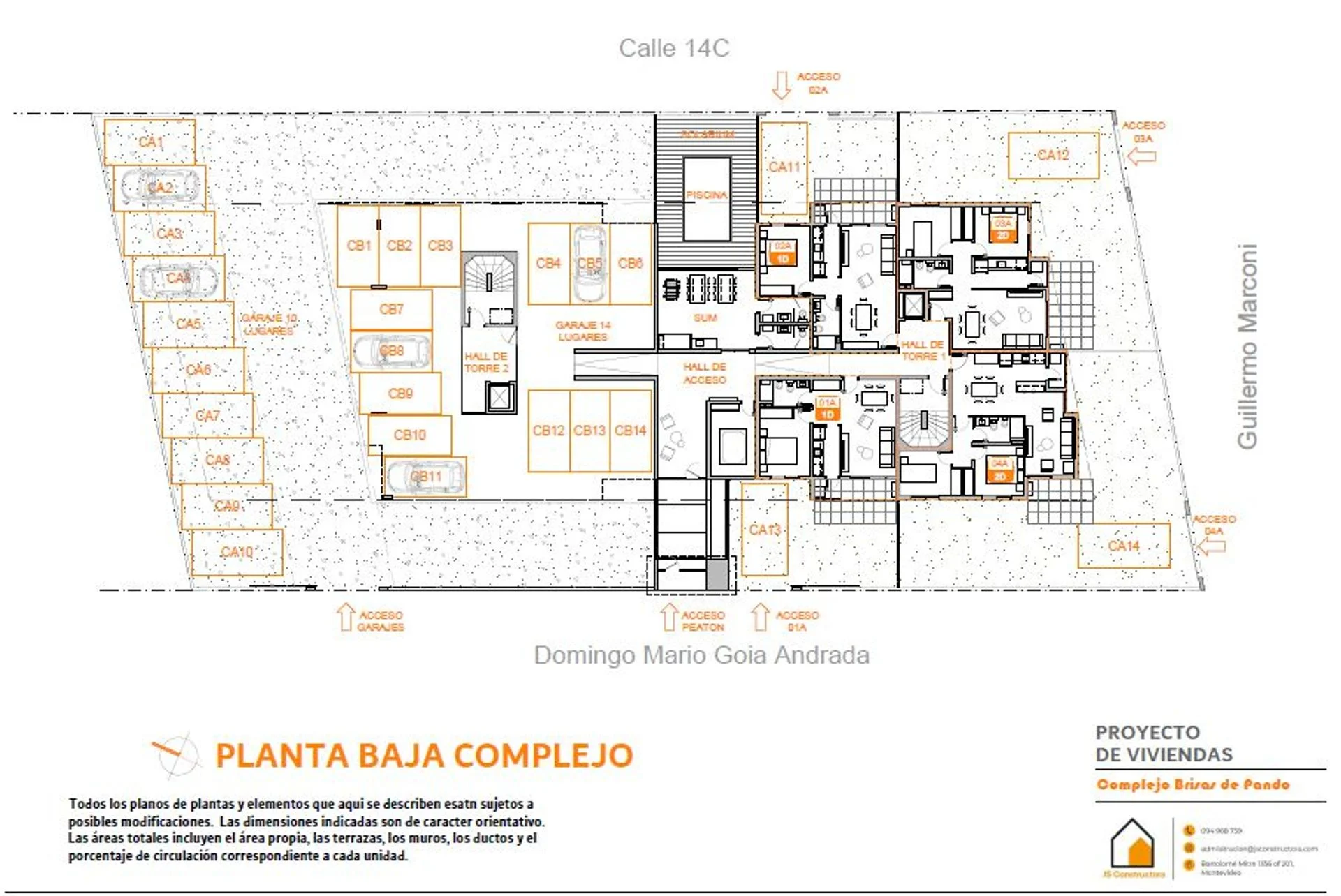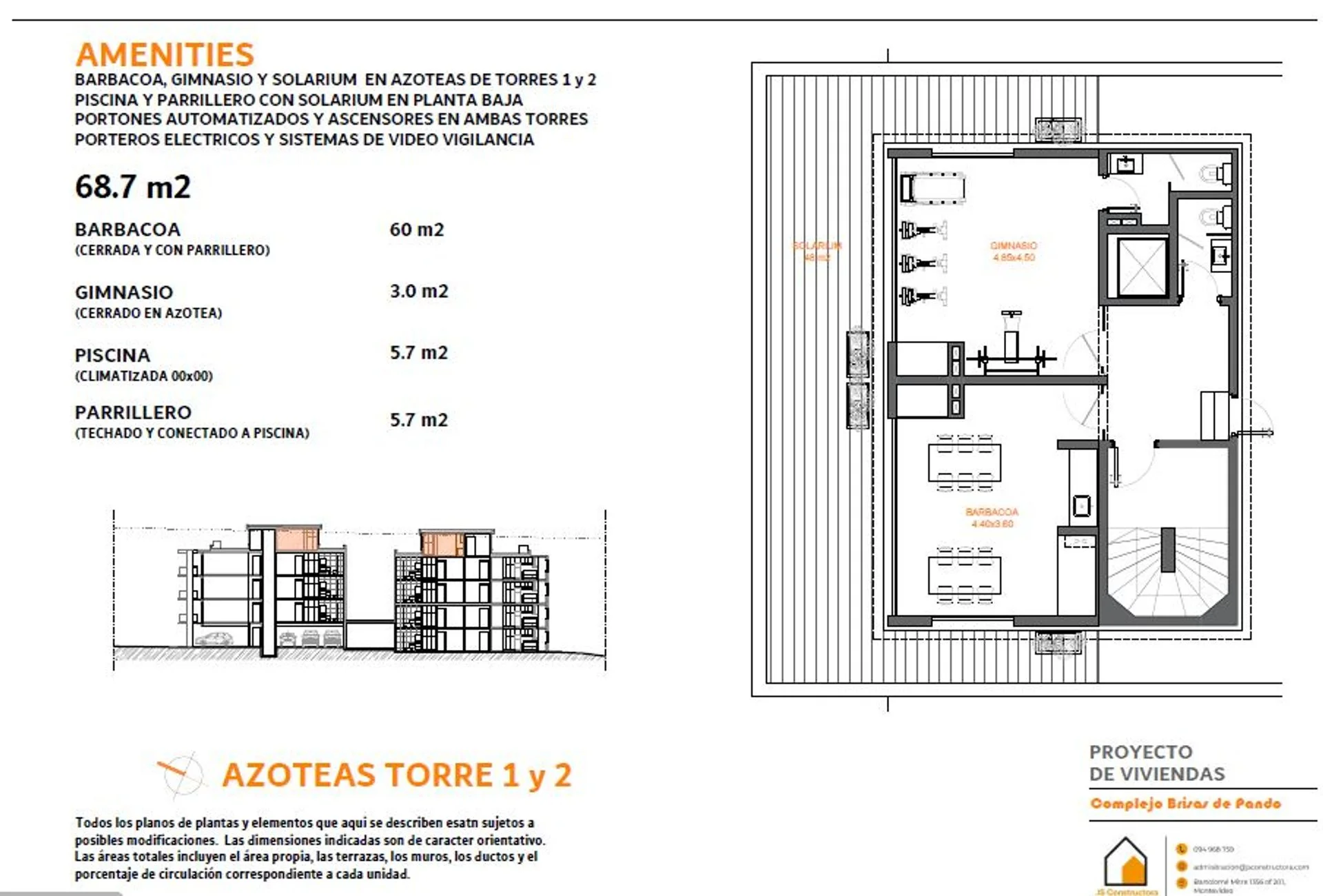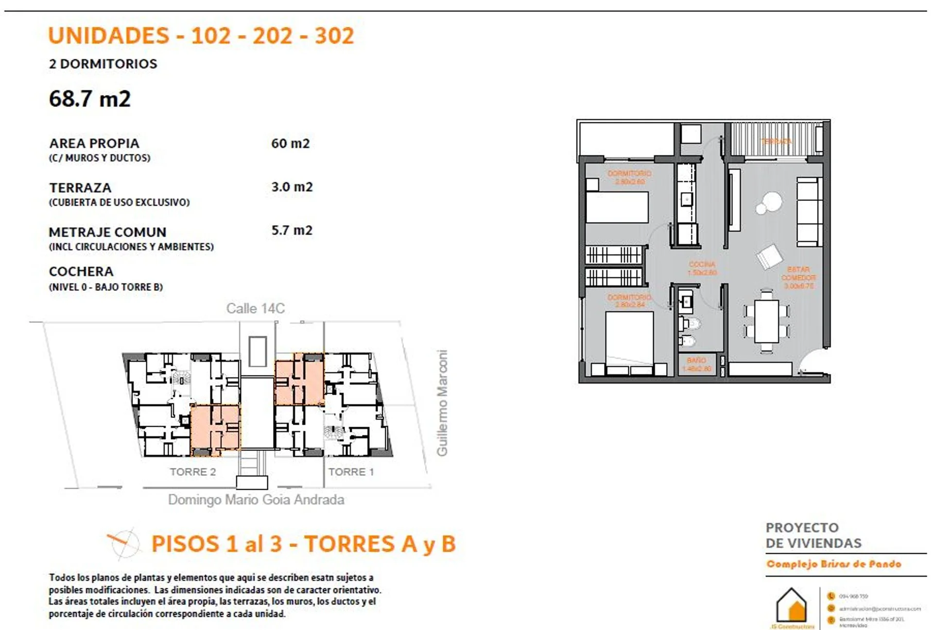 Corredor Responsable: - Contacto: Patricia Luján Hauser Debra Se vende apartamento en complejo Brisas de Pando. El proyecto se encuentra en una zona de ambiente despejado, natural y tranquilo de la ciudad de Pando a pocas cuadras del centro y con conexión directa a los accesos que llevan a Montevideo y la zona este. La venta se realiza de forma exclusiva y en pozo con fecha de entrega estimada a fines de 2027 e inicio de obra en 2026 bajo ley de vivienda promovida que exonera del ITP en la compra e IVA. También exonera al inversor de pagar IRPF durante 10 años por alquiler de la unidad. El complejo consta de dos torres de edificio de 3 pisos con 28 apartamentos de 1 y 2 dormitorios. Es de construcción tradicional con finas terminaciones. En planta baja se encuentran las cocheras en el bloque B y 4 apartamentos con patio y cochera en el A que se destacan por su distribución y tamaño. En los 3 pisos superiores hay 4 apartamentos por bloque. La piscina con solarium y el parrillero cerrado se encuentran en planta baja entre las dos torres para fácil acceso. Cada edificio cuenta con ascensor propio, portones automatizados y el predio está cerrado con circuito de videovigilancia. Ambas azoteas tienen barbacoa, gimnasio y solarium. Gastos comunes aproximados $4.000. La unidad B302 se encuentra en el piso más alto de la torre B lo que le da una amplia vista, iluminación y ventilación. Tiene 2 dormitorios, living, comedor, cocina definida, baño y lavadero distribuidos en 60 m². También cuenta con una terraza exclusiva de 3 m². Se destacan terminaciones como los pisos de porcelanato, las aberturas de aluminio, cortinas de enrollar en dormitorios, mesadas de granito, artefactos de loza y grifería de primera calidad. Precio promocional contado: U$S 108.900.- Precio promocional con entrega inicial del 20% y luego un año y medio por avance de obra: U$S 119.000.- Cocheras: U$S 3.000.- Gastos de ocupación 3% Consulte por otras unidades. Compartimos con todos los colegas. Comisión inmobiliaria 3% más IVA. Cada Oficina es de propiedad, gestión y desarrollo independiente La presente publicación describe las características esenciales del inmueble, debiéndose consultar al responsable de la operación por la eventual actualización de las medidas, descripciones arquitectónicas y funcionales, servicios, impuestos, precios y demás información, cuyos valores son aproximados.