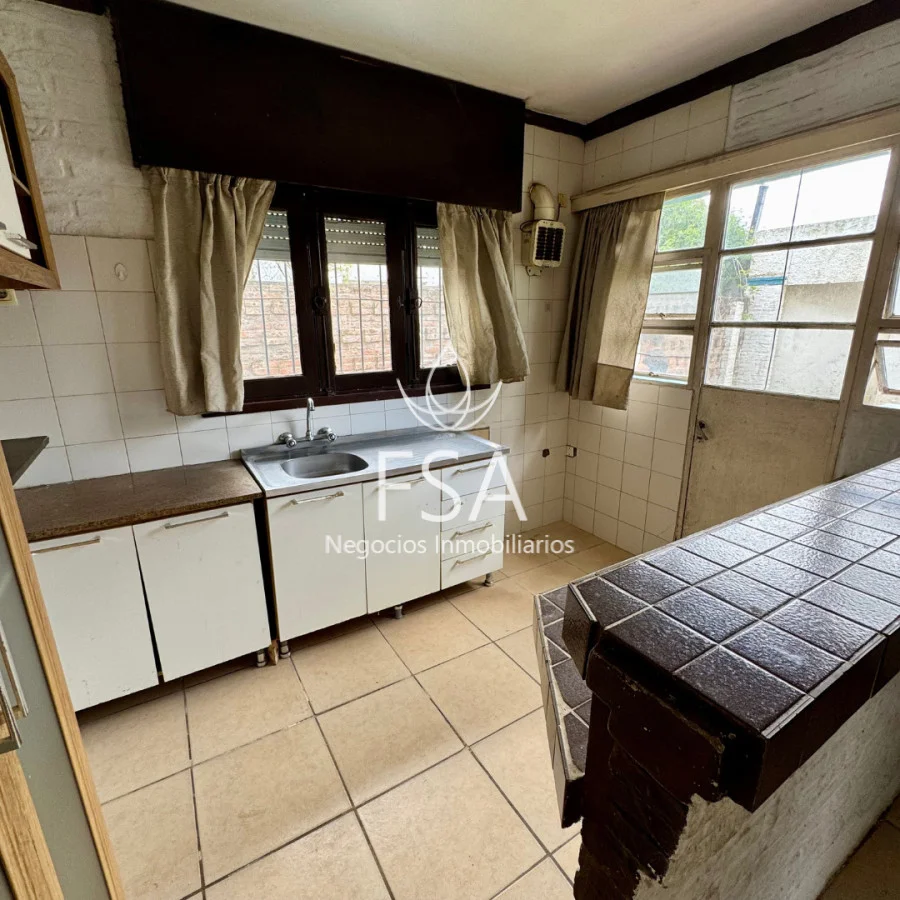 - Cocina integrada con muebles aéreos y bajo mesada y puerta hacia el fondo.
