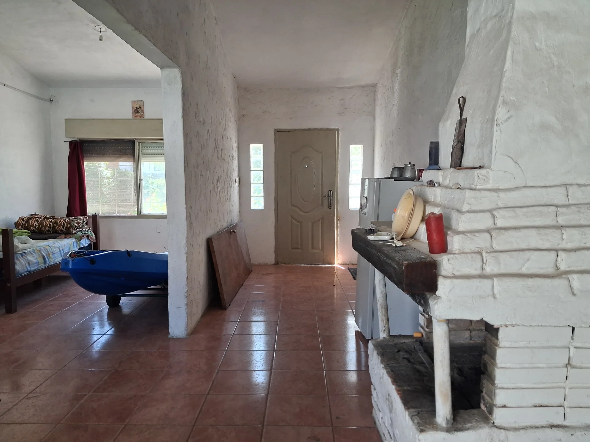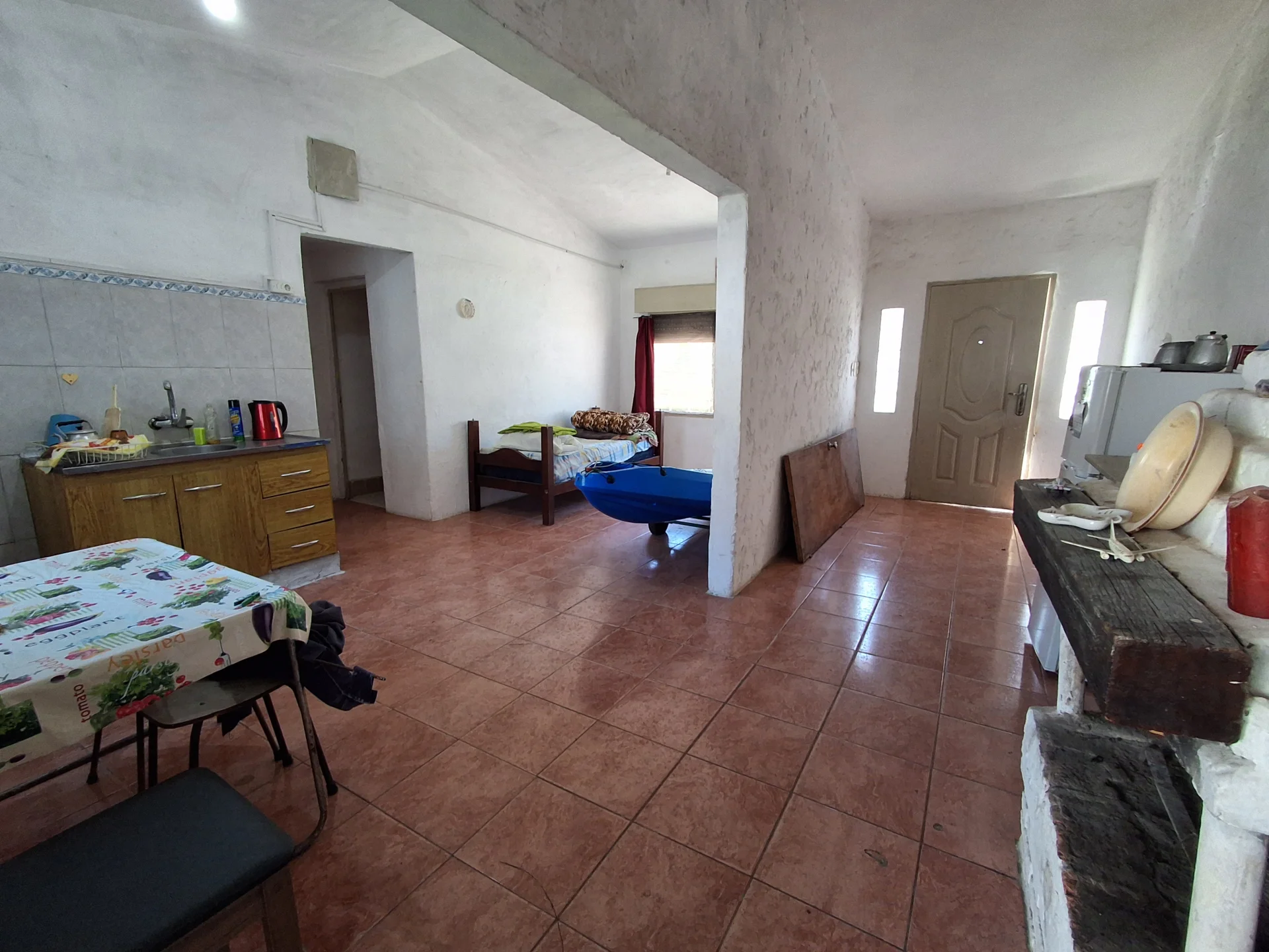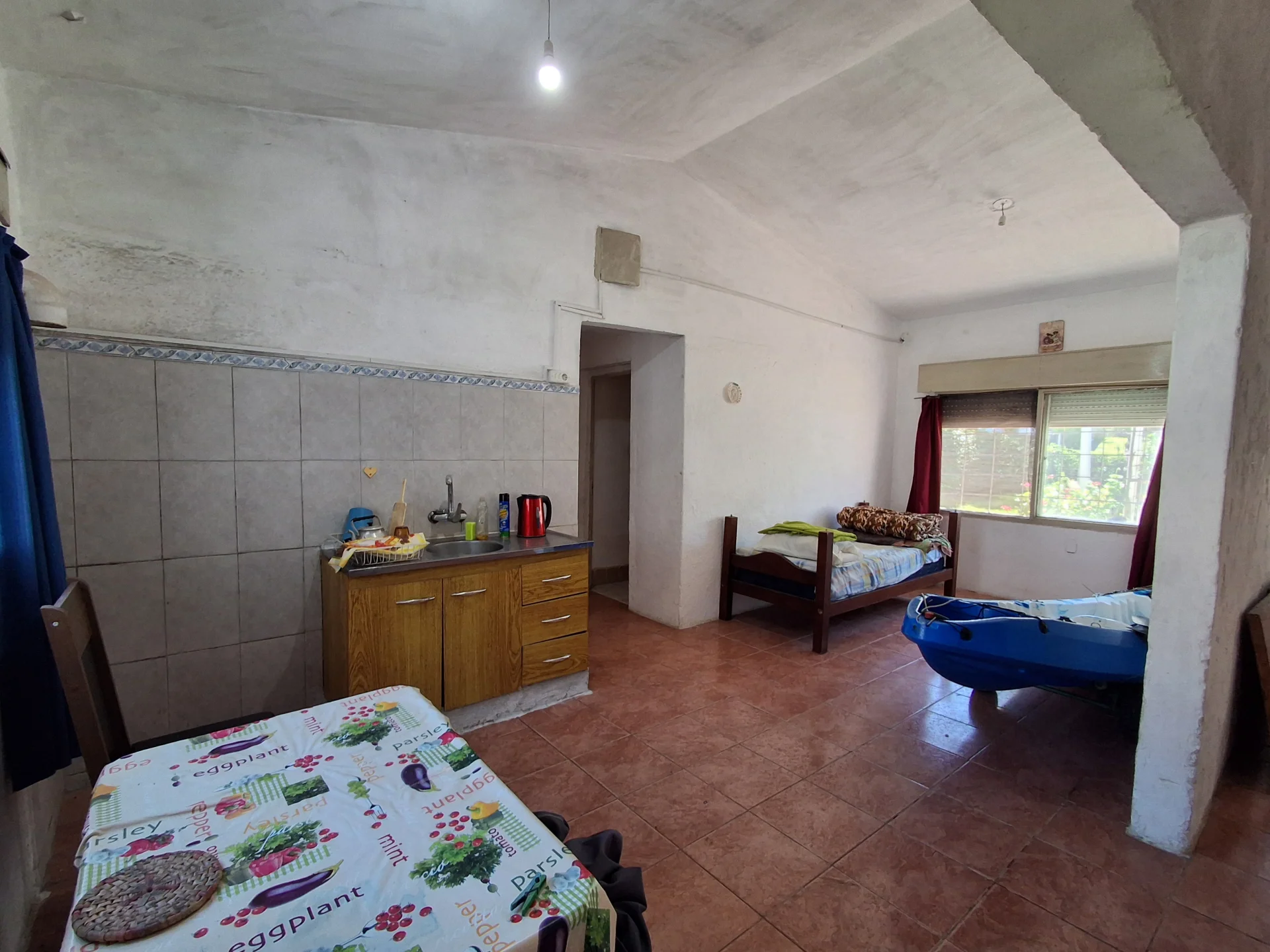 Living-comedor con cocina integrada y estufa a leña. Posible tercer dormitorio, cerrando una pared.