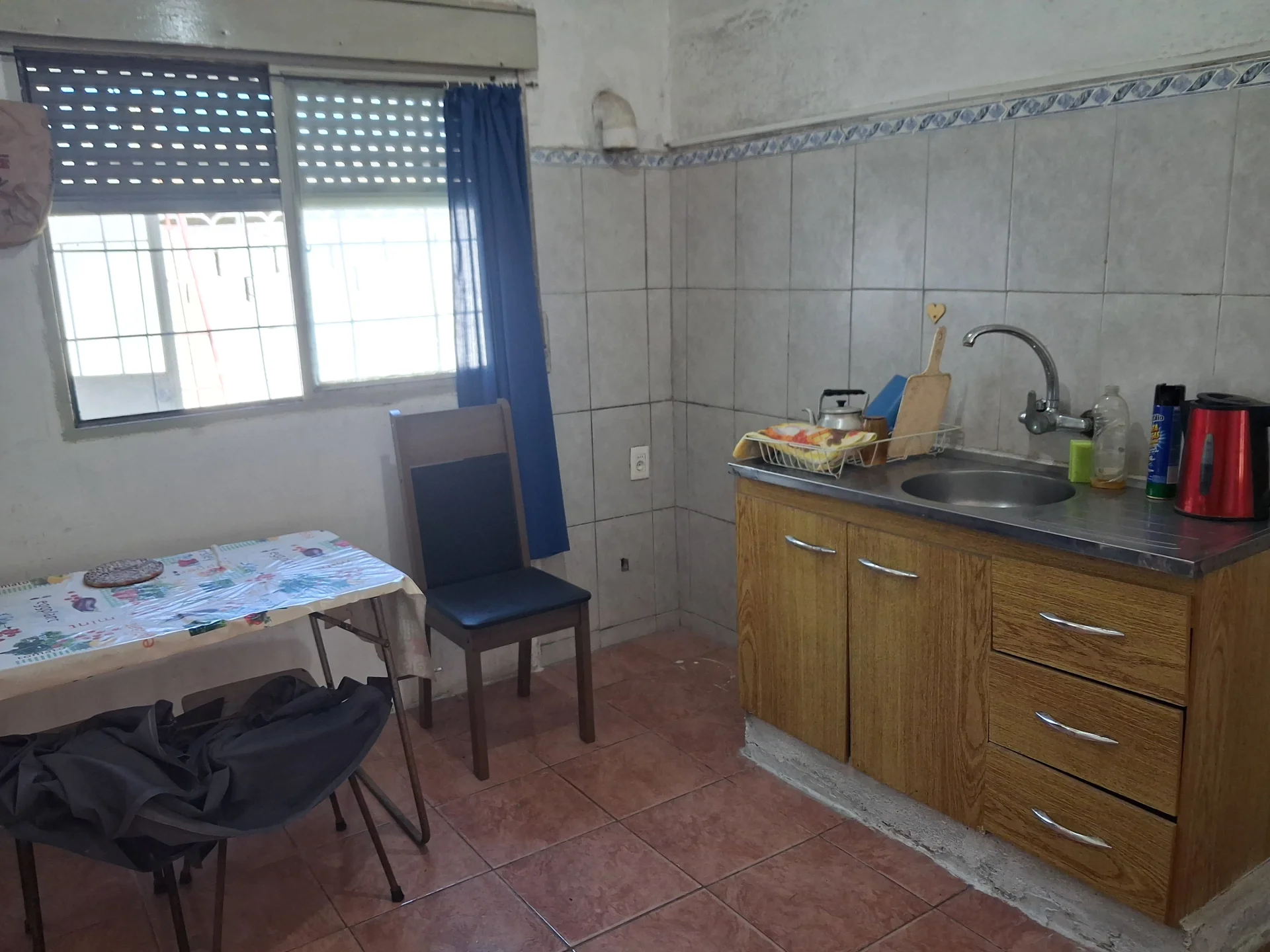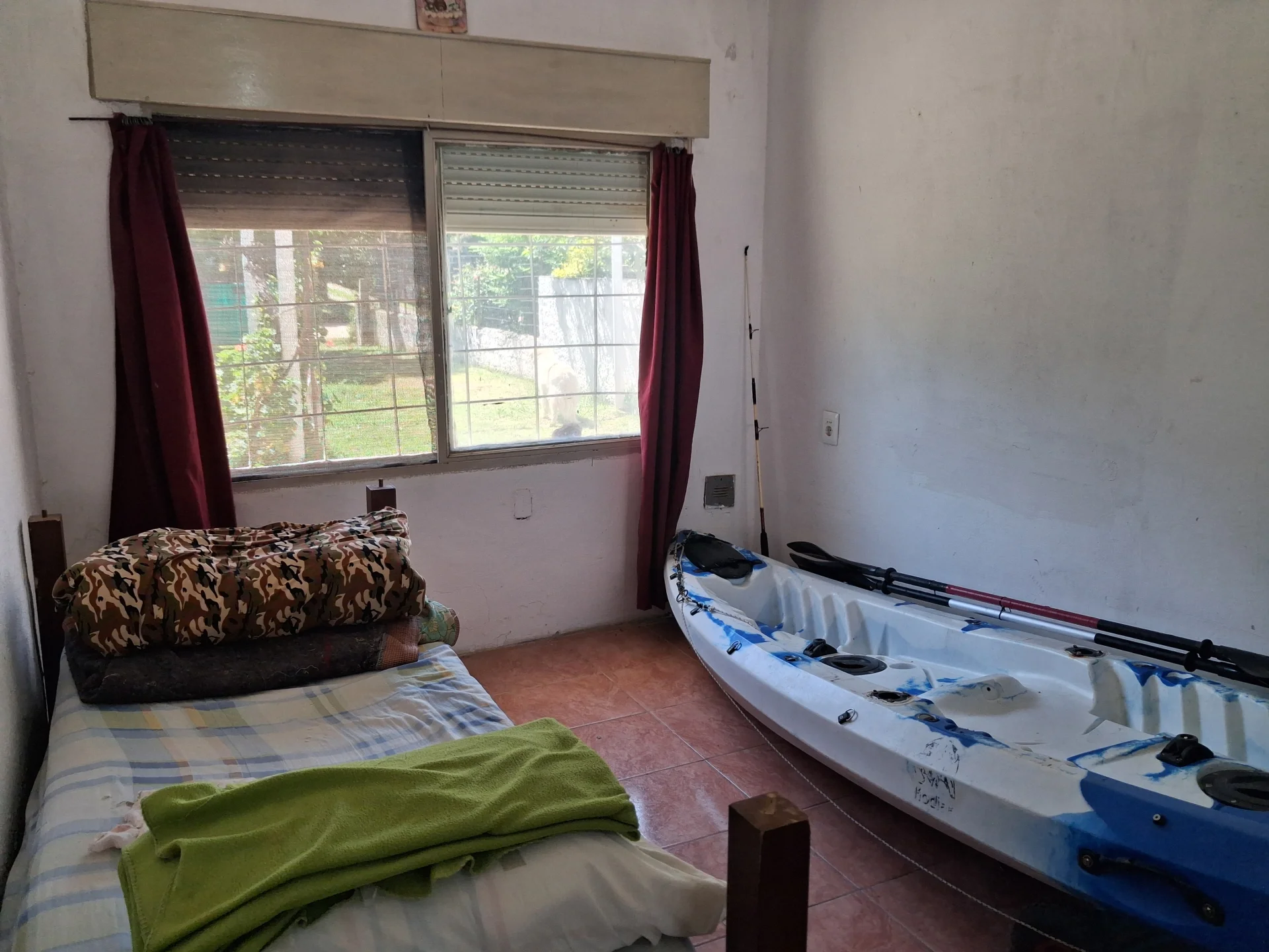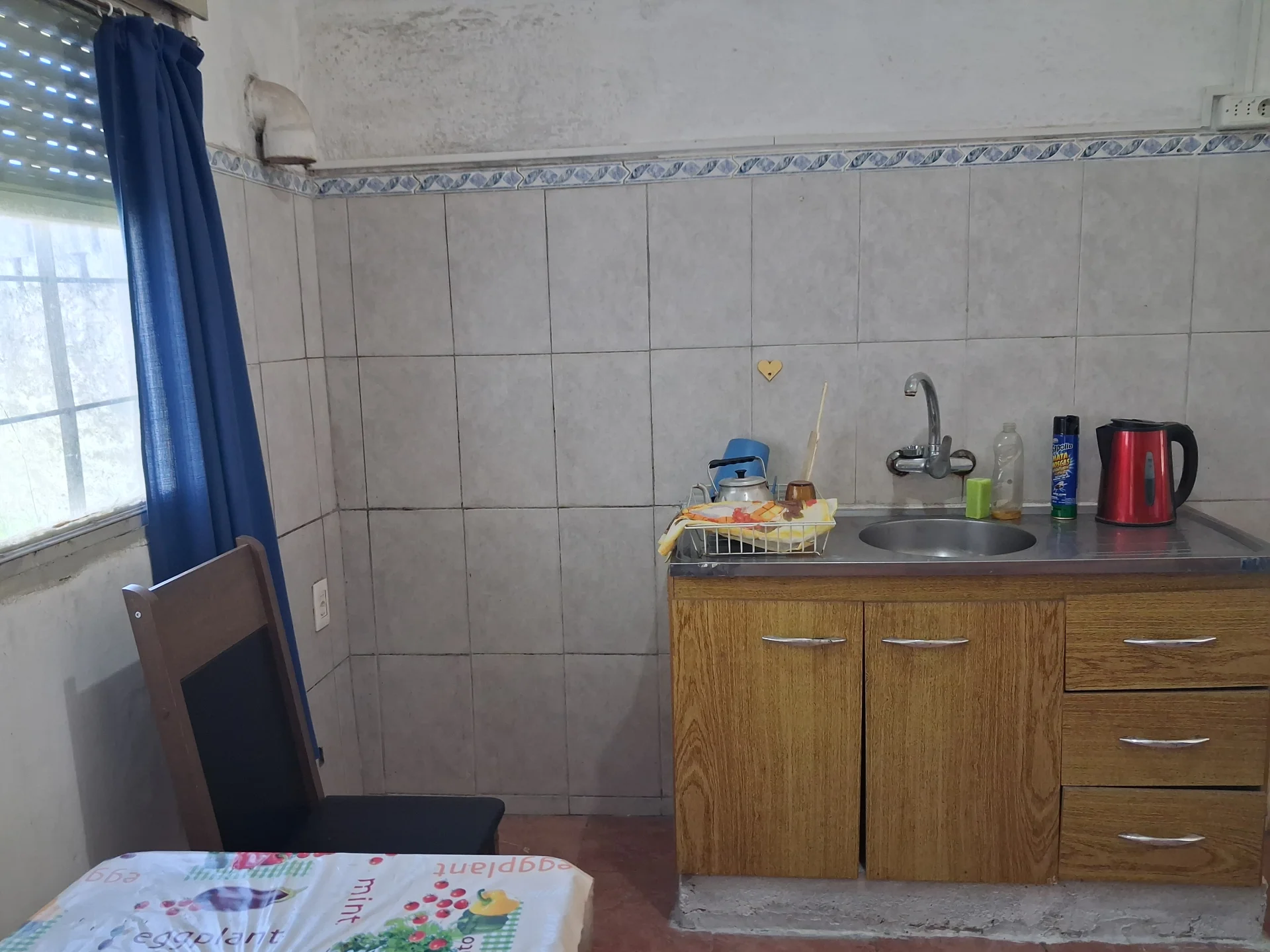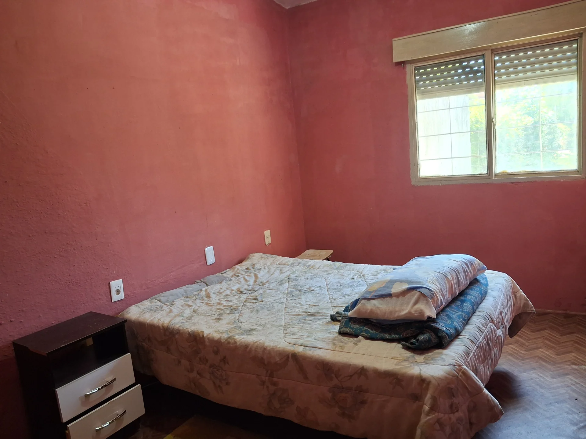 Living-comedor con cocina integrada y estufa a leña. Posible tercer dormitorio, cerrando una pared.