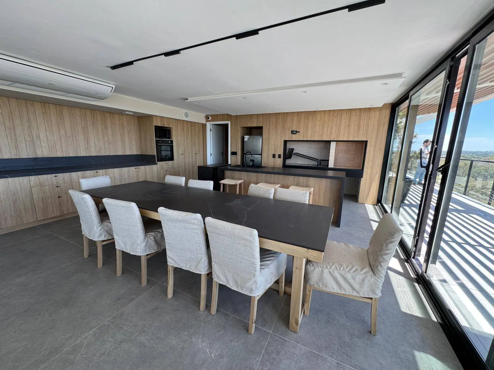 integrada a un amplio living comedor con excelentes vistas al Parque Roosevelt y salida a un balcon. Cortinas en todas las ventanas.