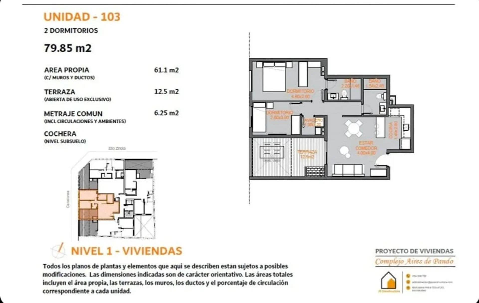 Corredor Responsable: - Contacto: Mónica Aidinovich Se vende apartamento 2 dormitorios en Aires Pando Venta en exclusividad, apartamento en pozo, complejo Aires de Pando. Ubicado a tan solo 4 cuadras del centro de Pando y a 3 cuadras de la Ruta N° 8, en un punto estratégico de la ciudad con fácil acceso y egreso tanto hacia Montevideo, como hacia el este. El complejo Aires de Pando comienza sus obras el próximo año 2026, tiene fecha prevista de entrega a fines del año 2027, es una torre con 2 locales comerciales y 20 apartamentos de uno, dos y tres dormitorios,ascensor, cocheras en planta baja, subsuelo y barbacoa con solarium en el roof top. Excelentes terminaciones, construcción tradicional, ley de vivienda promovida que exonera del ITP en la compra, IVA y Patrimonio de corresponder y también exonera al inversor de pagar IRPF sobre el alquiler durante 10 años, todo esto lo hace atractivo para invertir en pozo y adquirir estas unidades a un precio super promocional, gran rentabilidad sobre la inversión, en un producto único. La unidad 103 se ubica sobre calle Manuel Oribe (ex Canelones), sus vistas permitirán disfrutar de hermosos atardeceres con gran vista despejada, cuenta con 61m² propios de apartamento( living con cocina semi integrada mediante barra, lavadero, baño, vestidor y dos dormitorios) con gran terraza de 12.5m² y parrillero propio. Precio promocional contado U$S 118.250.- Precio promocional entregando el 20% y luego por avance de obra durante el año y medio de la misma U$S 132.750.- Precio de lista al finalizar la obra U$S 158.000.- Cocheras U$S 6.000.- cada una Gastos de ocupación 3%, gastos comunes calculados en aproximadamente $ 3.000.- por mes. Consulte por otras unidades. Compartimos con todos los colegas Comisión inmobiliaria 3% más IVA. Cada Oficina es de propiedad, gestión y desarrollo independiente La presente publicación describe las características esenciales del inmueble, debiéndose consultar al responsable de la operación por la eventual actualización de las medidas, descripciones arquitectónicas y funcionales, servicios, impuestos, precios y demás información, cuyos valores son aproximados.