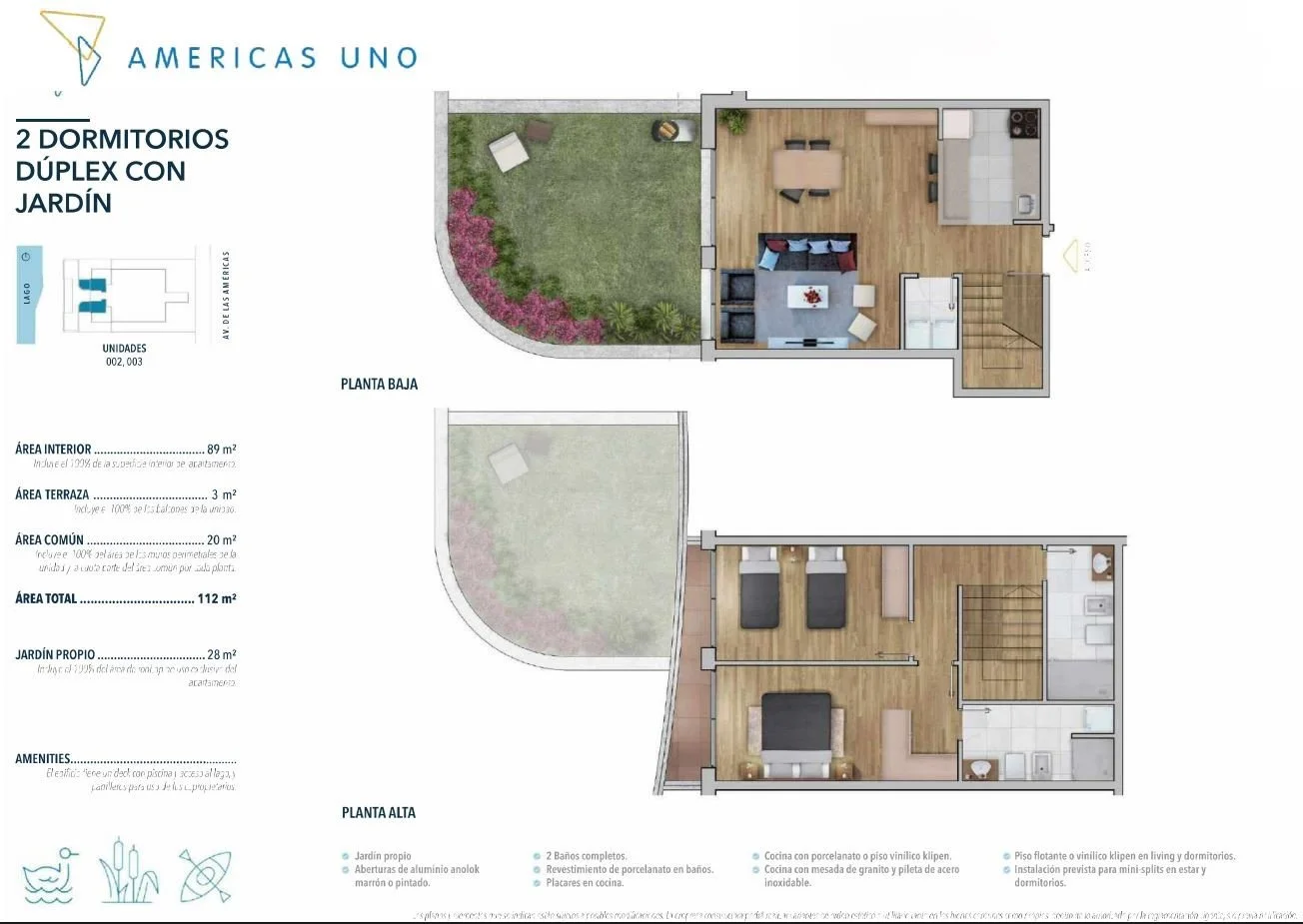Unidad dúplex en planta baja con orientación Oeste y vistas al lago. Dos dormitorios, el principal en suite, área de lavadero y jardín propio.