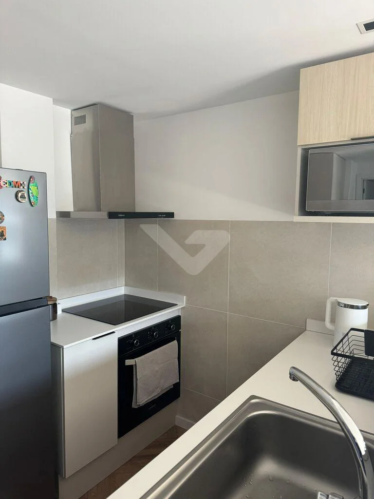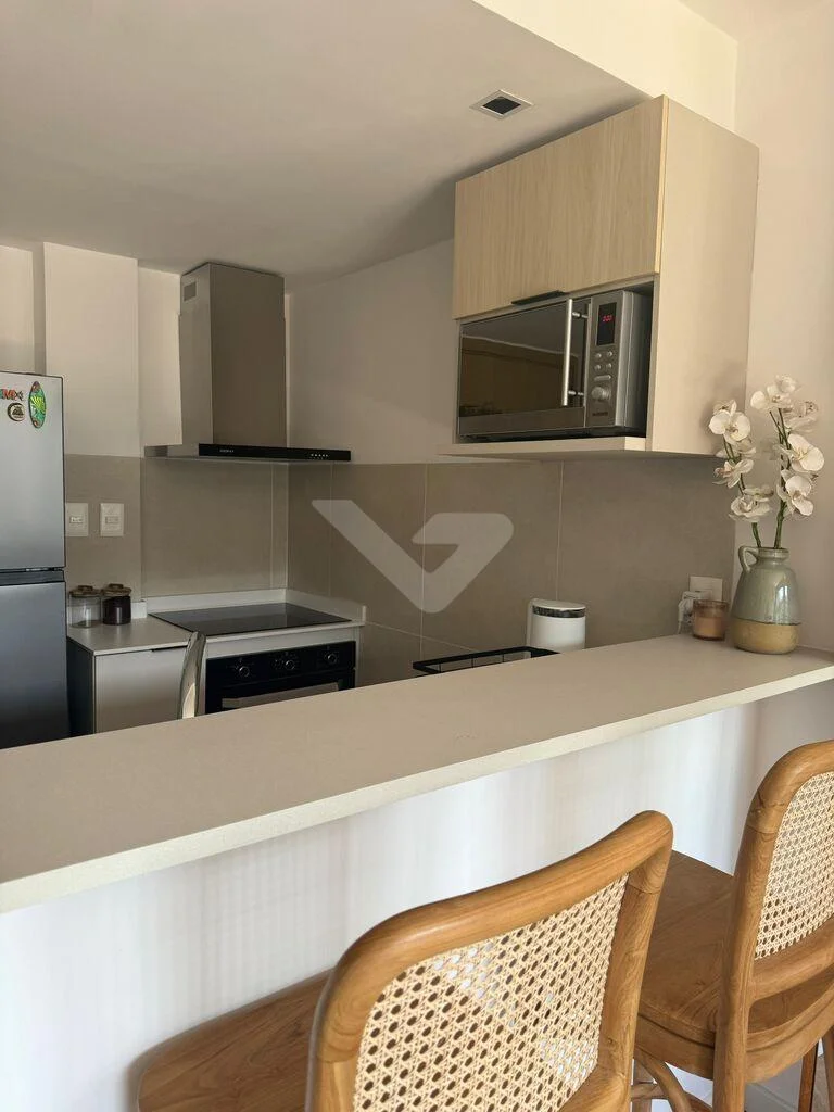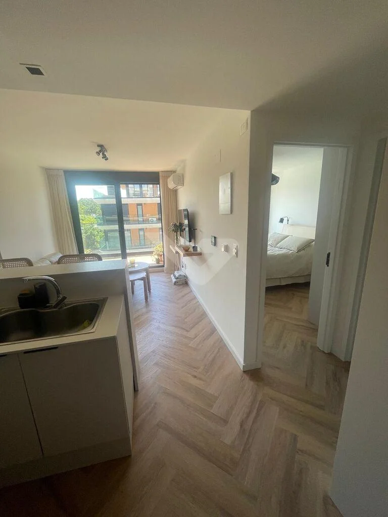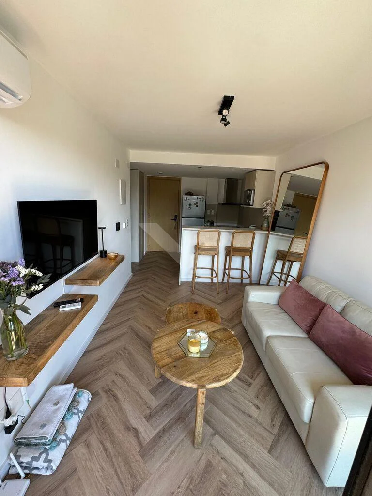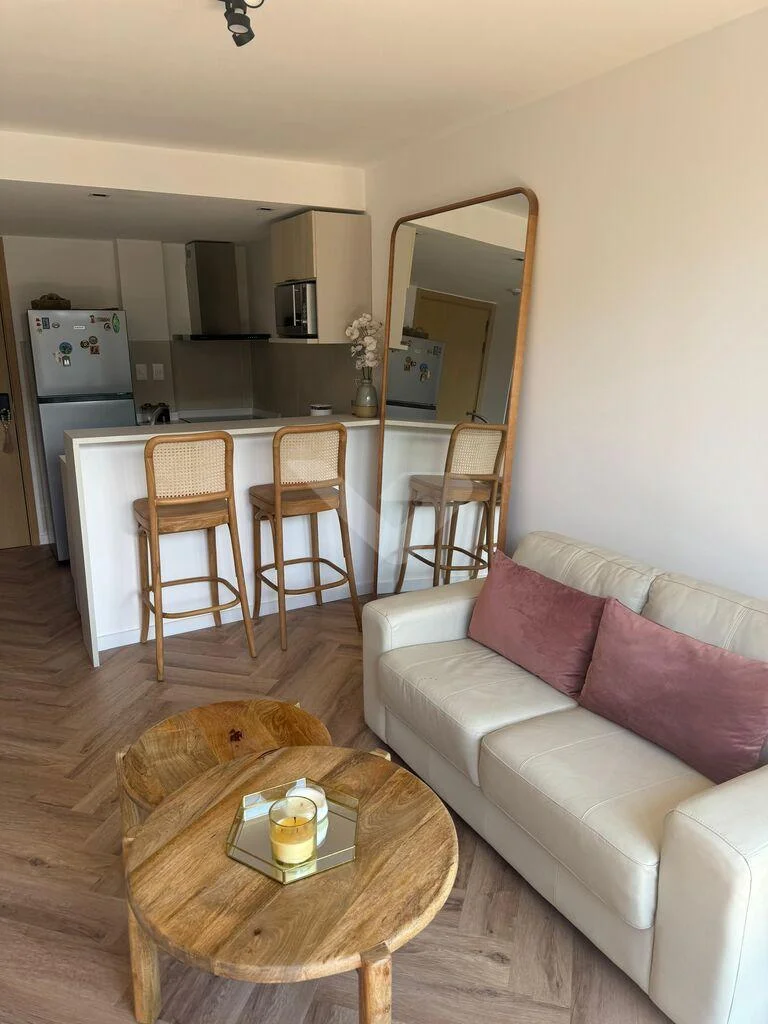 Living comedor integrado mediante barra a la cocina con horno, anafe y campana. Placard para calefón. Living comedor con aire acondicionado, y salida a terraza con gran luz.