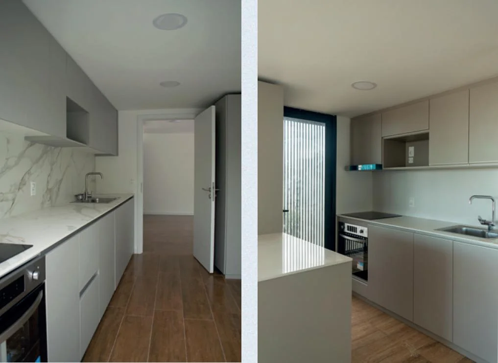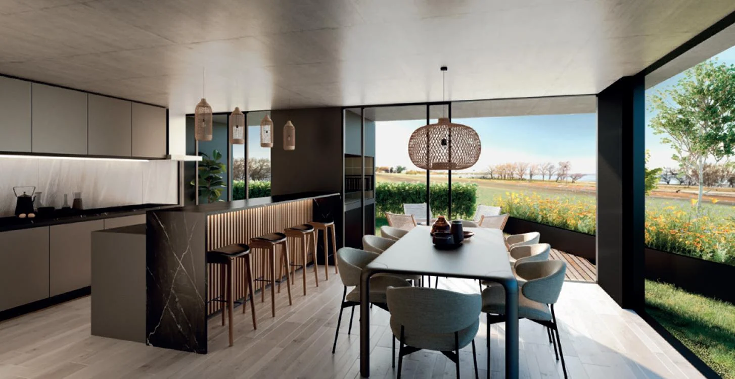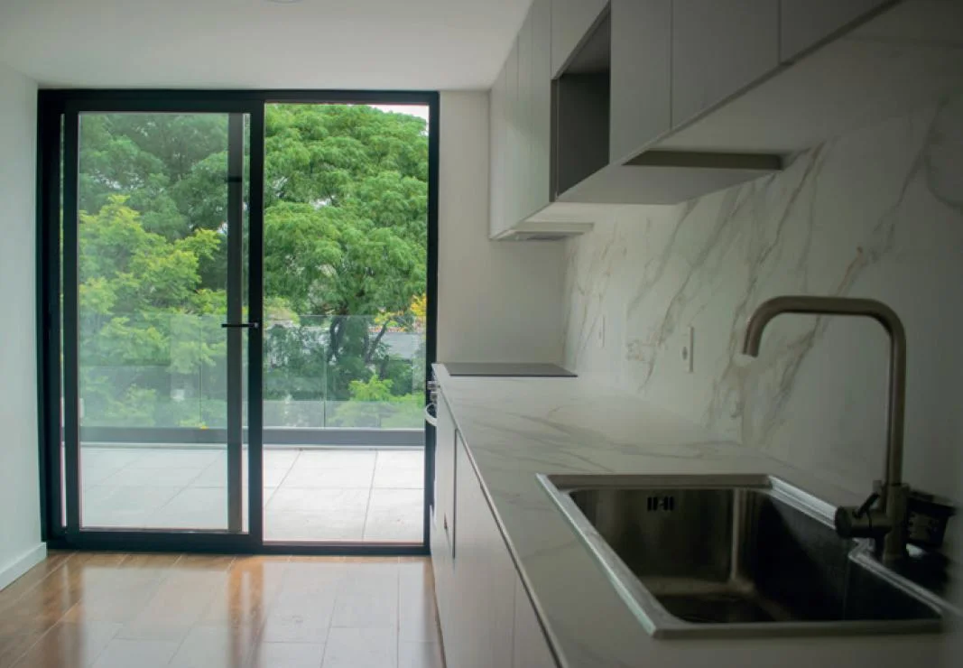 La cocina se entrega totalmente equipada con muebles bajo mesada y aéreos en líneas modulares, mesada de granito o similar con pileta de acero inoxidable, campana extractora de acero inoxidable con turbina, horno eléctrico y anafe ya instalados. Además, incluye termotanque, luminarias LED y extractor en baño.
