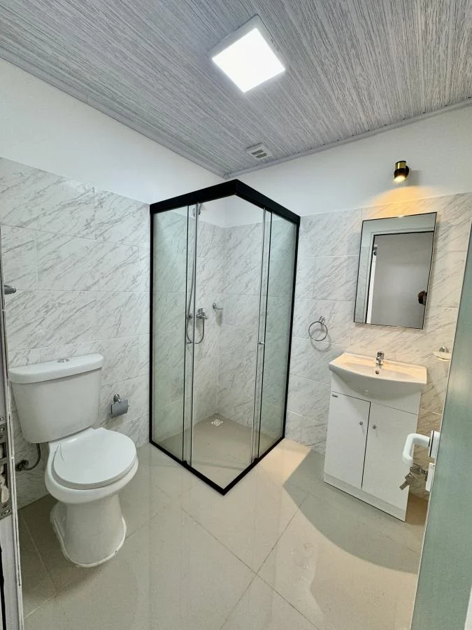 Baño completo con mampara, ofreciendo privacidad y comodidad.