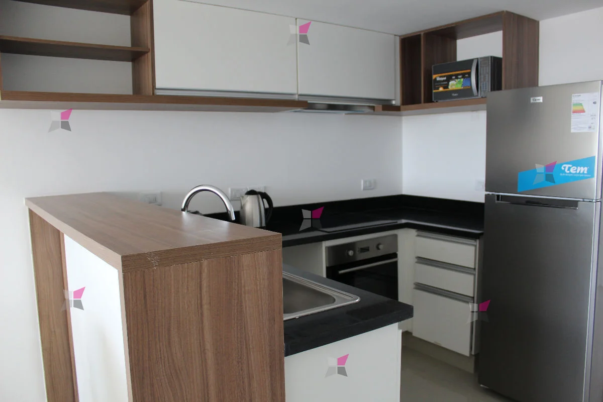 Cocina semi integrada con barra, living, comedor y balcón al frente.