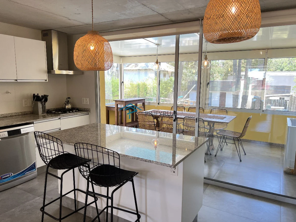 Planta baja: living comedor y cocina integrados, baño social, salida a jardín y piscina. Amplia galería techada con policarbonato en área parrilla.