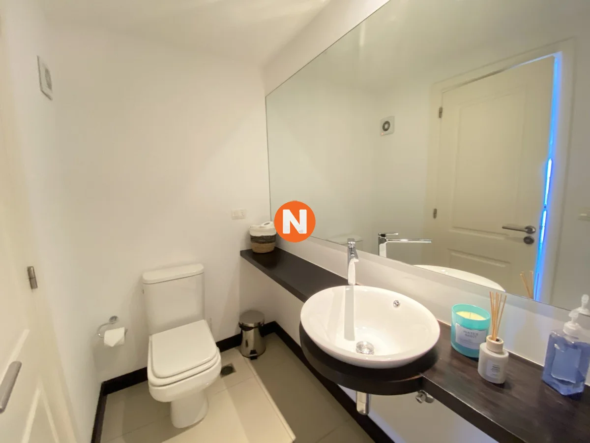 El apartamento también cuenta con un lavadero equipado con lavarropas y secarropas, y para tus momentos de relax, un hidromasaje. Para los amantes del fitness, el apartamento incluye acceso a aparatos de gimnasio. Además, el edificio ofrece una piscina y sauna para que disfrutes de tus momentos de ocio.