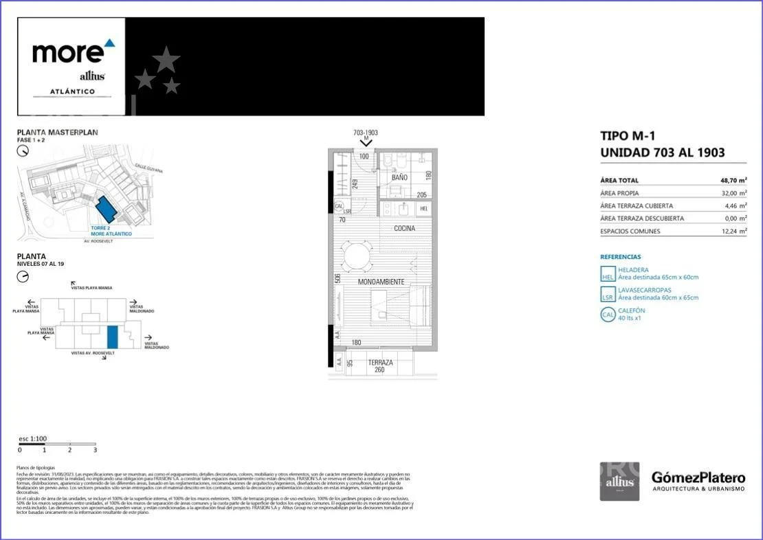 Monoambiente con terraza al frente, cocina integrada con placares, anafe eléctrico con 2 hornallas, horno empotrado eléctrico y campana de extracción. 1 baño completo con mueble bajo mesada.