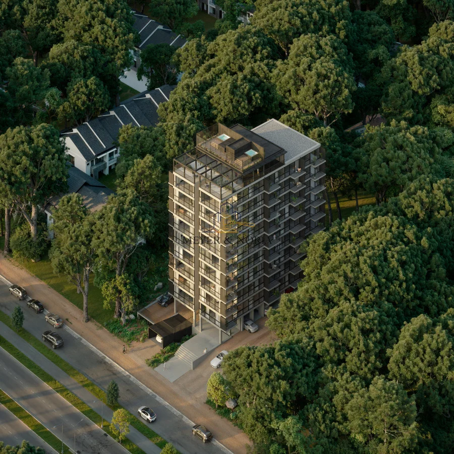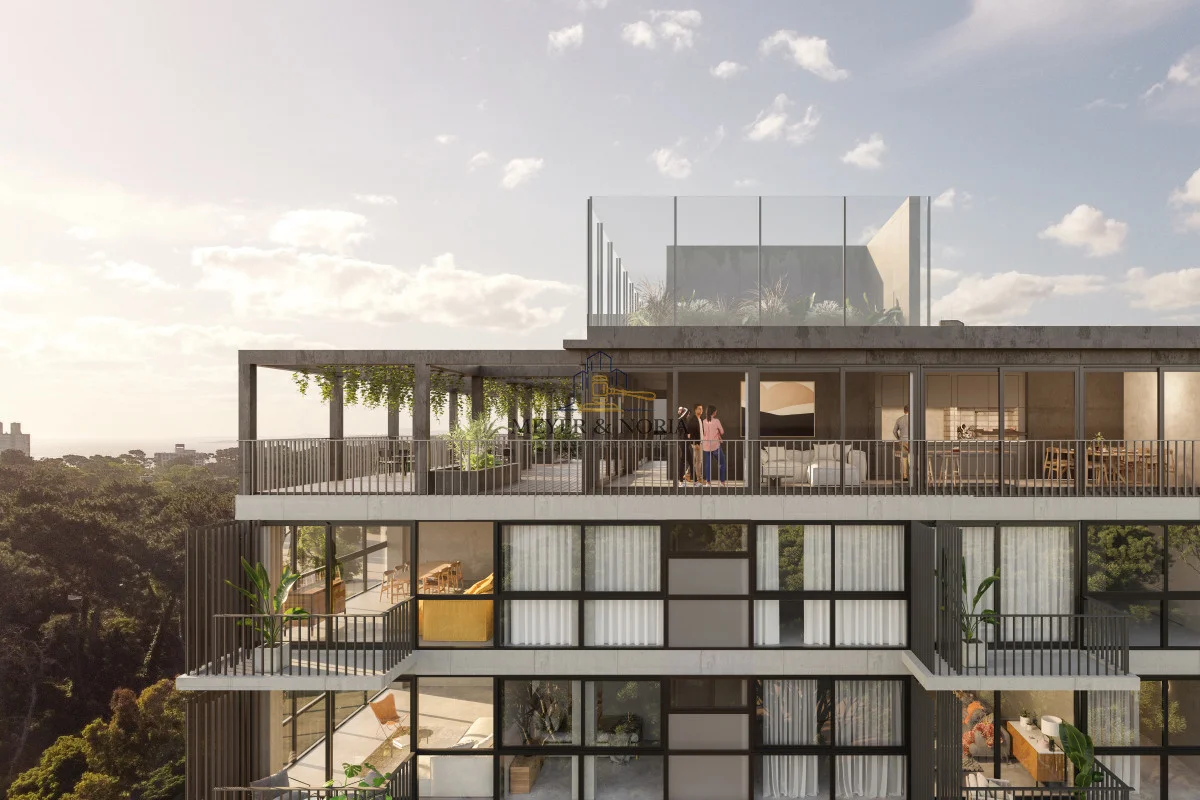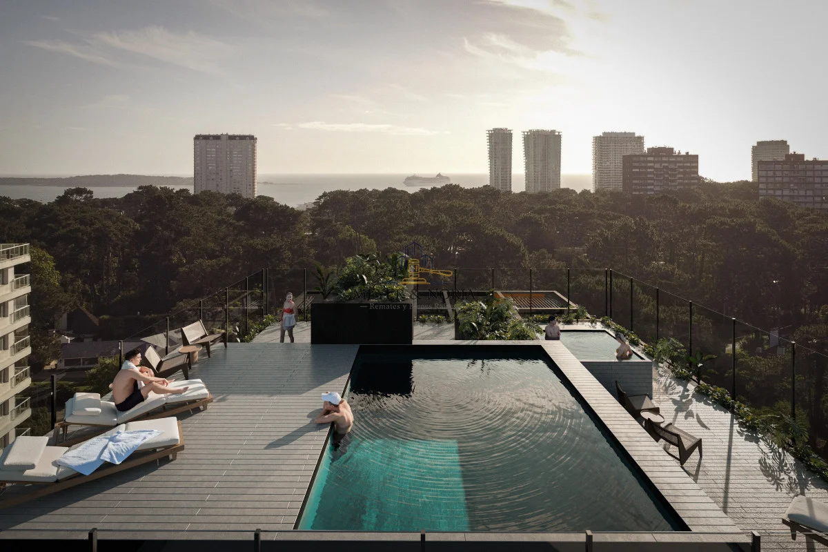 El acceso al edificio se realiza a través de una plaza con jardines y un café, piscina, estacionamiento para bicicletas, ascensores de última generación, dos parrilleros comunes con vistas increíbles, un espacio de coworking y una gran terraza mirador con jardines y pérgolas en 360°.