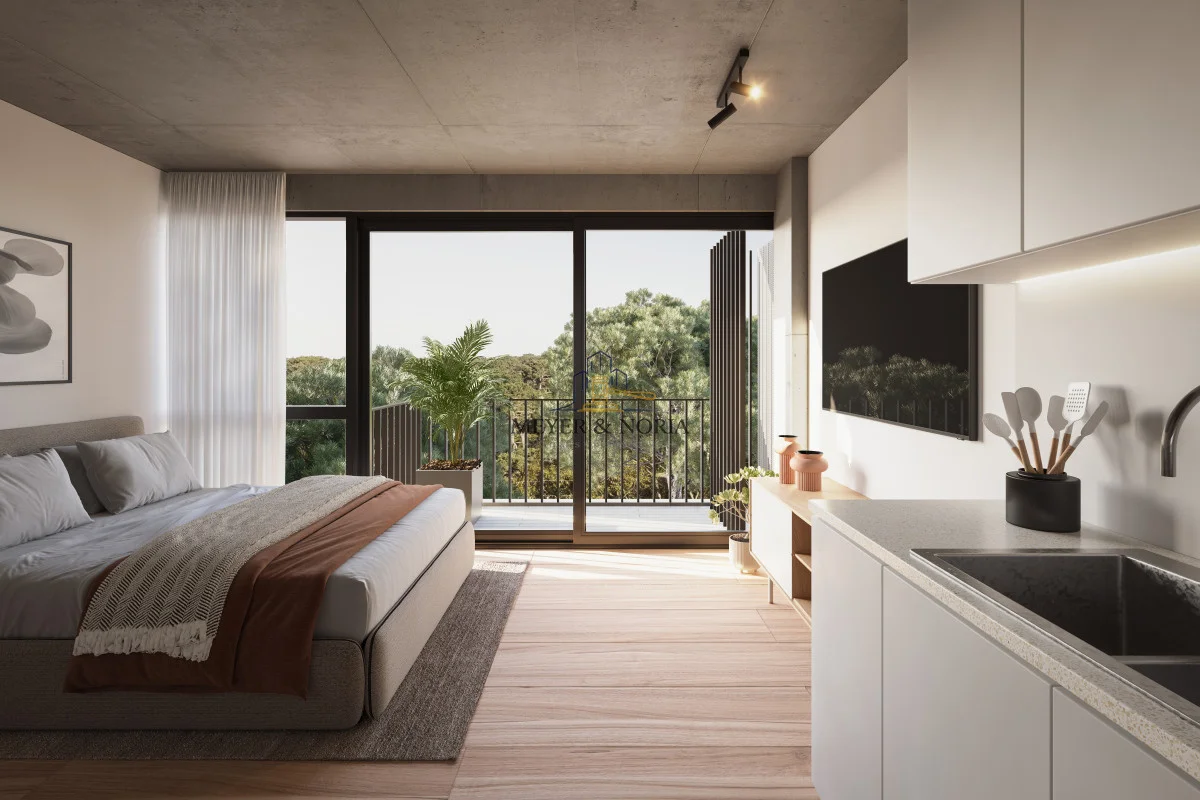 Terraza propi cubierta, ventanas de piso a techo y cocina integrada.