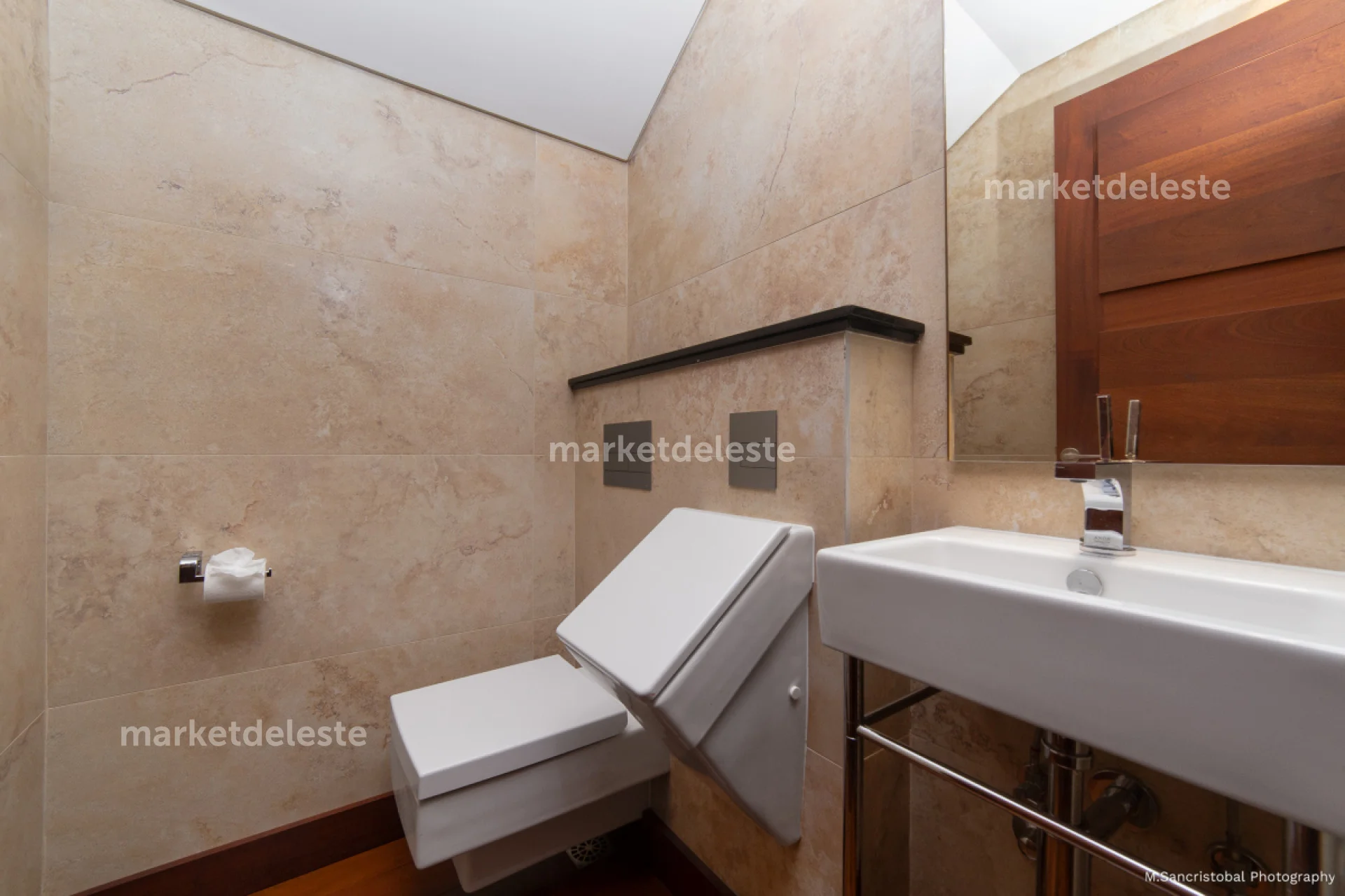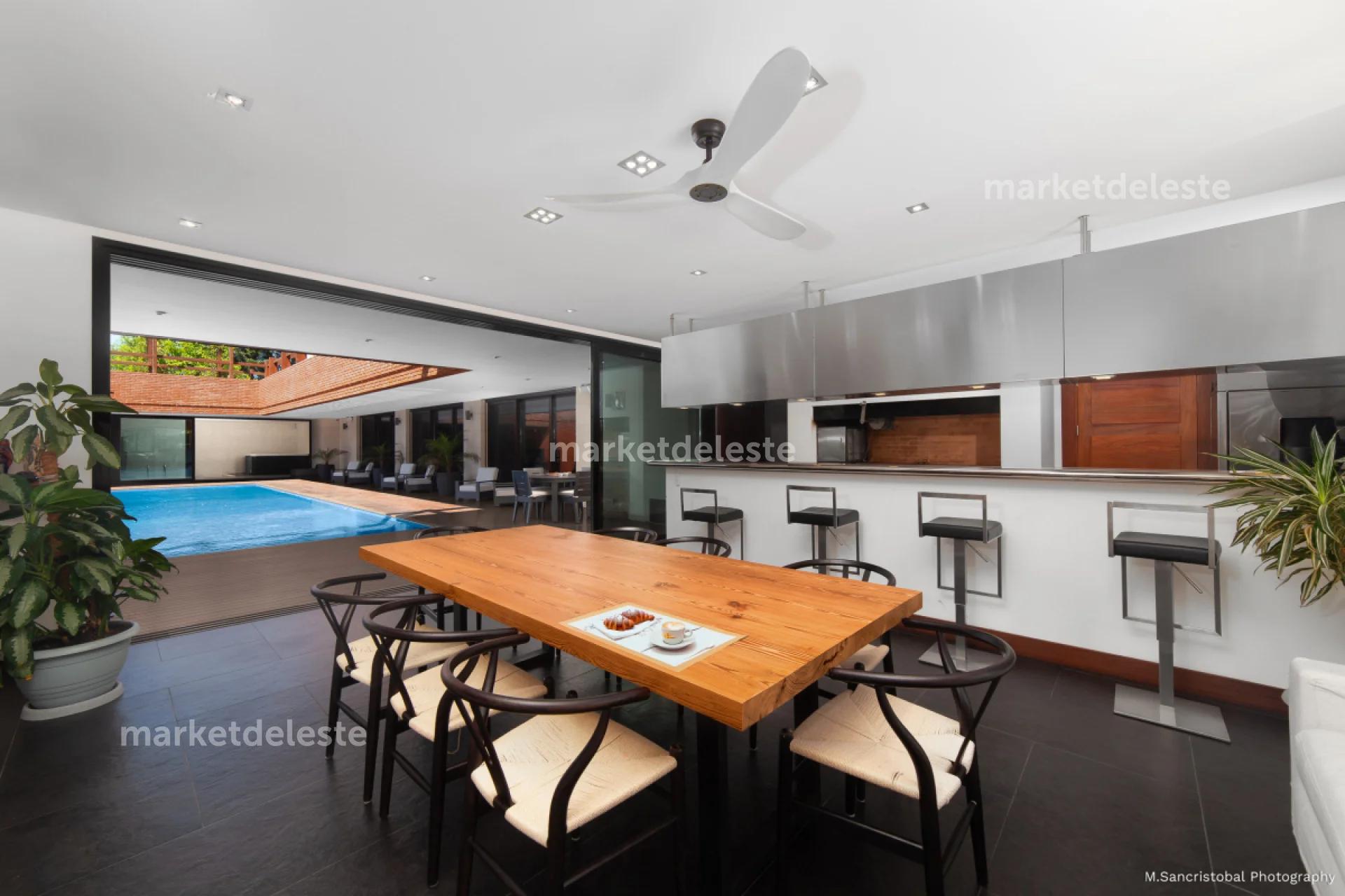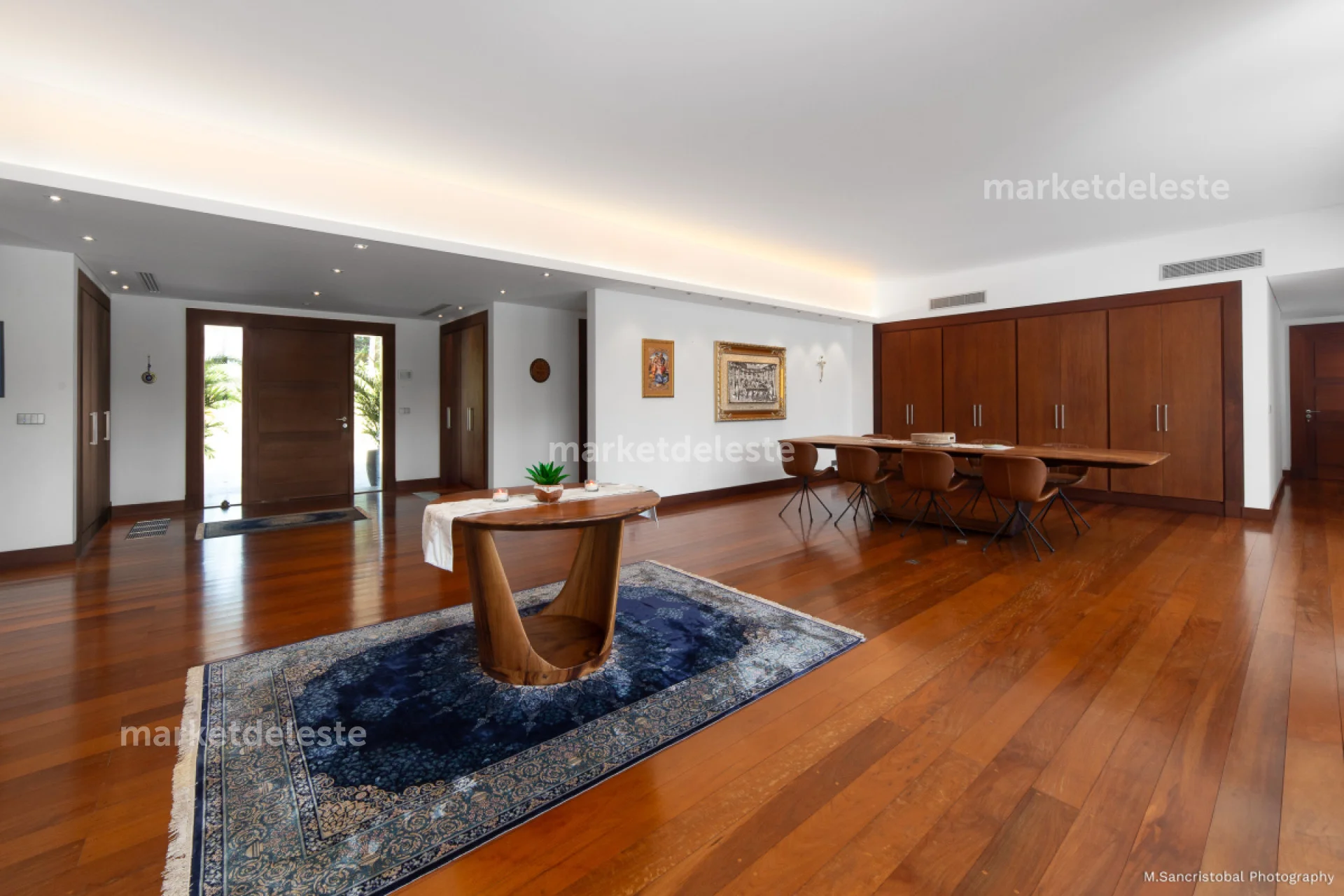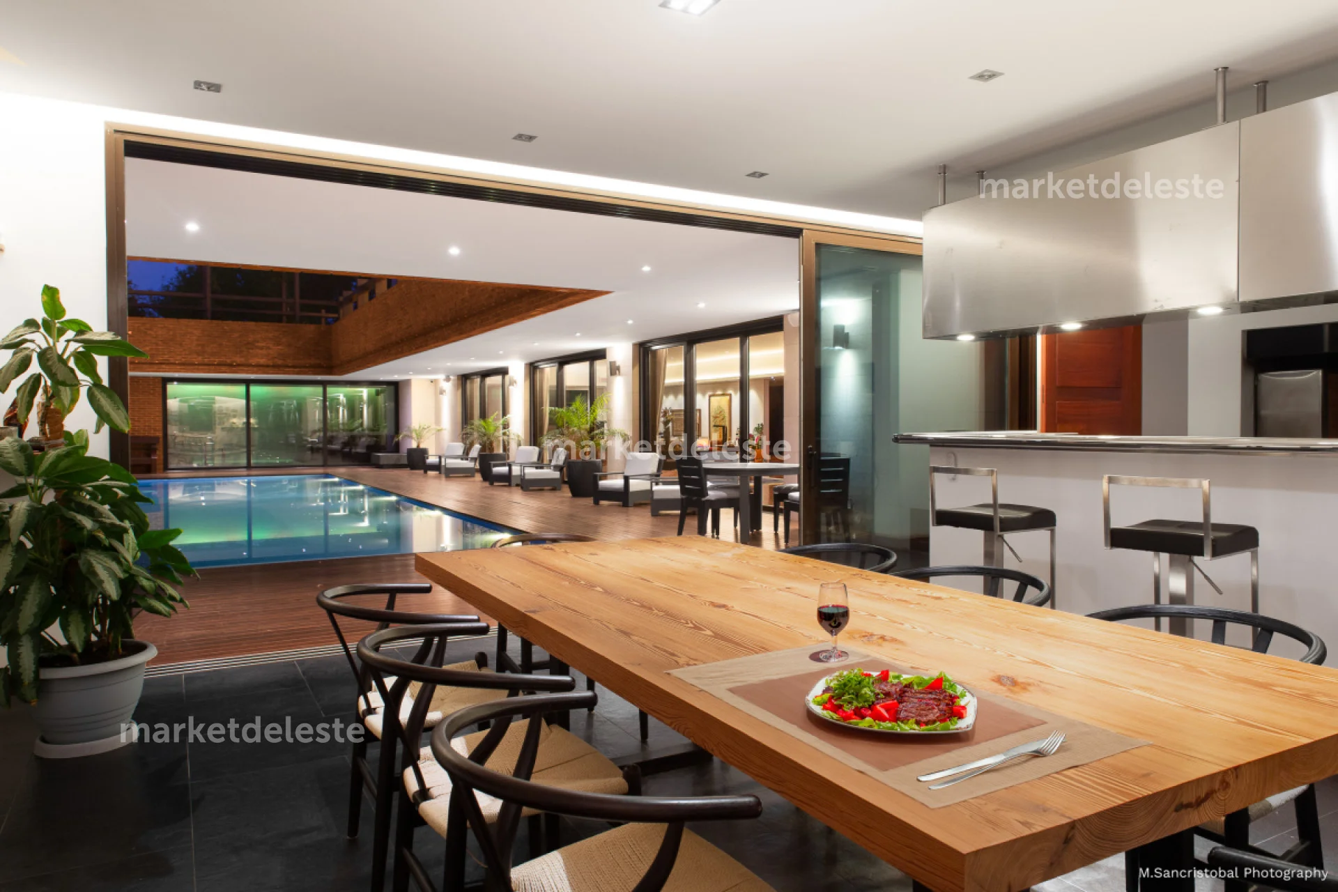 Desarrollada en dos niveles cuenta con un gran living comedor equipado con mobiliario importado a medida para cada espacio de la marca Restoration Hardware, alfombras traídas desde LA y detalles en cada centímetro, cocina industrial con cámara de frio, amplio laundry, playroom, estar tv, 2 office, home cinema, cava subterránea, piscinas abierta y cerrada climatizadas, jacuzzi, sauna húmedo, sauna seco, 4 garajes y 8 dormitorios en suite, Mastersuite con amplia terraza, barbacoa integrable al parque, toilette, vestuario para piscina y sala de maquinas.