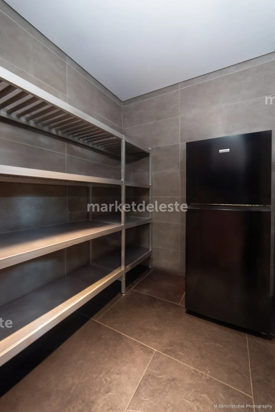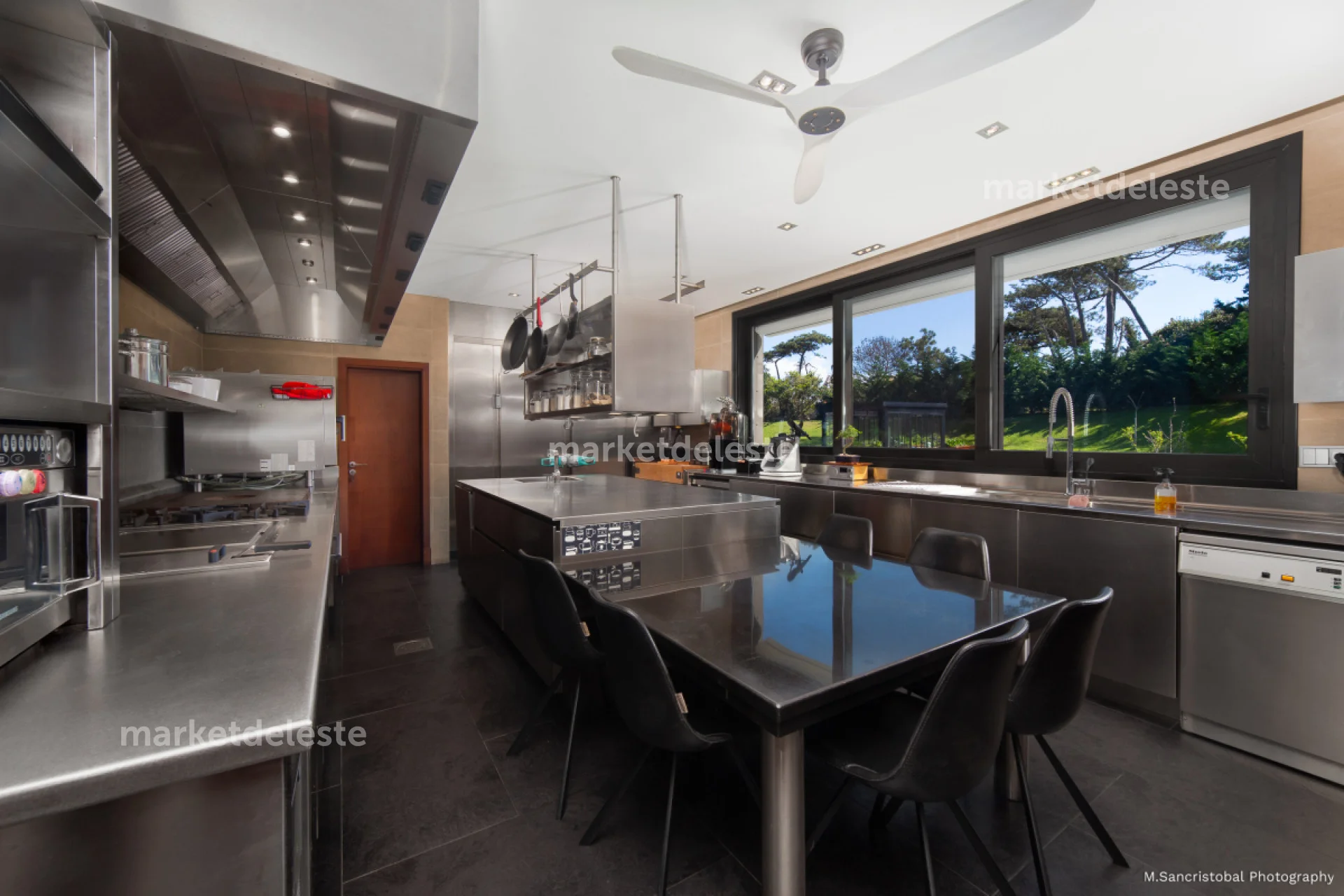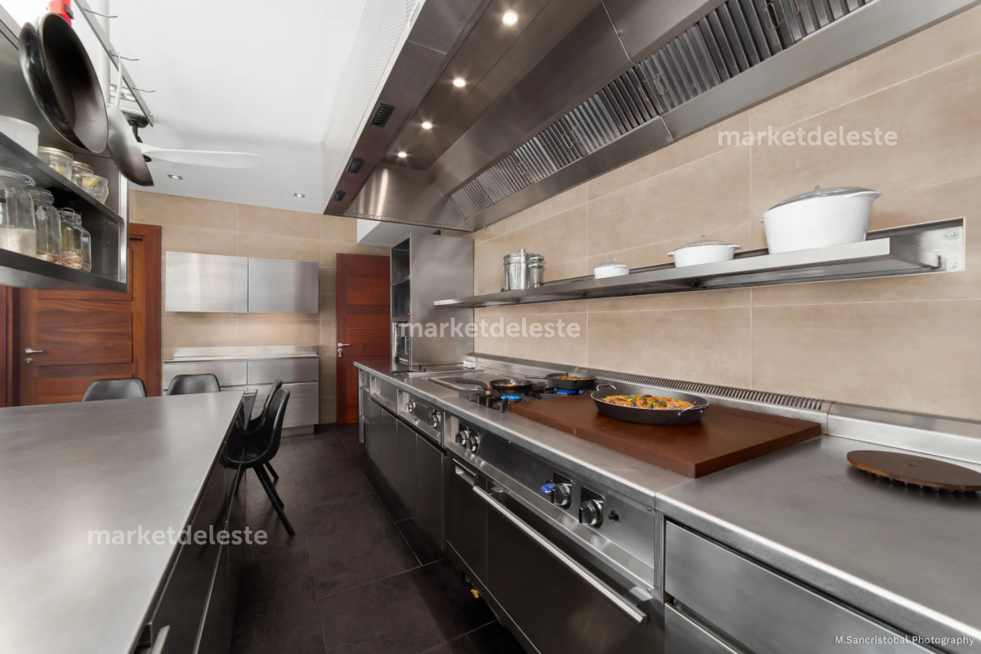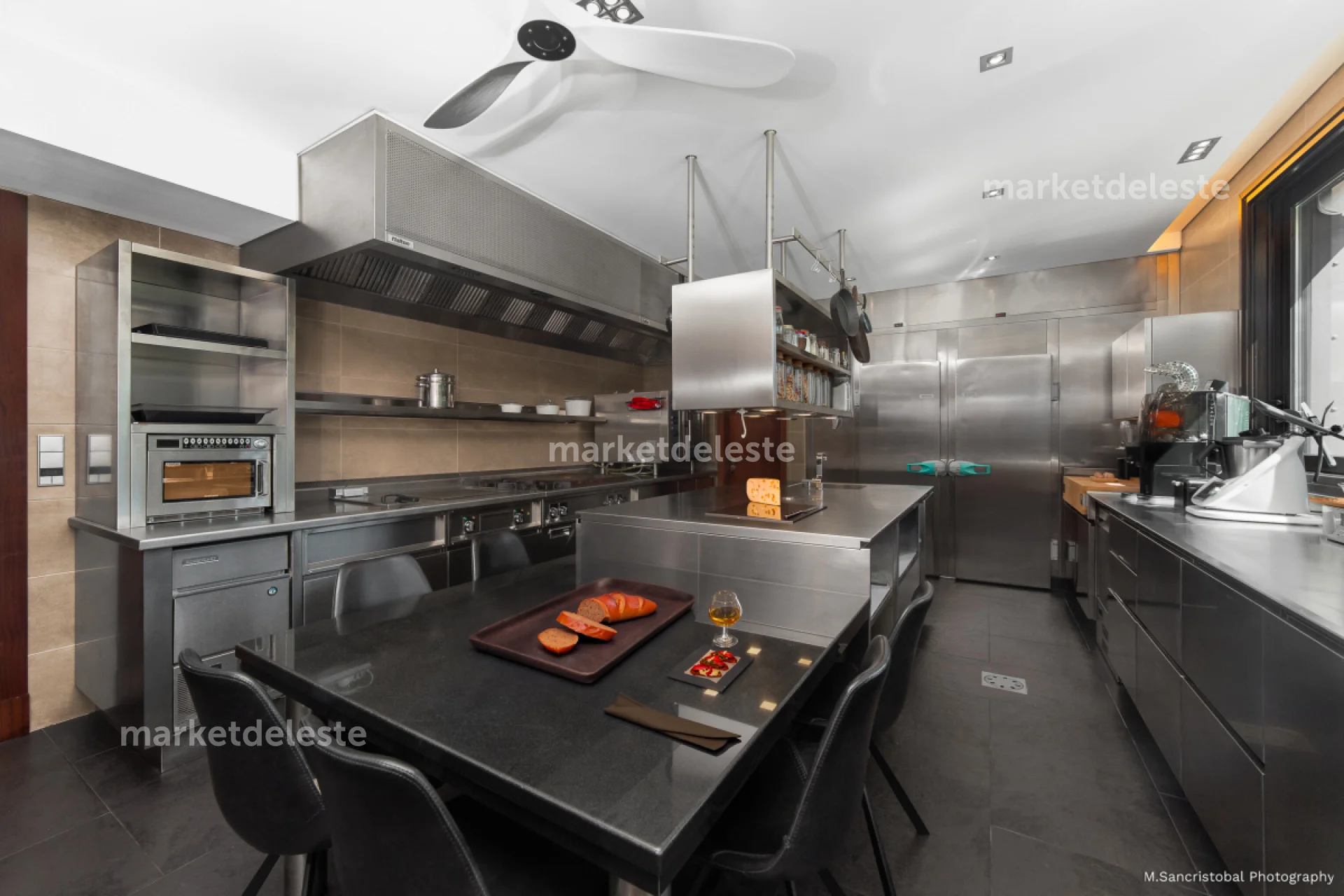 La cocina está totalmente equipada, cuenta con microondas de 1500W, freidora, hornalla para wok, 2 hornos eléctricos (uno industrial), 2 cámaras, enfría platos, máquina de hielo, 2 lavavajillas Miele, conexión trifásica y extracción profesional. Todo el equipamiento es en acero inoxidable.
