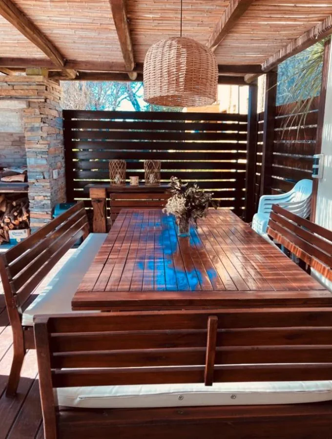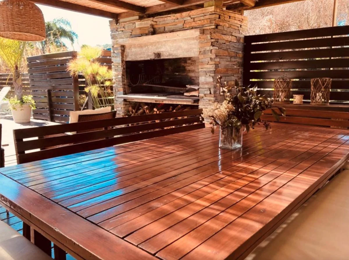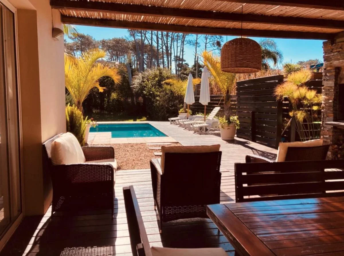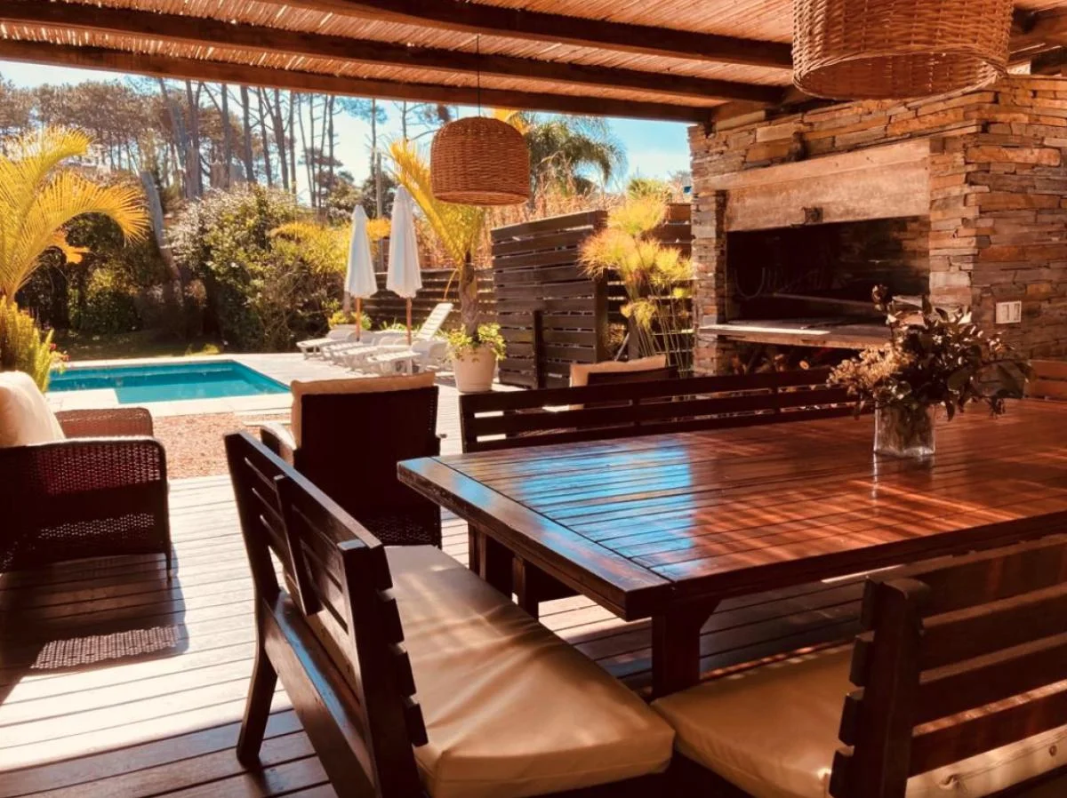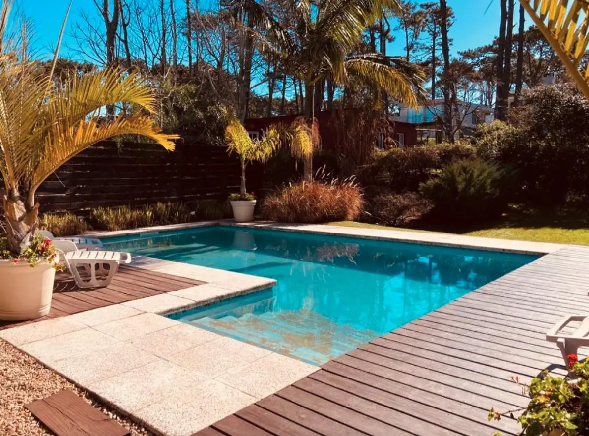 Hermoso jardín con parrillero techado y piscina climatizada.