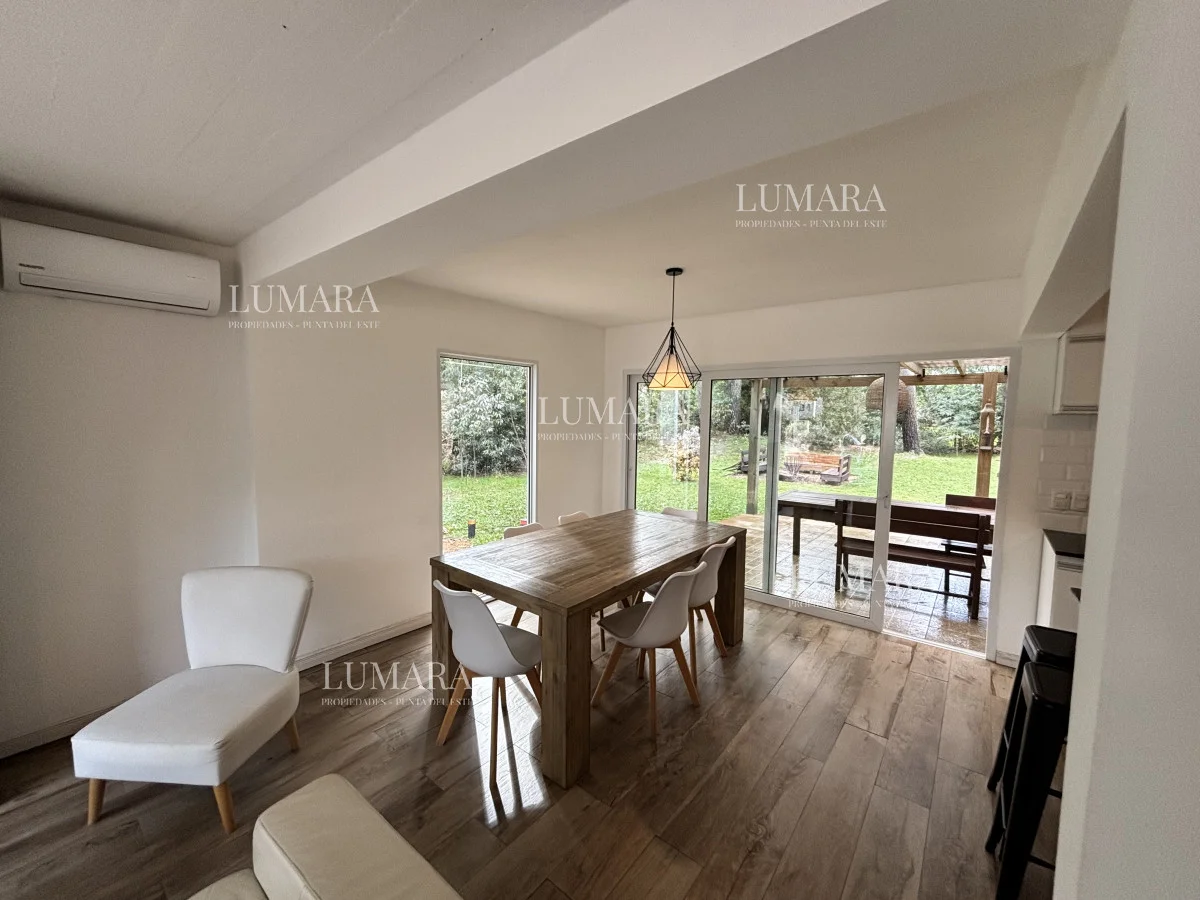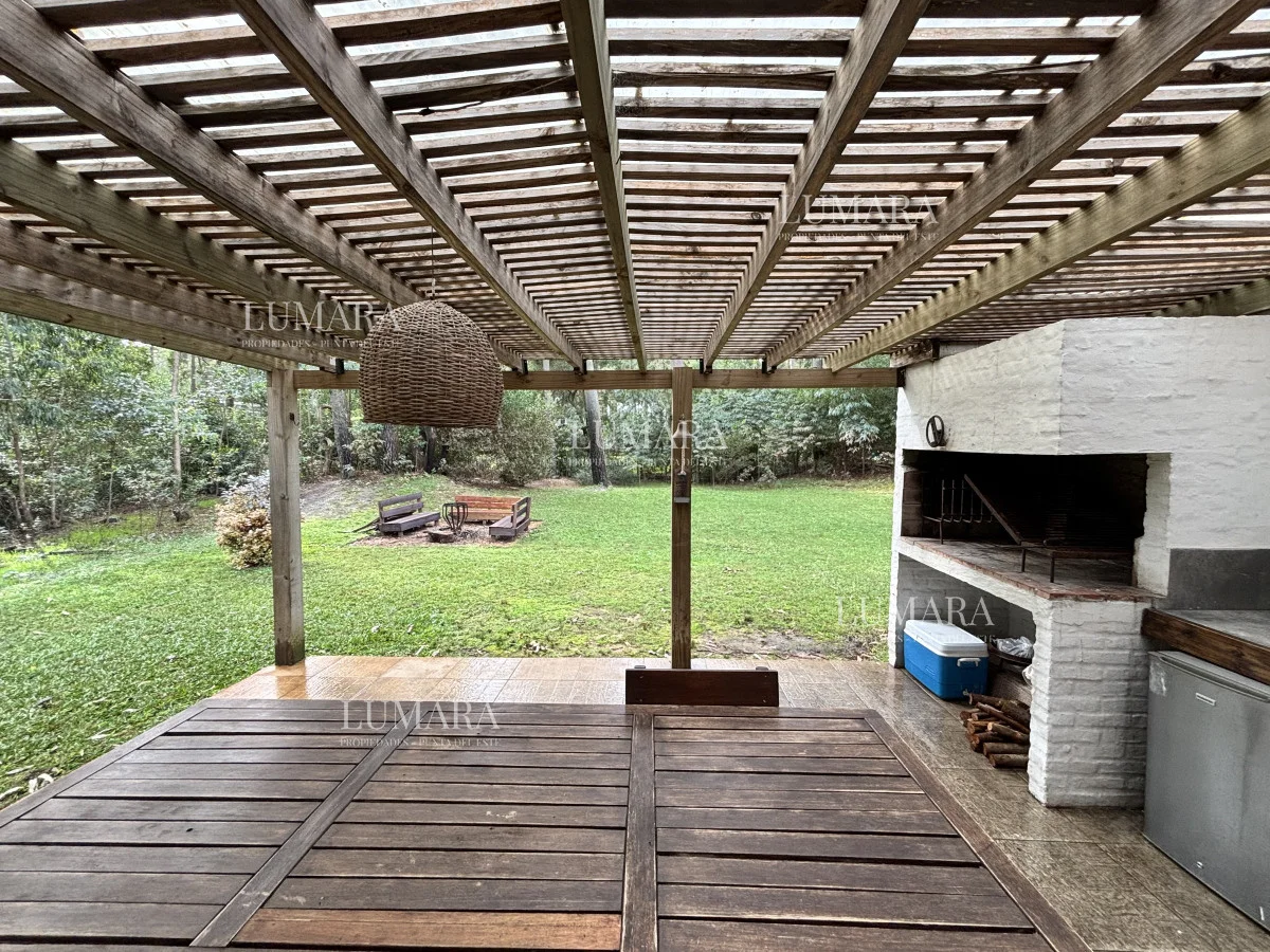 El área de la barbacoa es muy amplia, contando con un excelente parrillero con mesada, juego de mesa y sillas en madera (con almohadones, muy cómodo y disfrutable) y una pérgola de madera. Además, cuenta con un área de fogón para las noches, con bancos de madera para disfrutar de ese momento. El terreno es de 1012 m2, exclusivos para los huéspedes, con zona arbolada y de sol, para todas las opciones.