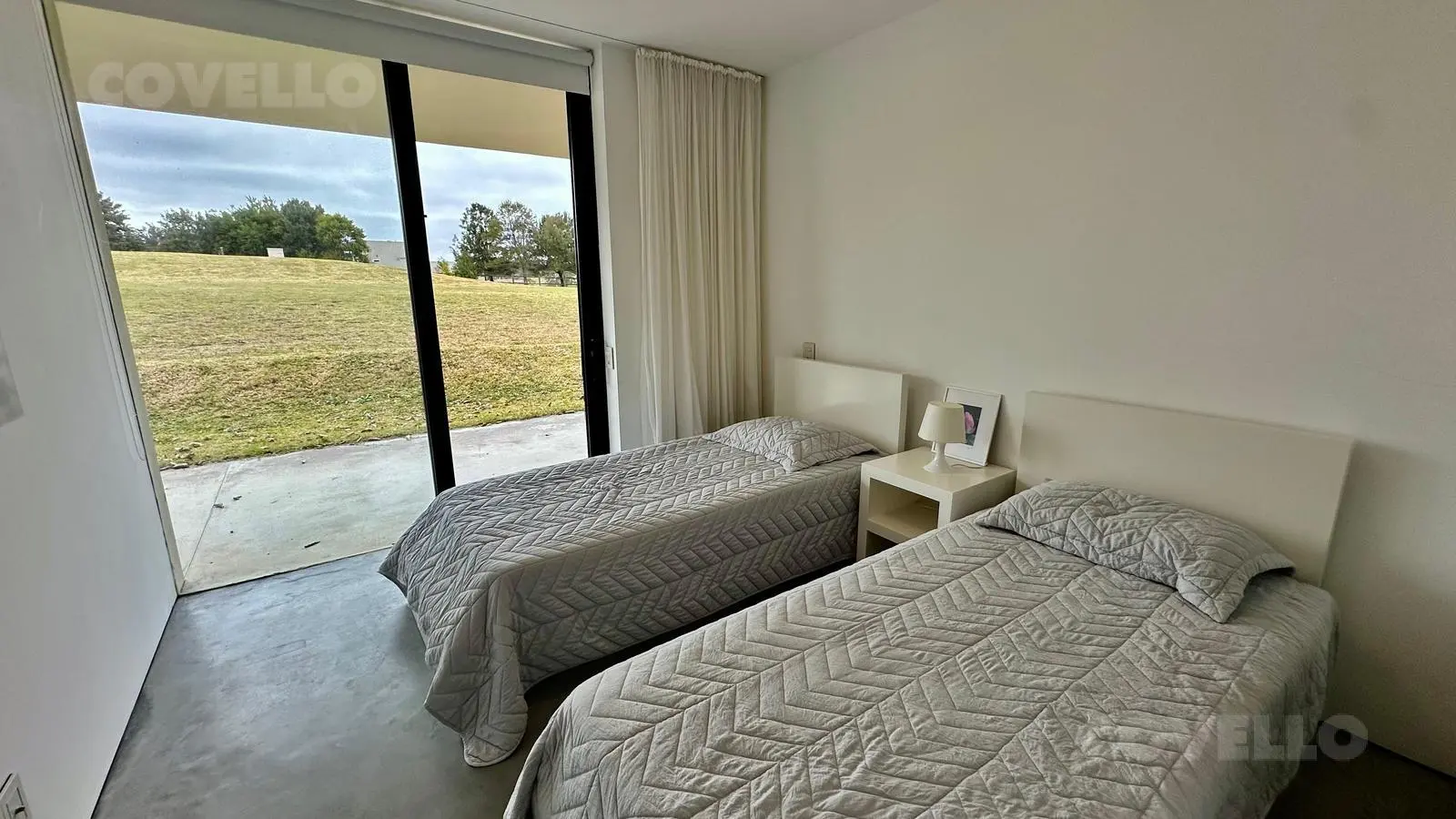 La moderna residencia, ubicada en el barrio privado Villalagos, a las afueras de Manantiales, cuenta con 670 m² construidos en un terreno de 3,8 hectáreas. Dispone de cuatro amplios dormitorios en suite, un espacioso living-comedor, cocina, sala de juegos o TV y casa de huéspedes con dos habitaciones, un baño y cocina comedor.