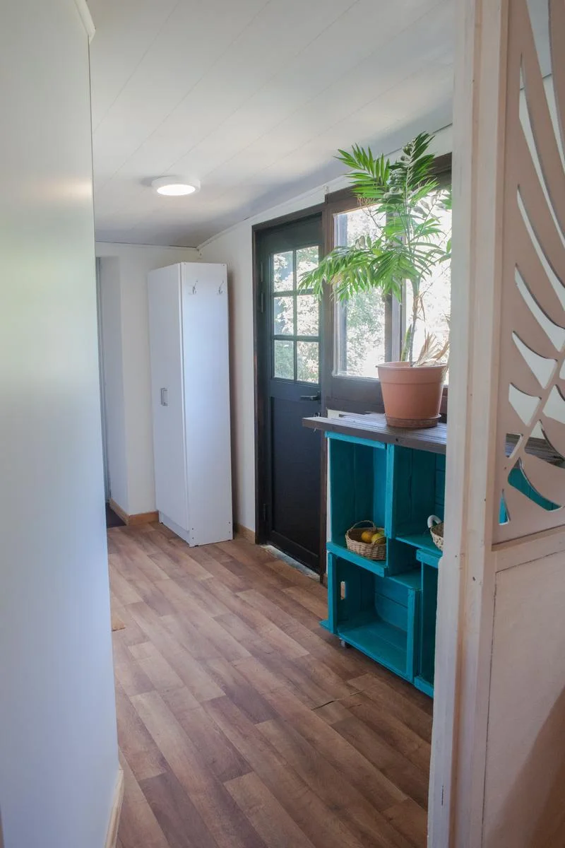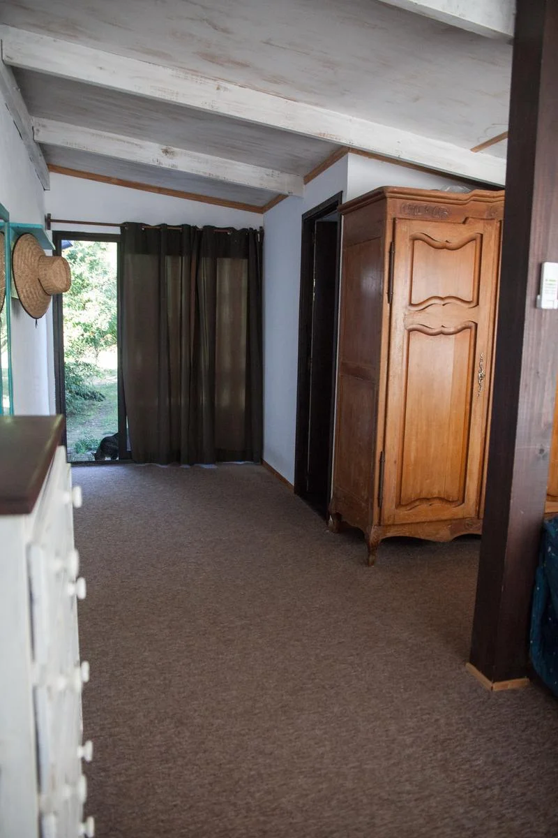 The layout is as follows: Living-dining room with air conditioning and a traditional wood-burning stove; integrated kitchen with access to the garden. Lovely sunny deck with a table and a small armchair.