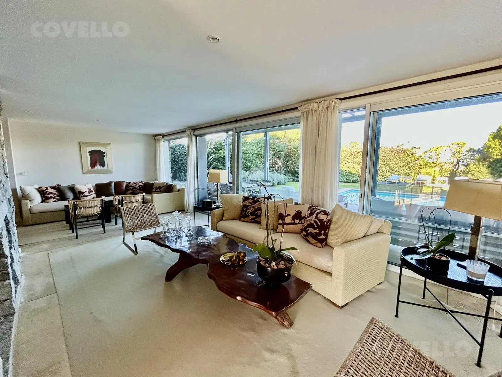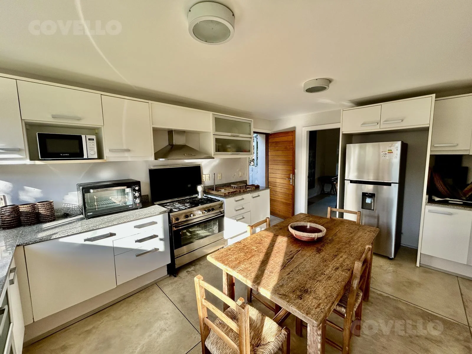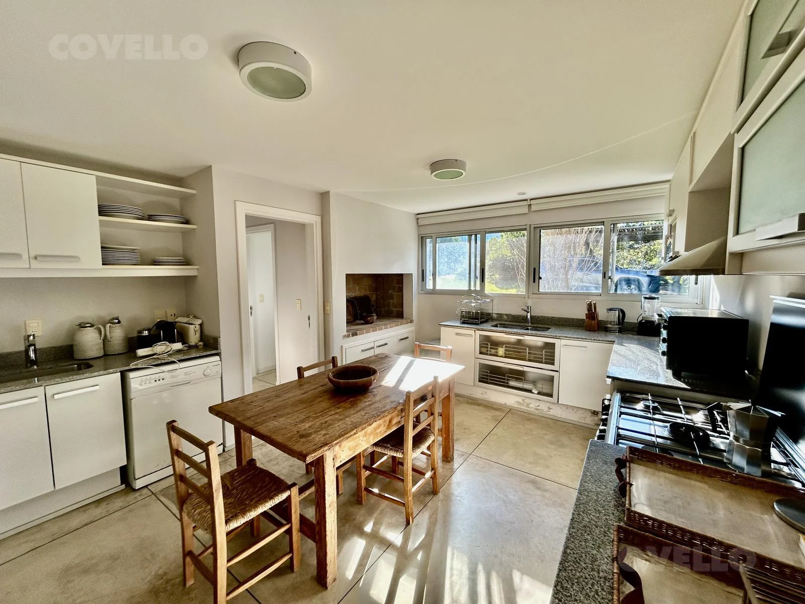 El interior se distingue por su estilo contemporáneo con pisos de cemento alisado, chimenea en el living con tiraje propio y espacios integrados que conectan con el exterior. A continuación del living comedor se encuentra una amplia galería, totalmente equipada alrededor de la piscina propia, generando un ambiente perfecto para disfrutar en familia y con amigos.