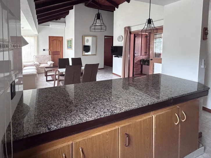 CASA COUNTRY MALDONADO LA HIDALGA CA502233 Muy buena propiedad a la venta en barrio Country de Piriápolis. Ubicada en una zona residencial, tranquila y próxima a todos los servicios del balneario; dista tan solo nueve cuadras de la rambla. De construcción tradicional, sólida y muy bien conservada. Se distribuye en una sola planta, lo que potencia su comodidad y funcionalidad. Cuenta con living-comedor con cocina semintegrada mediante barra desayunadora; pasillo de distribución lleva hacia los dos dormitorios y el baño completo. En el exterior, comunicado mediante una cómoda galería destaca una amplia barbacoa, piscina climatizada con bomba de calor y un tercer dormitorio independiente con baño. El predio se encuentra totalmente cercado y parquizado al frente.