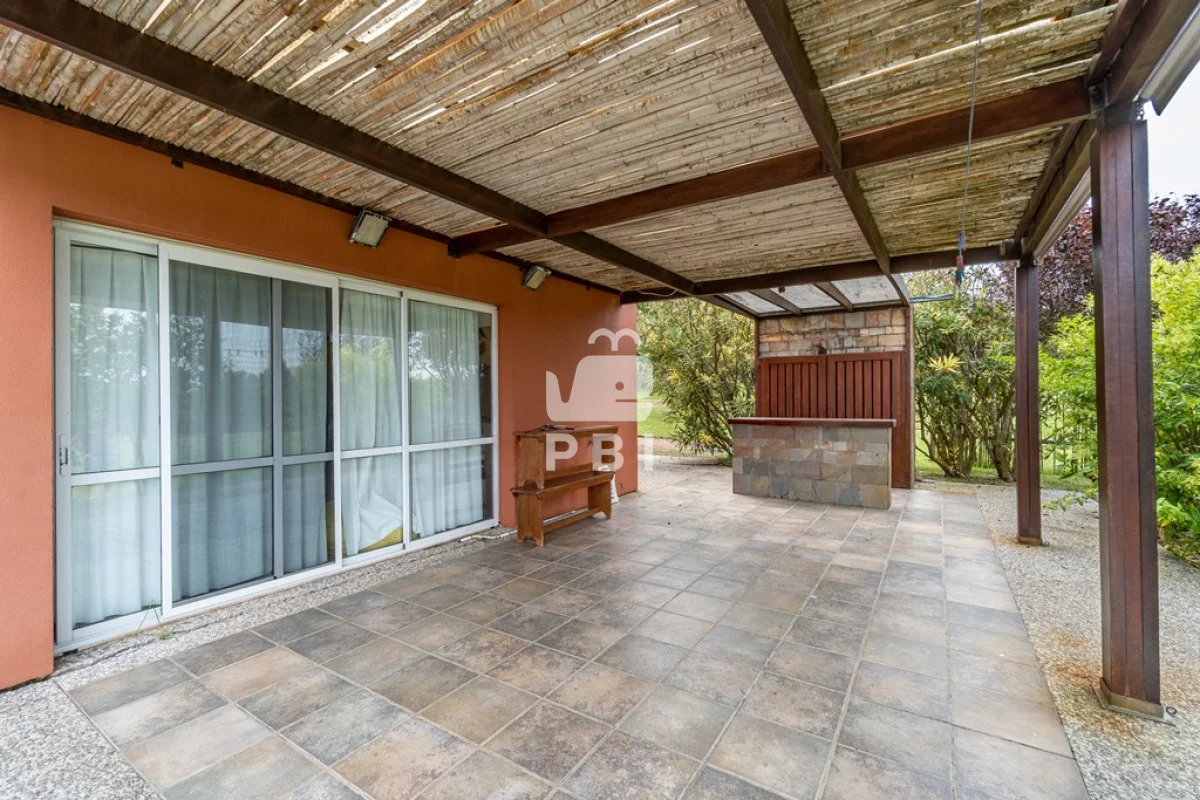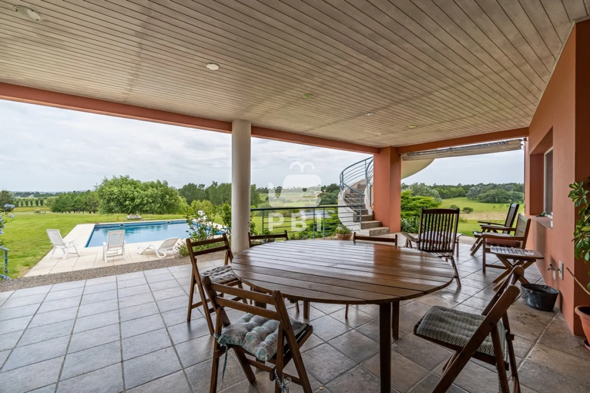 Espacio exterior techado que da a la piscina y en el nivel superior gran terraza con vista a un lindo entorno parquizado de chacras.