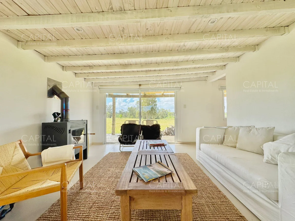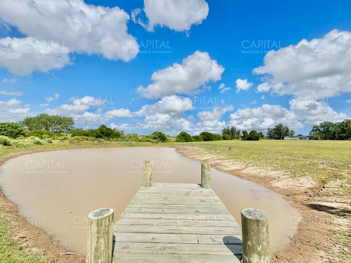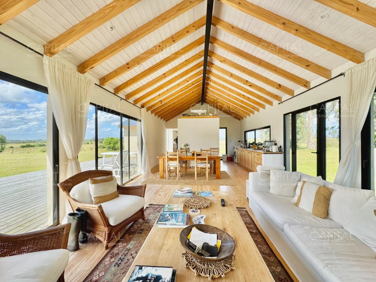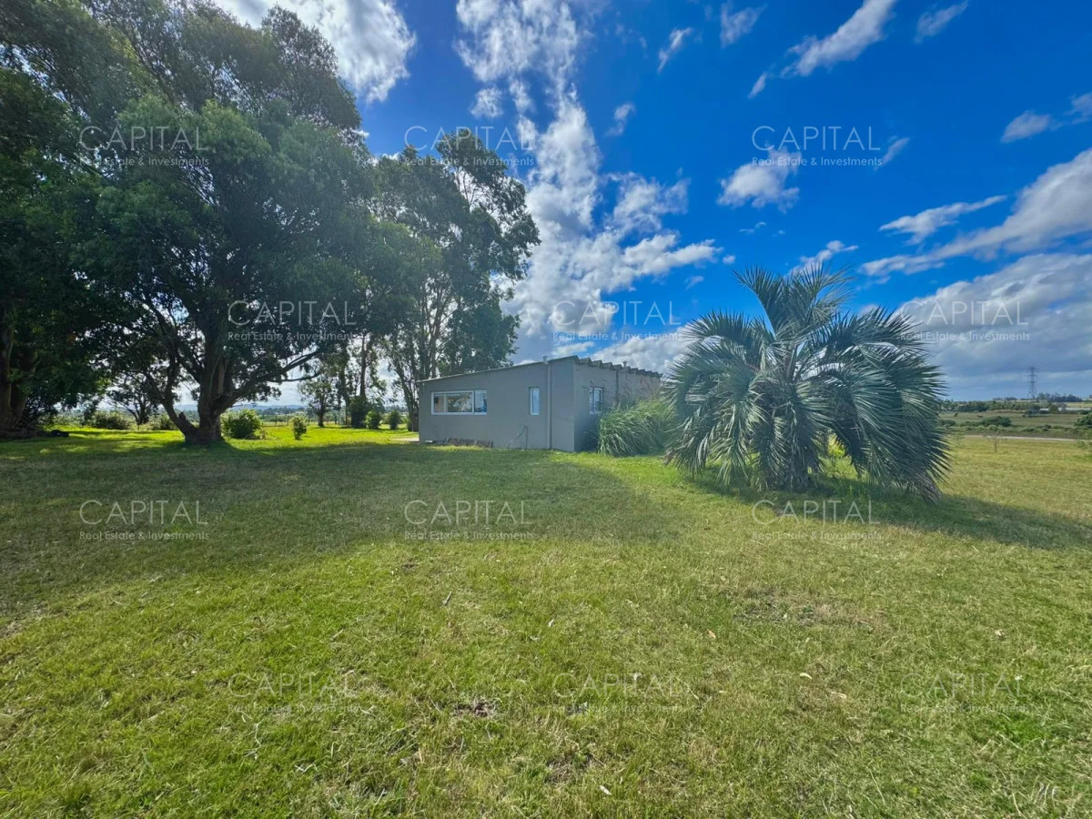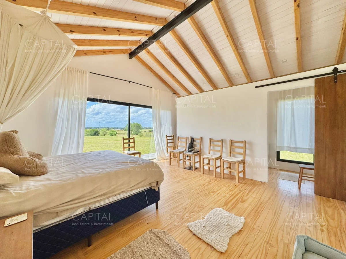 Chacra en Ruta 104 a 4 kms de San Carlos, cuenta con 5 hectáreas en un alto con hermosas visuales al campo. Casa moderna ppal que cuenta con amplio living comedor súper luminoso con estufa a leña, ventanales de piso a techo, salida a gran deck de madera ideal para disfrutar de las vistas, un gran dormitorio en suite, toilette y cocina. Piscina. Independiente otra casa de huéspedes con 1 dormitorio con baño, cocina y deck. Galpón grande para herramientas . Muy lindas visuales al campo y entorno super tranquilo y disfrutable.