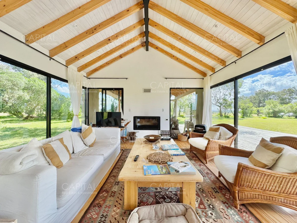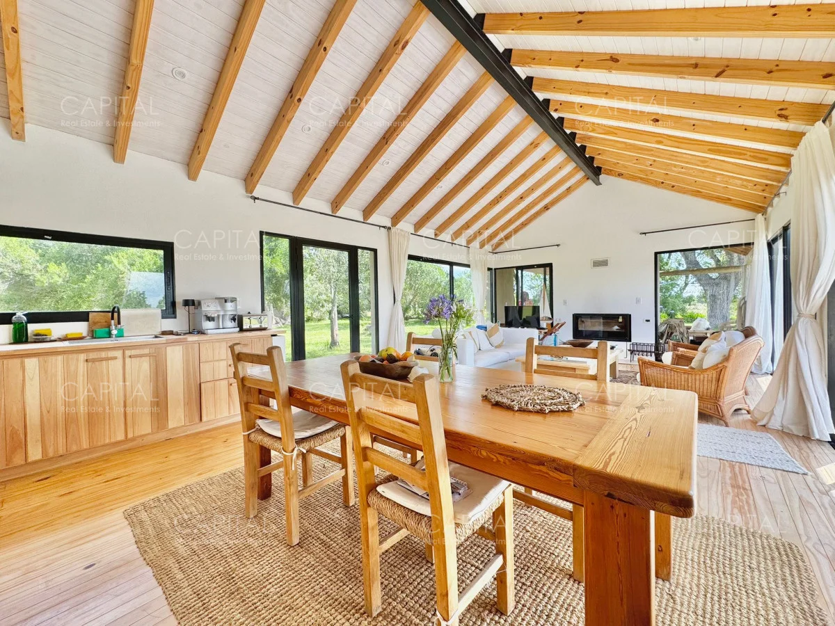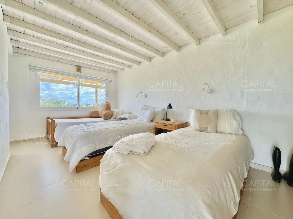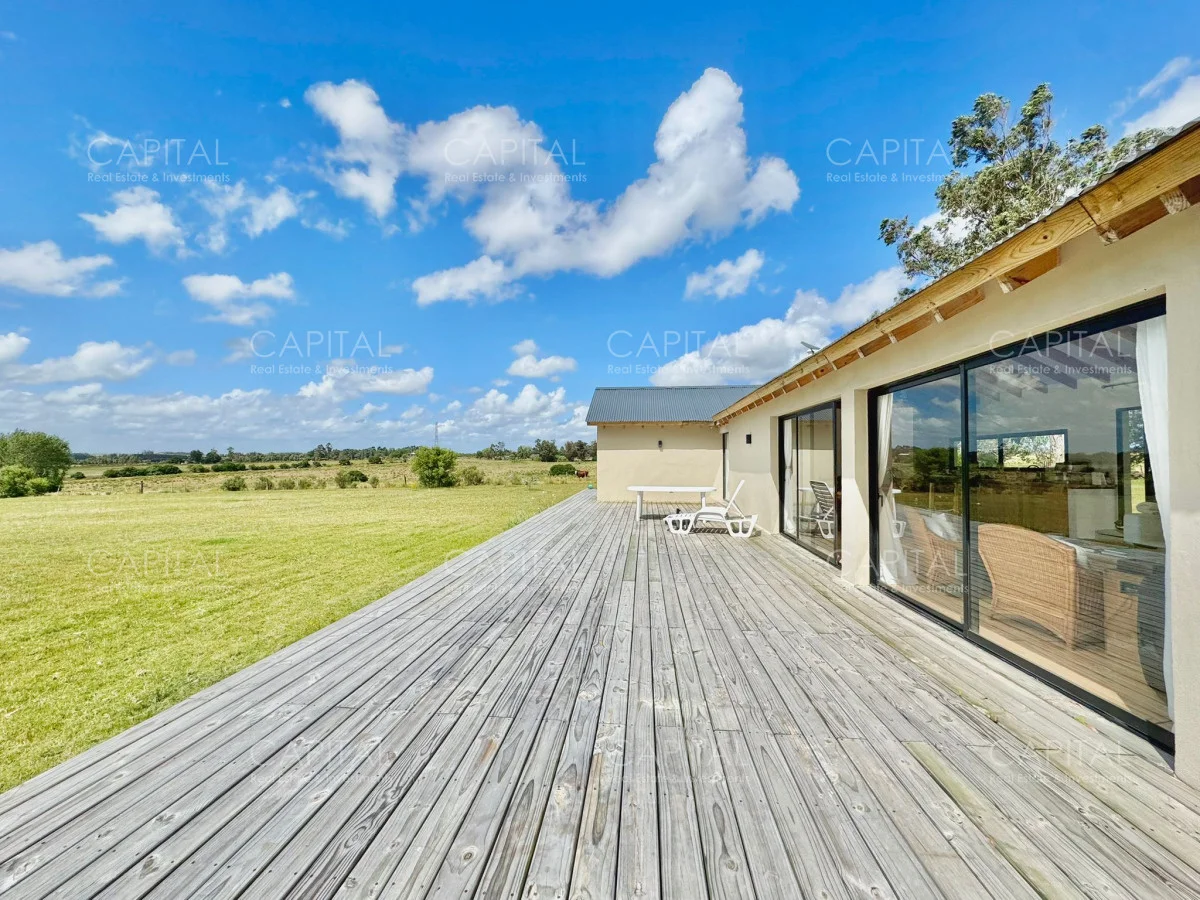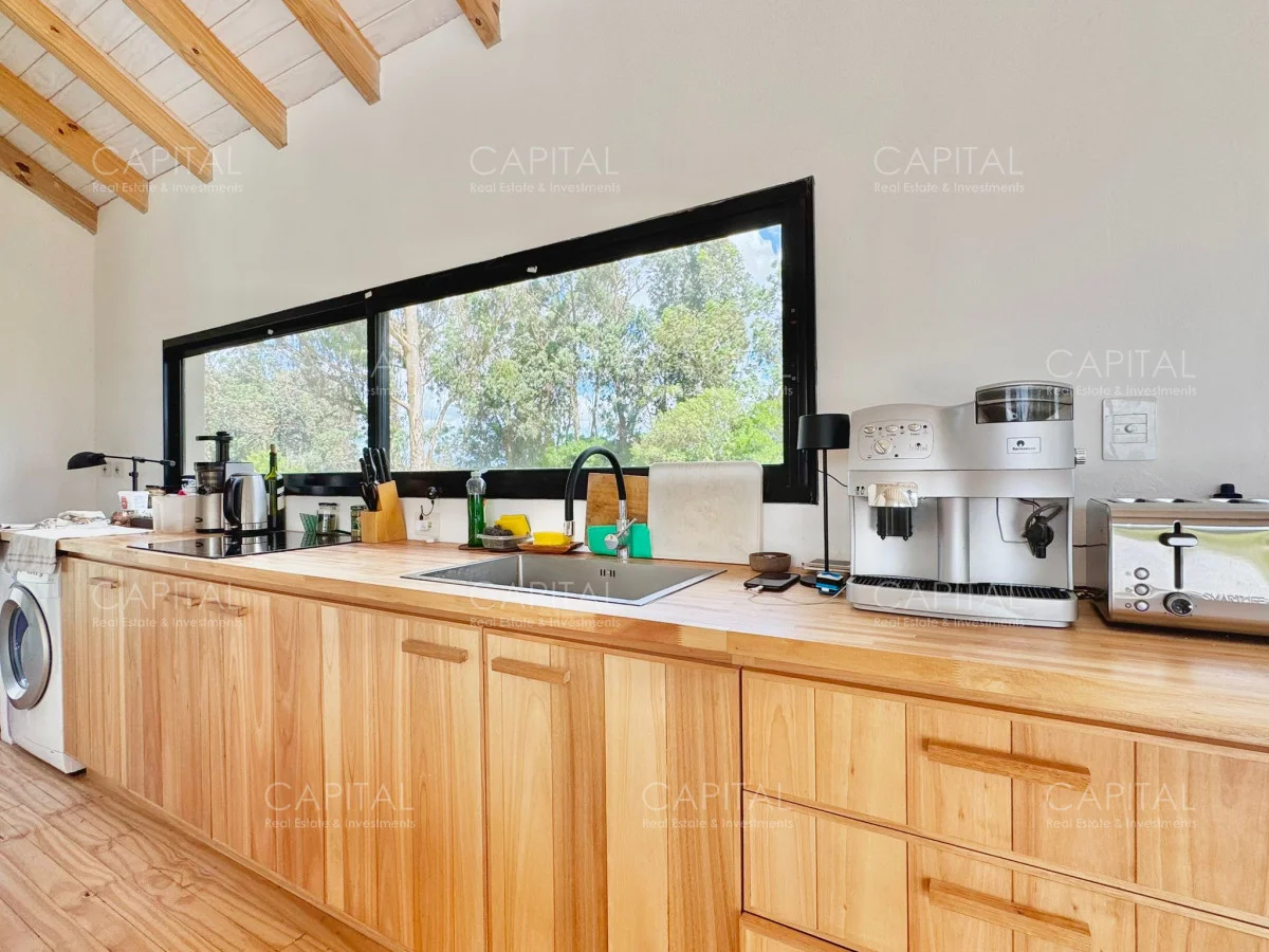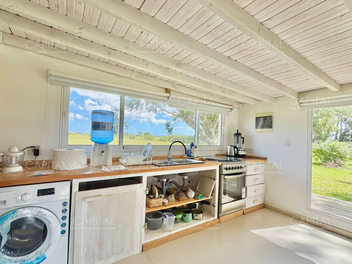 Chacra en Ruta 104 a 4 kms de San Carlos, cuenta con 5 hectáreas en un alto con hermosas visuales al campo. Casa moderna ppal que cuenta con amplio living comedor súper luminoso con estufa a leña, ventanales de piso a techo, salida a gran deck de madera ideal para disfrutar de las vistas, un gran dormitorio en suite, toilette y cocina. Piscina. Independiente otra casa de huéspedes con 1 dormitorio con baño, cocina y deck. Galpón grande para herramientas . Muy lindas visuales al campo y entorno super tranquilo y disfrutable.