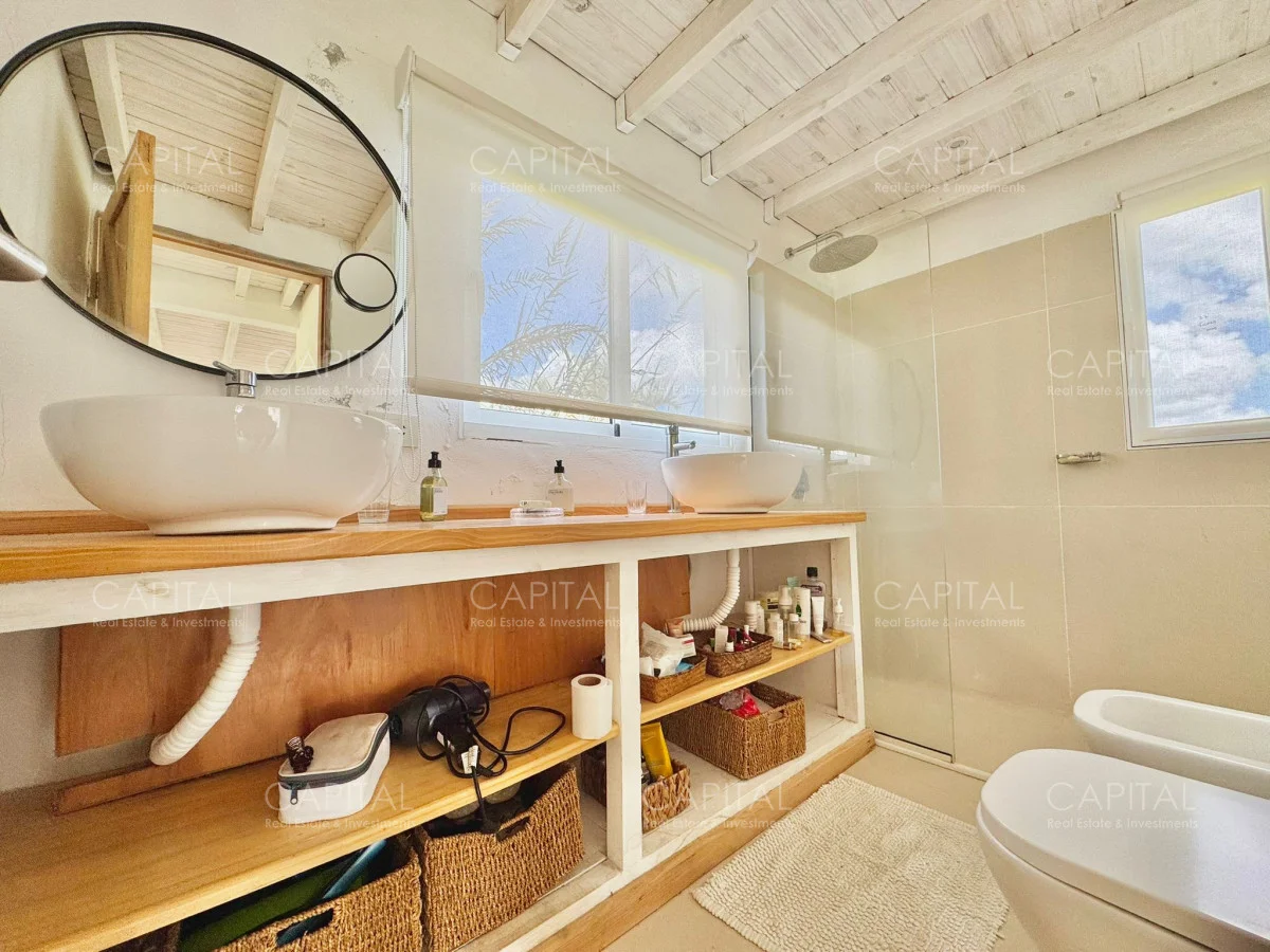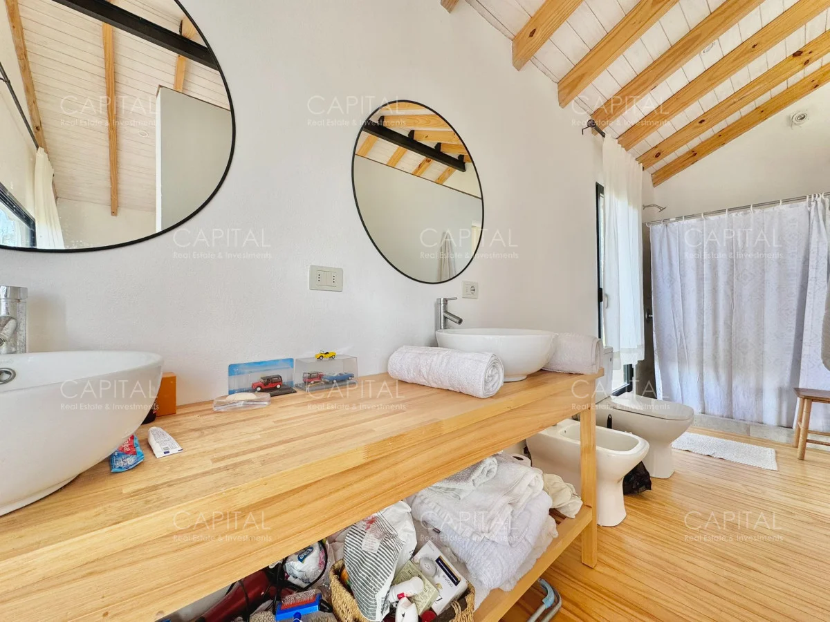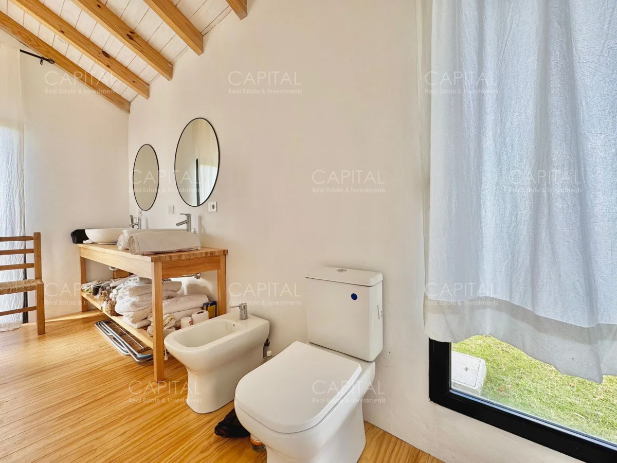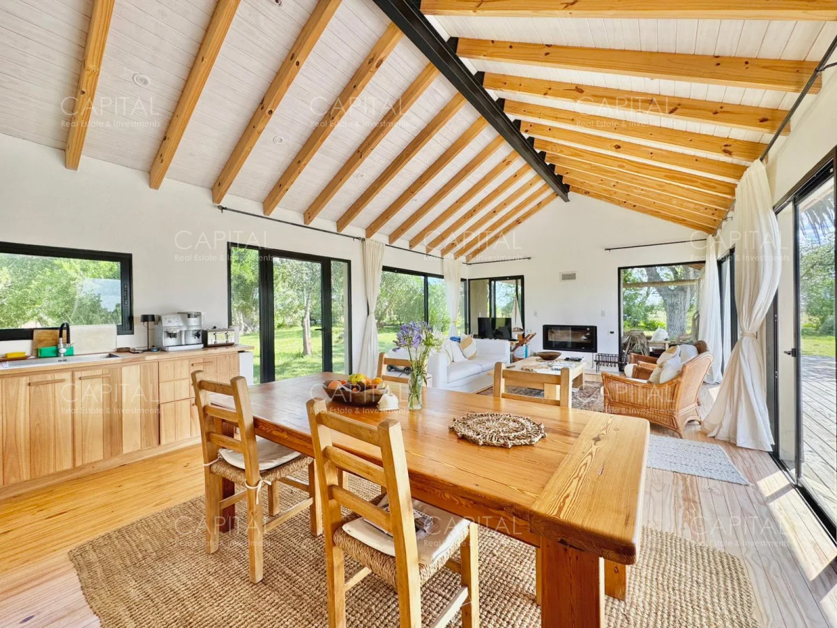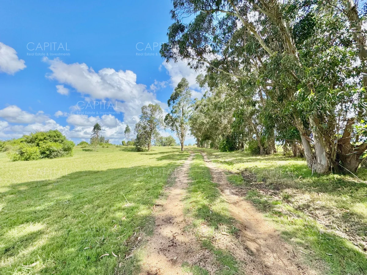 Chacra en Ruta 104 a 4 kms de San Carlos, cuenta con 5 hectáreas en un alto con hermosas visuales al campo. Casa moderna ppal que cuenta con amplio living comedor súper luminoso con estufa a leña, ventanales de piso a techo, salida a gran deck de madera ideal para disfrutar de las vistas, un gran dormitorio en suite, toilette y cocina. Piscina. Independiente otra casa de huéspedes con 1 dormitorio con baño, cocina y deck. Galpón grande para herramientas . Muy lindas visuales al campo y entorno super tranquilo y disfrutable.