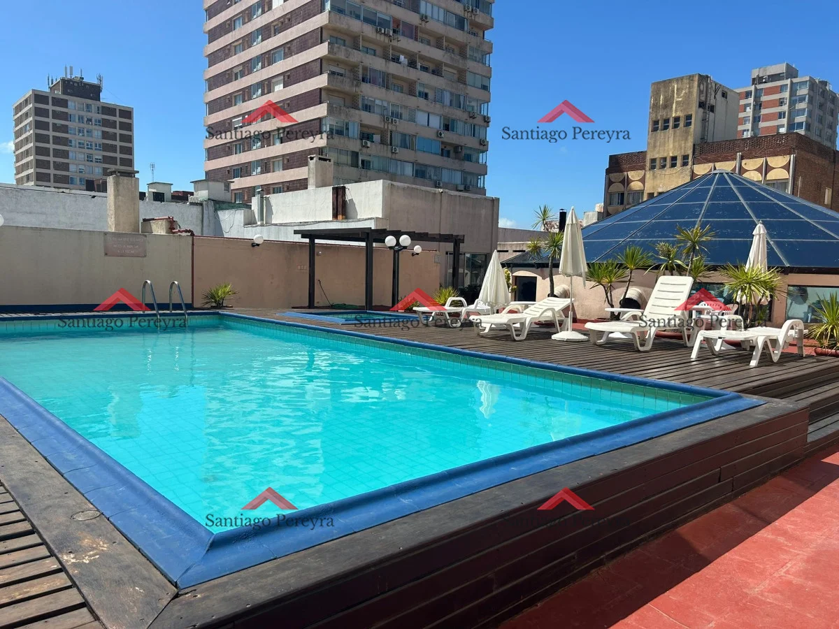 El edificio ofrece una atractiva piscina exterior y gimnasio.