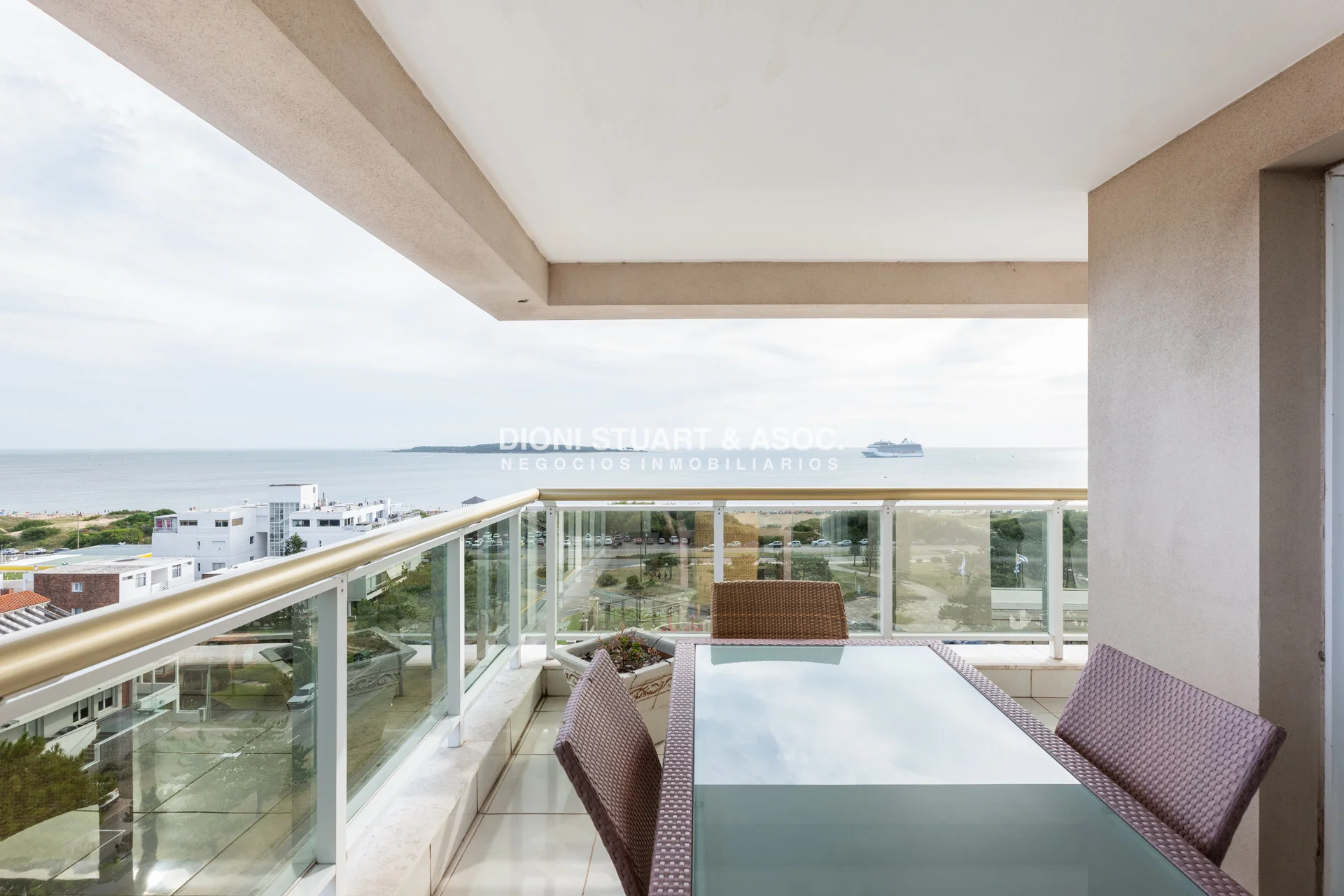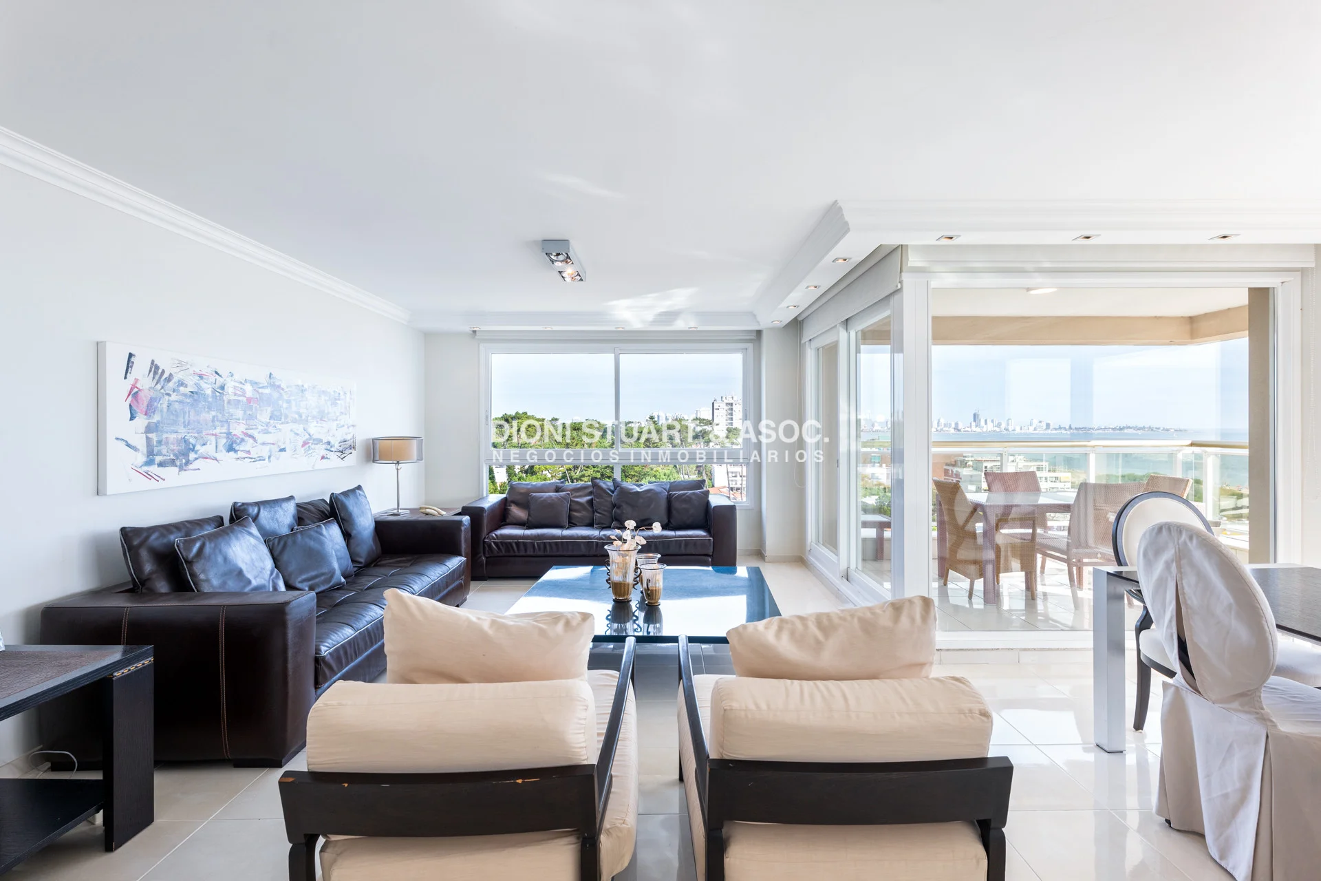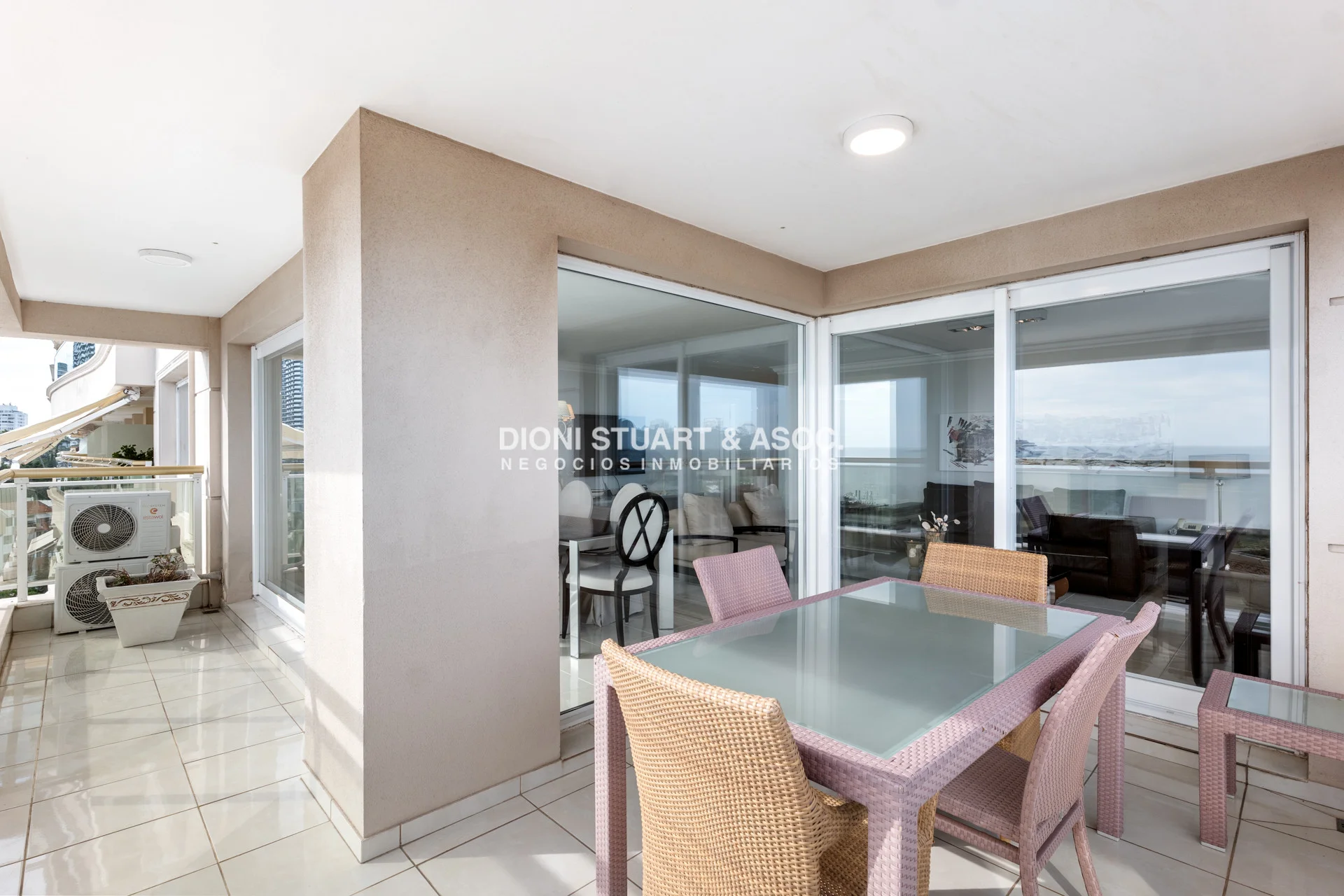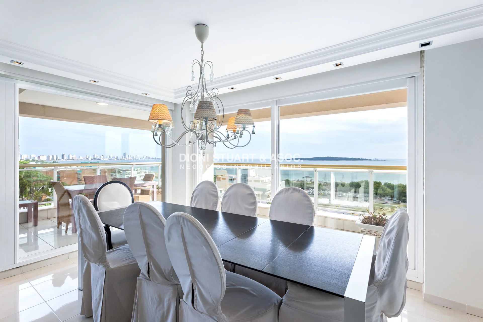 En el gran edificio LE JARDIN presentamos esta unidad esquinera a Punta del Este con 151 m2 internos y 180 m2 totales, distribuida en tres comodos dormitorios en suites, principal con orientado hacia el mar con vista a la Isla Gorriti, toilette, y cocina definida con lavadero y dependencia de servicio con baño. Amplio living-comedor orientado a la Península, con salida a una terraza en forma de L que ofrece grandes vistas a la bahia. La unidad cuenta con un garage.