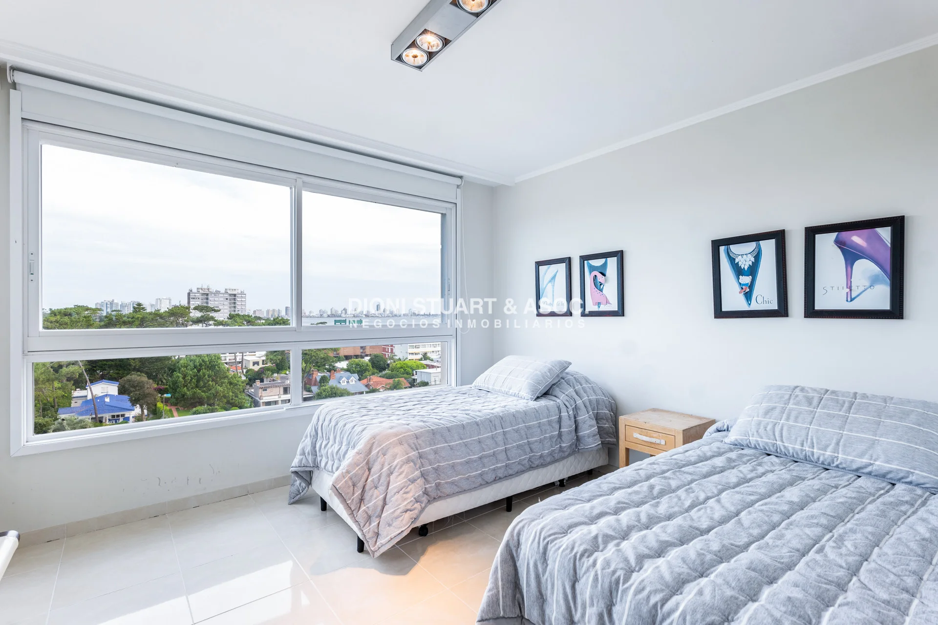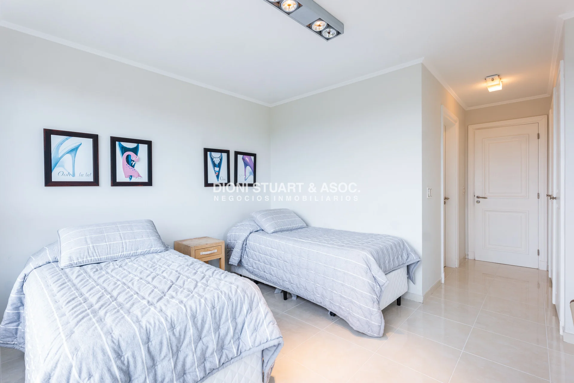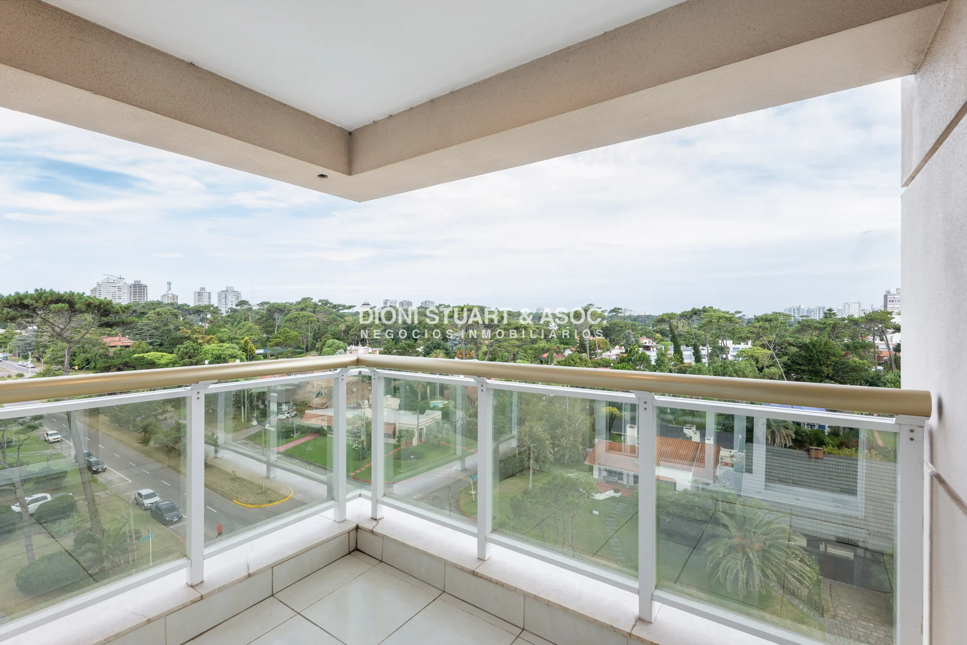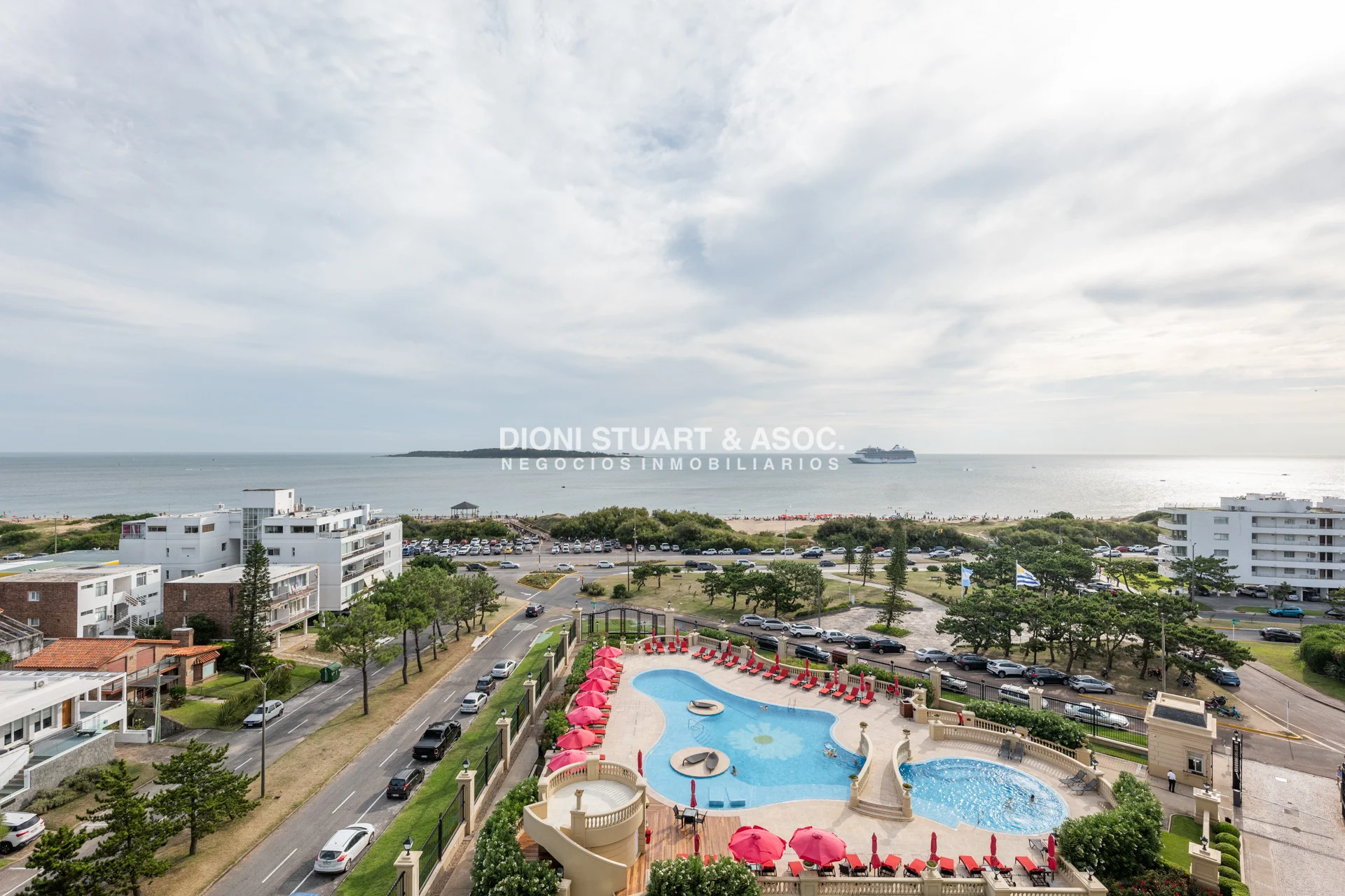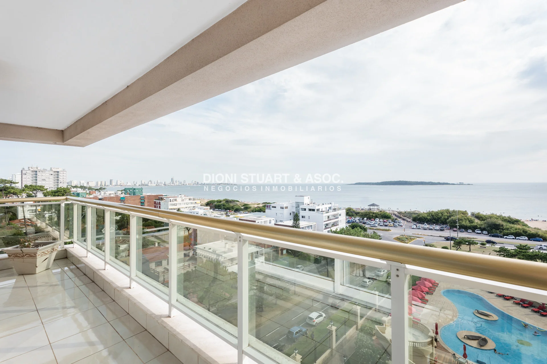En el gran edificio LE JARDIN presentamos esta unidad esquinera a Punta del Este con 151 m2 internos y 180 m2 totales, distribuida en tres comodos dormitorios en suites, principal con orientado hacia el mar con vista a la Isla Gorriti, toilette, y cocina definida con lavadero y dependencia de servicio con baño. Amplio living-comedor orientado a la Península, con salida a una terraza en forma de L que ofrece grandes vistas a la bahia. La unidad cuenta con un garage.
