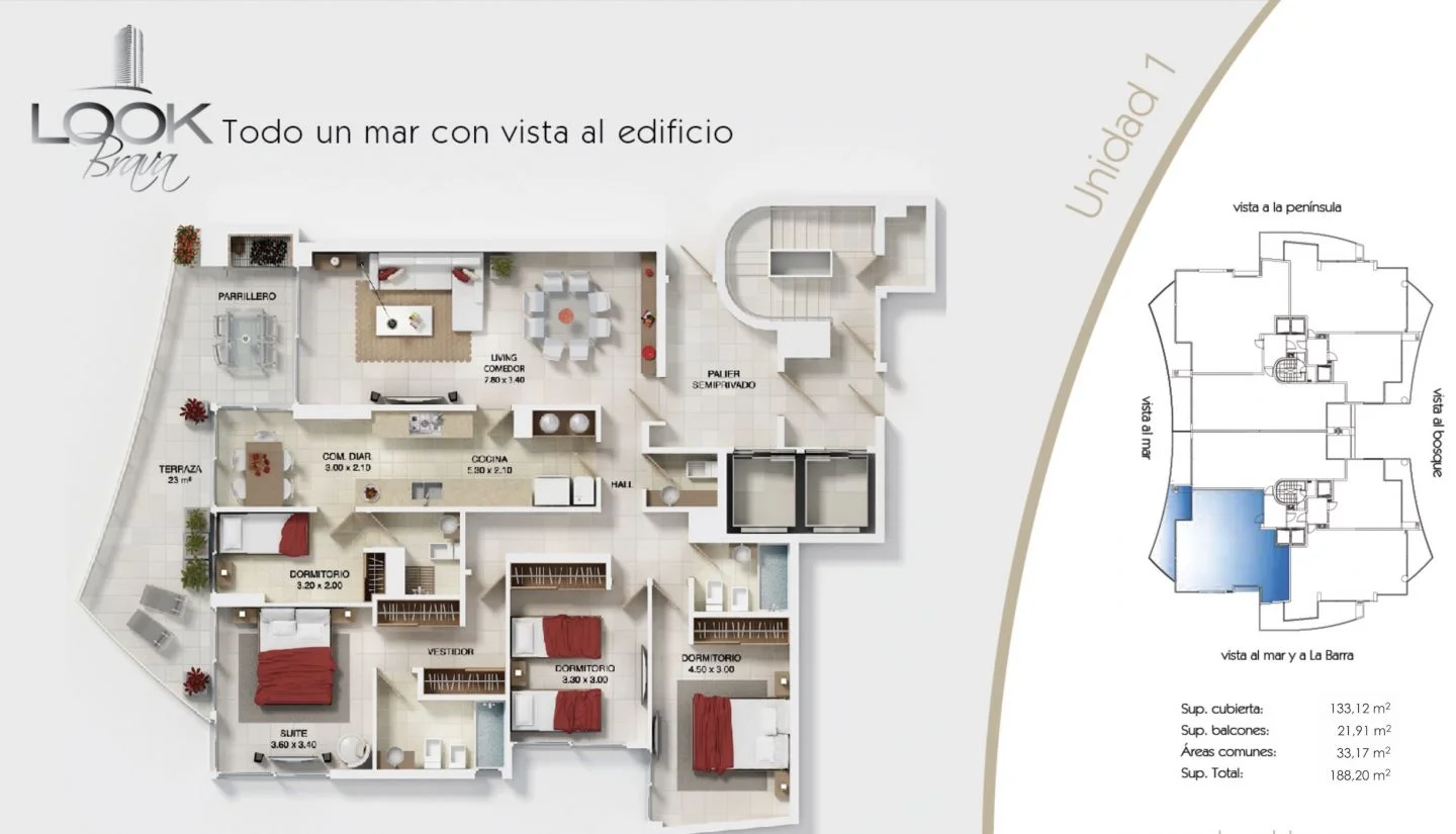 EXCELENTE DEPARTAMENTO ESQUINERO EN VENTA Ésta unidad esquinera cuenta con 3 amplios dormitorios y dependencia de servicio. Total 4 baños (3 completos, más toilette) y un gran living comedor con salida a un gran balcón aterrazado con plena vista al mar y parrillero individual. Cómoda y funcional cocina con comedor diario.- Calefacción por losa radiante individual por ambiente.- Esta unidad forma parte del Exclusivo edificio Look Brava que se desarrolla sobre un terreno de 7280m2, con 26 pisos, en la Parada 10 de la Brava a pocos metros del mar. Con los siguientes Amenities y servicios : Acceso con espejos de agua , Bar/confitería , Terrazas , Canchas de tenis, Piscinas in/out climatizada , Gimnasio , Microcine , Business center , Salones de reuniones y/o fiestas , Salas de juegos para adultos y adolescentes , Kids Club , Saunas con salas de masaje y relax . Quinchos exteriores con parrilleros para reuniones grupales . Consúltenos!!! www.passadore-otero.uy . Caracteristicas: DORMITORIO EN SUITE, GARAJE, PLAYROOM, SALA DE JUEGOS, TOILETTE, CANCHAS DEPORTIVAS, PORTERIA, SEGURIDAD, VIGILANCIA, WIFI, APTO PARA FAMILIAS/NI?OS, CANCHA DE TENIS, ESTACIONAMIENTO, LUZ ELECTRICA, PORTERO ELECTRICO, VISTA AL MAR XINTEL (PSD-PSD-7404)