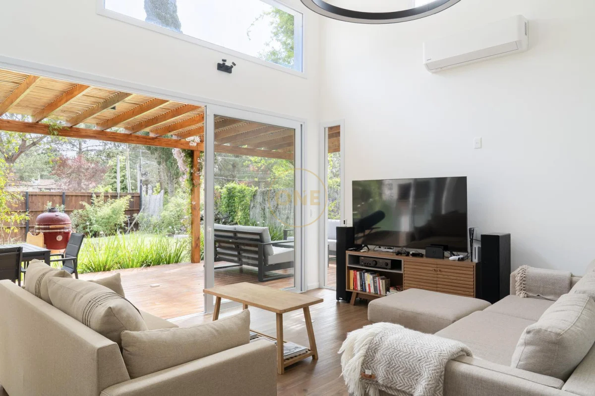 El corazón de la casa es un agradable living comedor con doble altura, que gracias a su orientación noroeste, recibe luz solar durante todo el día. La sensación de amplitud se potencia con aberturas de 2,4 metros de altura, permitiendo que todos los ambientes tengan salida directa al exterior a través de puertas ventana.