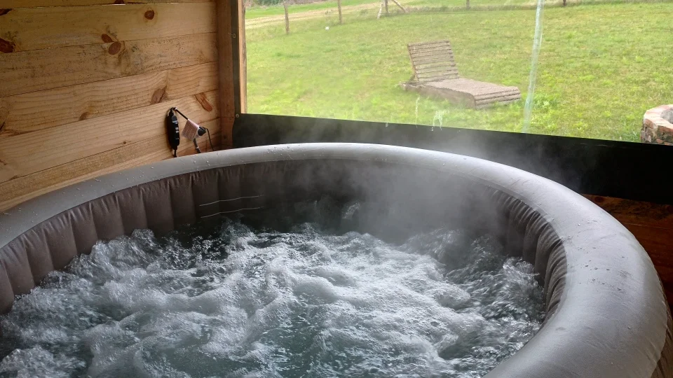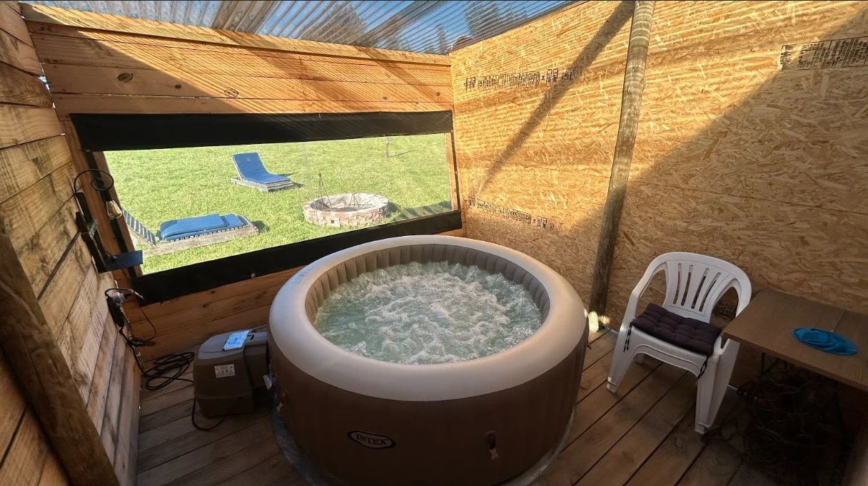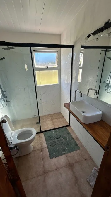 baño completo con mampara de cristal, jacuzzi cerrado para 5 personas.