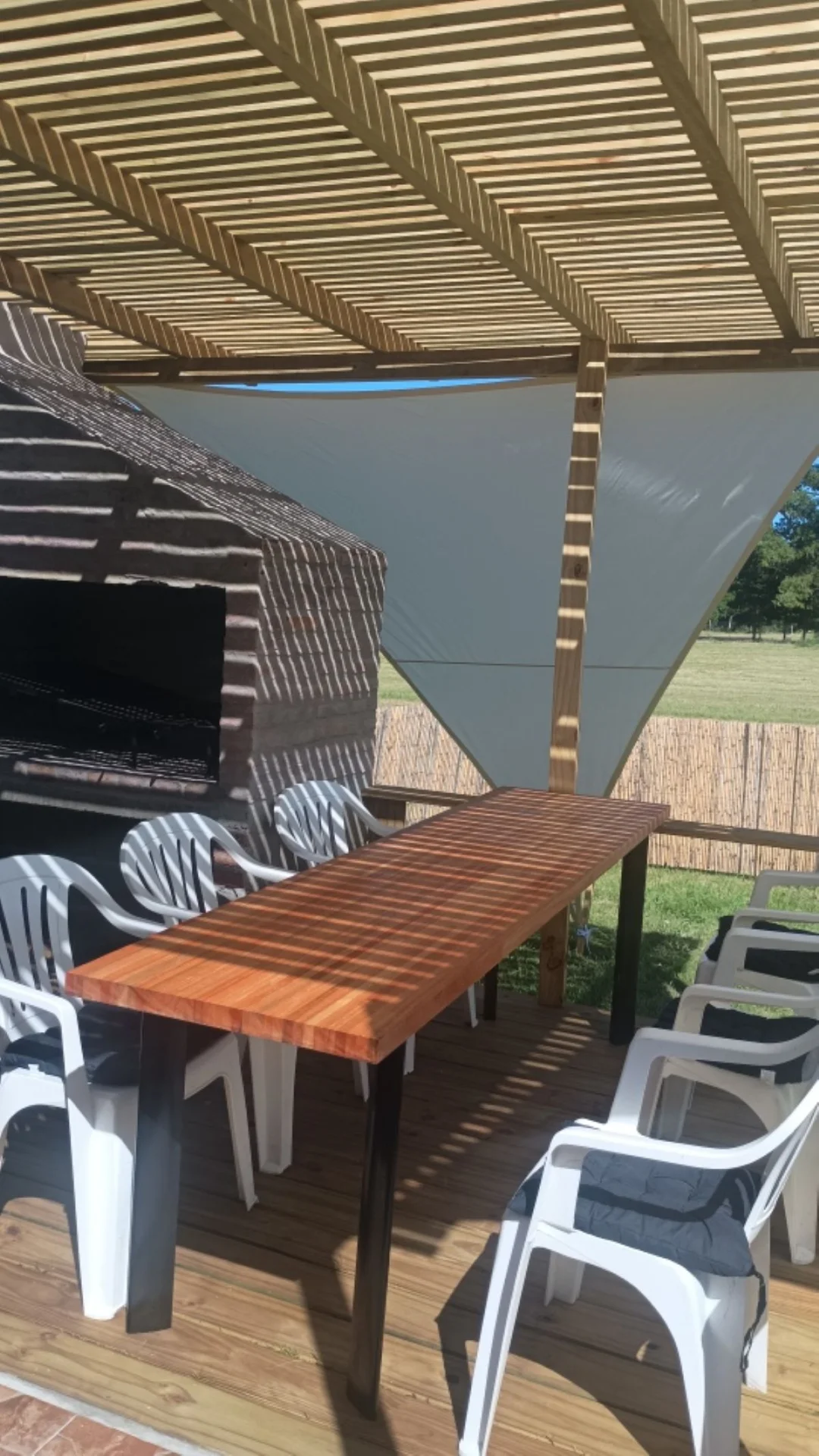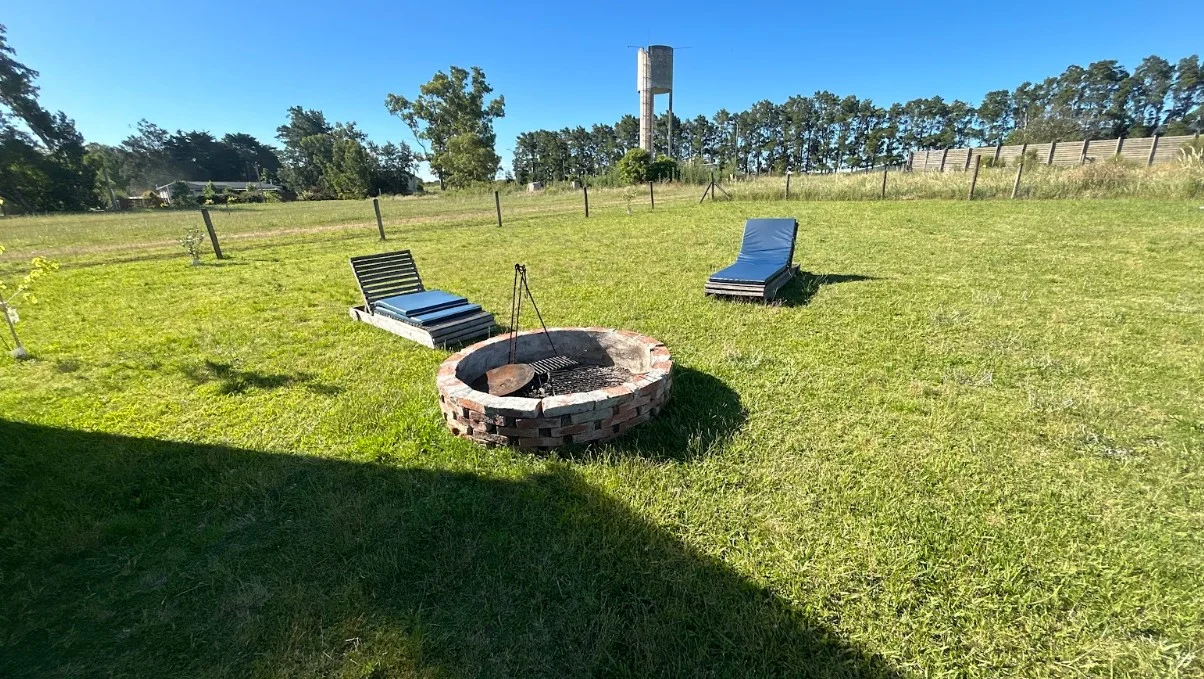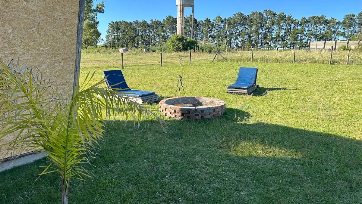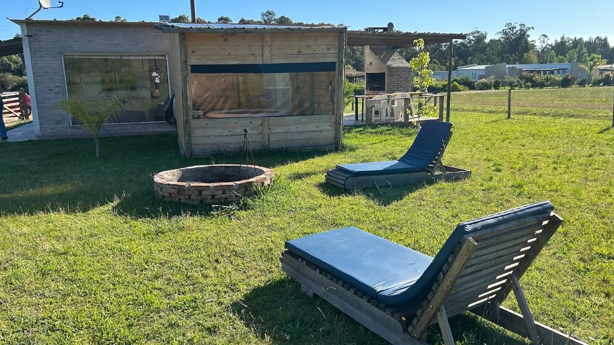 Parrillero al fondo con deck de madera, solárium y fogón al aire libre.