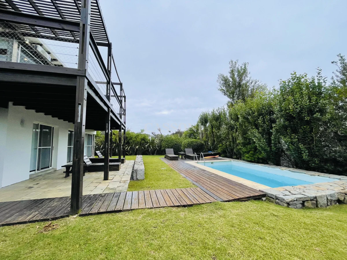 Dispone de amplio living comedor con excelente vista hacia el mar, estufa a leña, y salida al deck que rodea toda la planta alta; donde está ubicado el parrillero y estar exterior. Cocina bien equipada. Cinco cómodos dormitorios, dos de ellos en suite, más dependencia de servicio con baño (capacidad para 11 plazas en confortables sommiers).