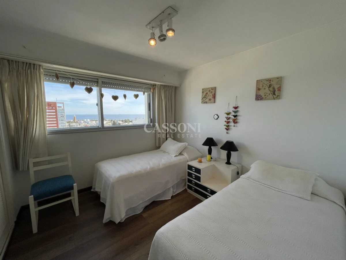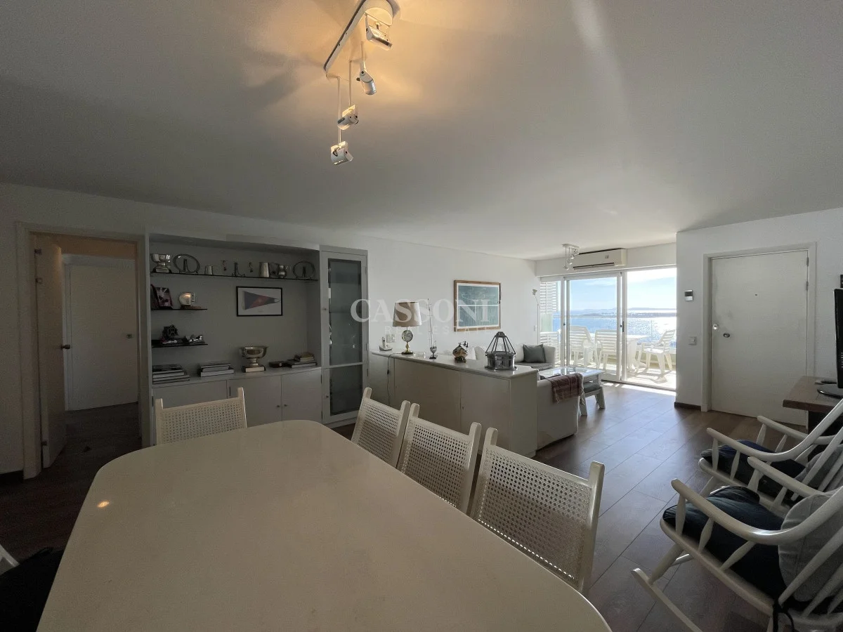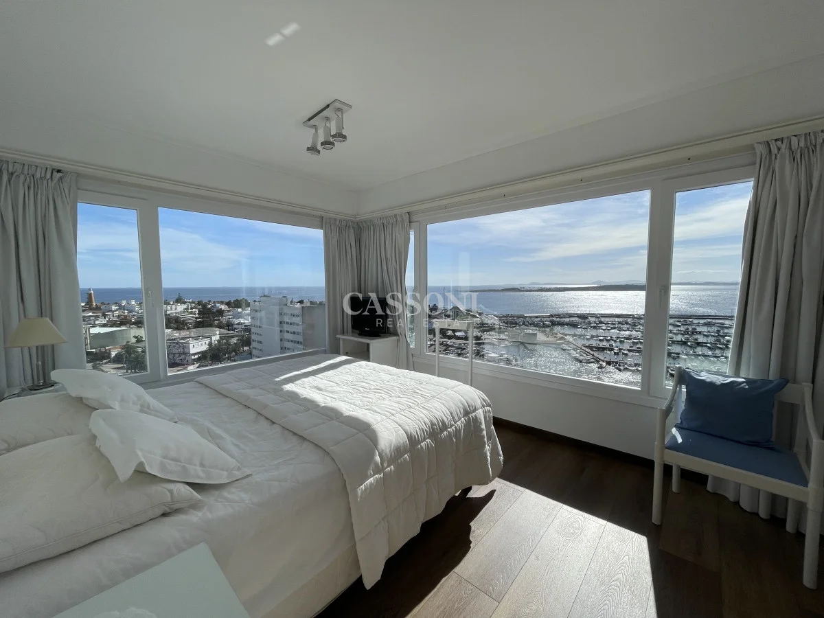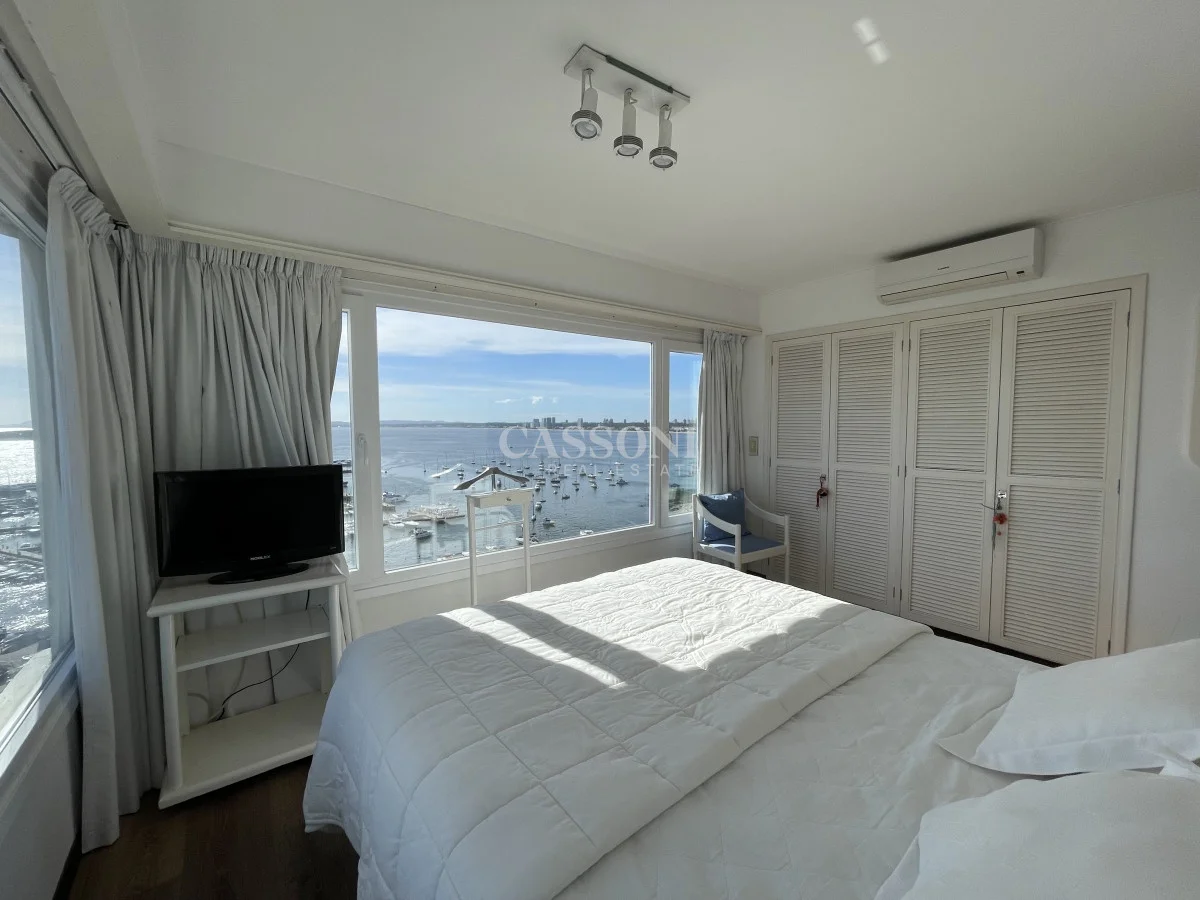 Amplio apartamento con excelente vista al Puerto, linda terraza, living comedor, tres dormitorios y dos baños, mas dormitorio de servicio con baño integrado que funciona como 4º dormitorio, cocina, lavavajillas y lavarropas, lavadero, garage. Aire acondicionado en el living y en la suite.