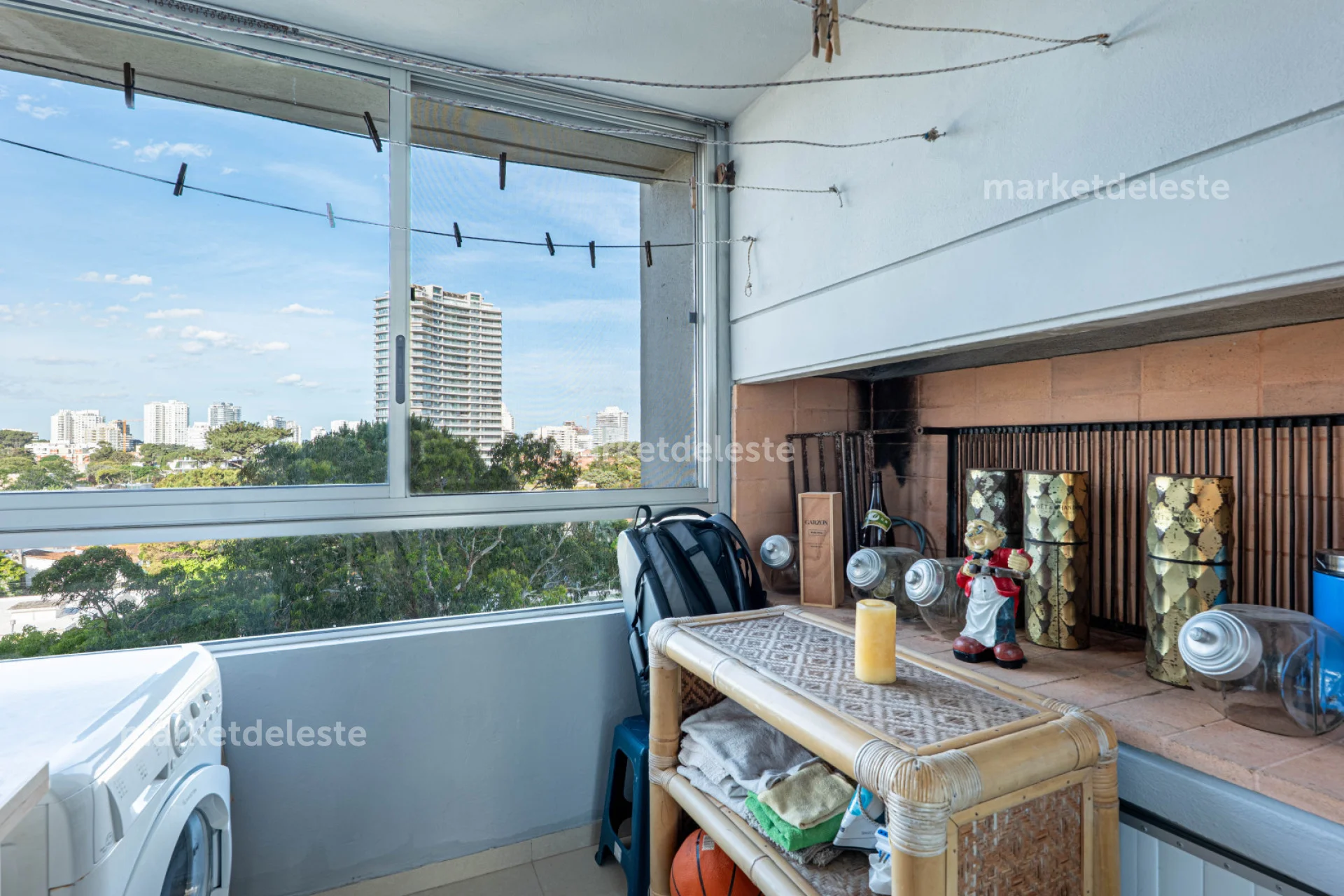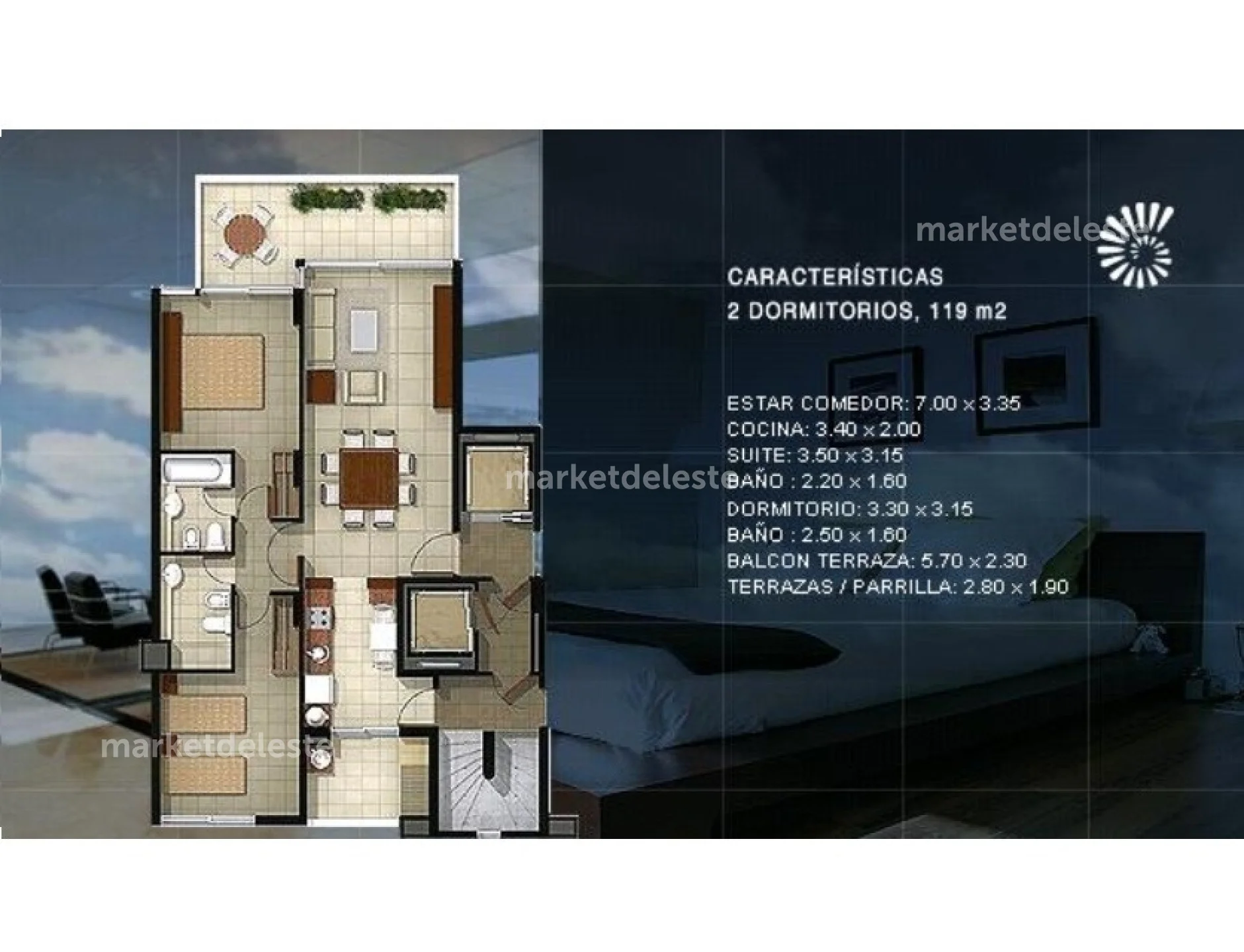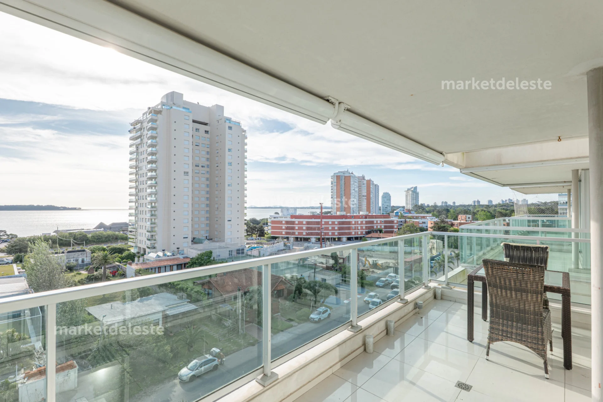 El apartamento cuenta con 2 dormitorios, 2 baños (uno en suite), Amplio balcón terraza con vista al mar, cocina totalmente equipada, lavadero y terraza de servicio con parrillero propio.