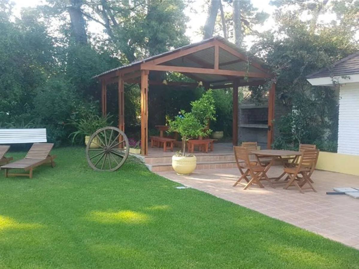 El jardín ofrece una barbacoa cerrada con baño completo y cocina independiente, además de un parrillero abierto ideal para el verano, un jacuzzi y una piscina.