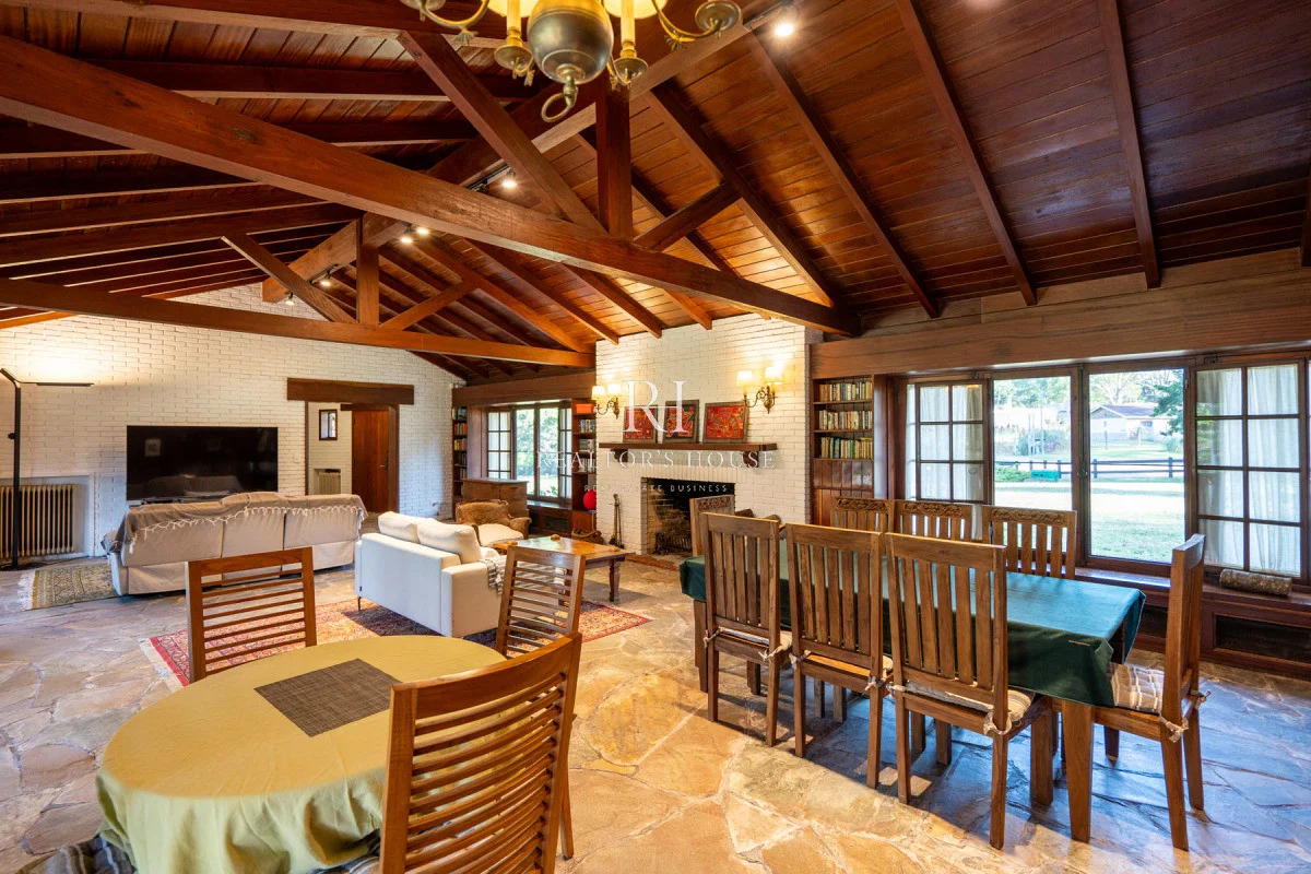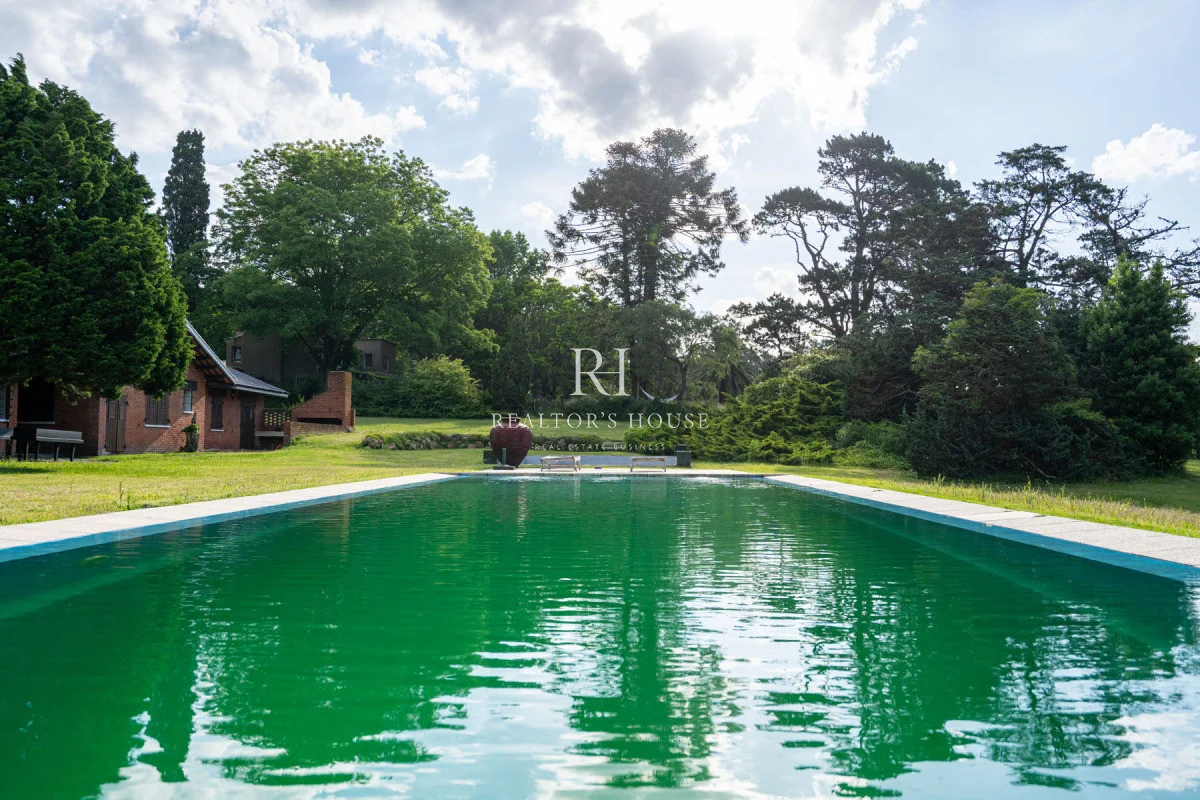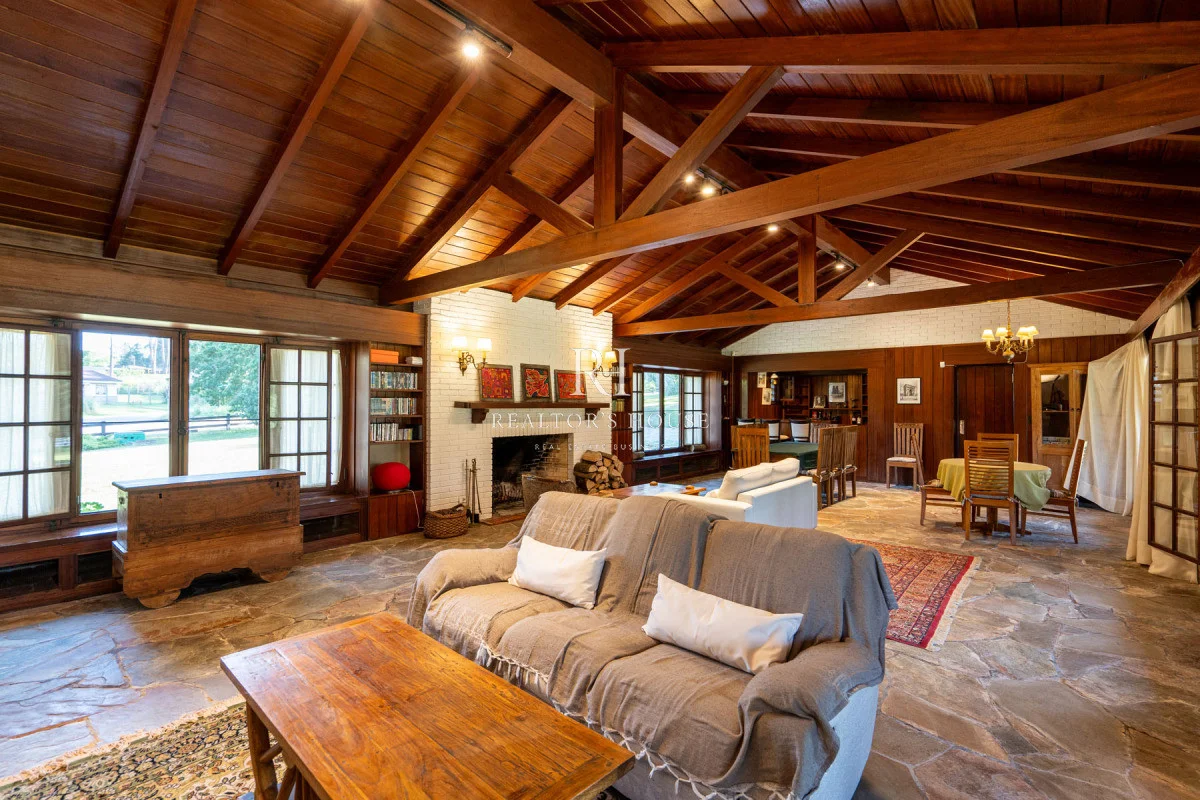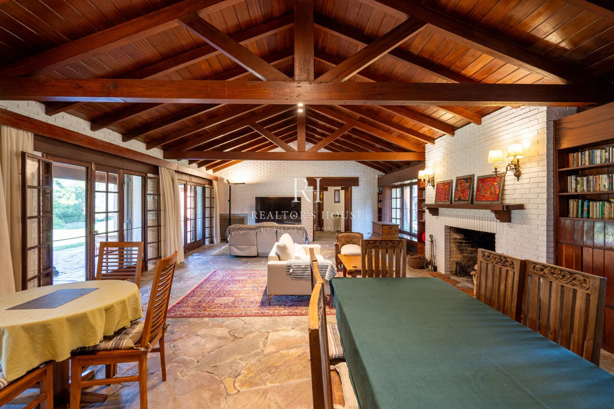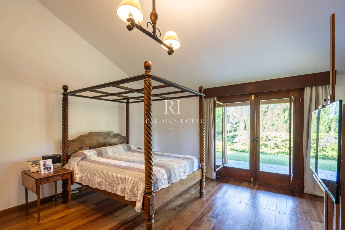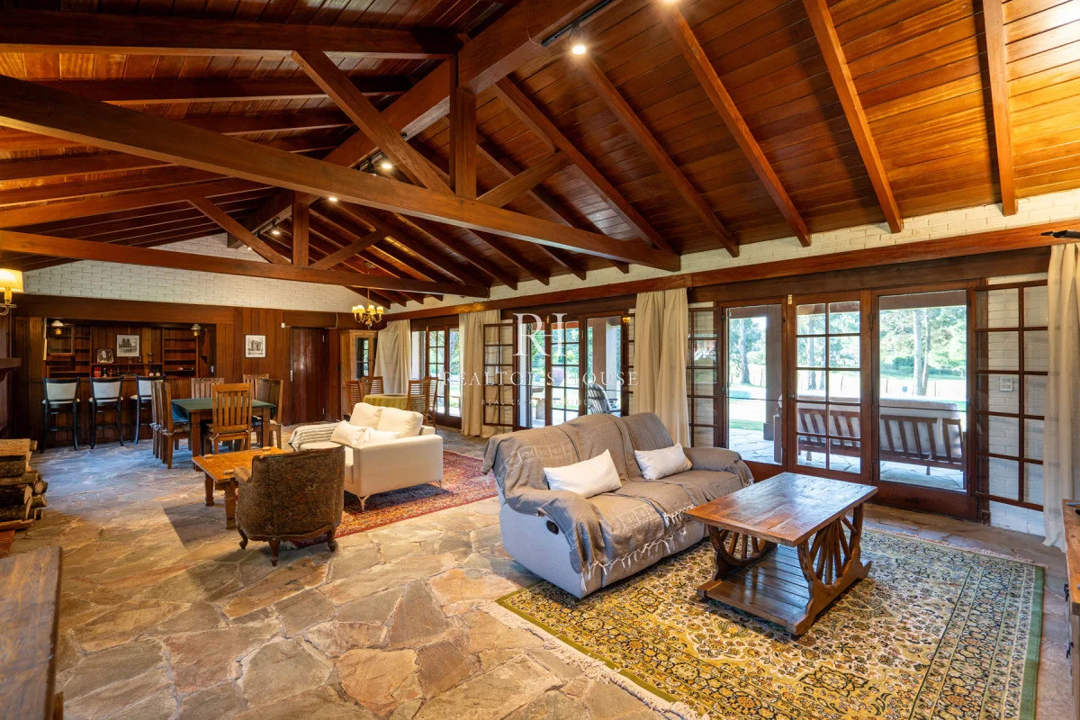 Ala Derecha: Al ingresar por la puerta principal te recibirá un hall amplio, a su derecha un living comedor con techos a doble altura y un acogedor barcito todo revestido en cedro. Con una puerta vaivén conectando a una antecocina y cocina irregular de generosas dimensiones, ofrece un espacio perfectamente equipado, living íntimo, lavadero, puerta de servicio. Un pasillo elegante te guiará hacia el garaje con capacidad para dos automóviles, garantizando un acceso directo y conveniente. Dos dependencias de servicio, cada una con su propio baño, están diseñadas para mantener la privacidad y por ultimo acceso al área de huéspedes con un living, estar y dormitorio.