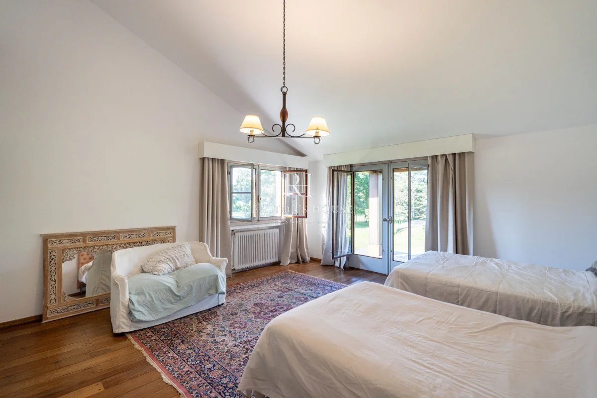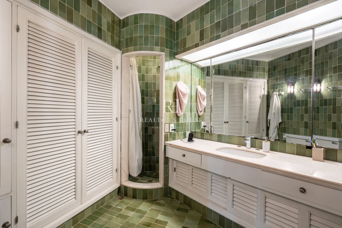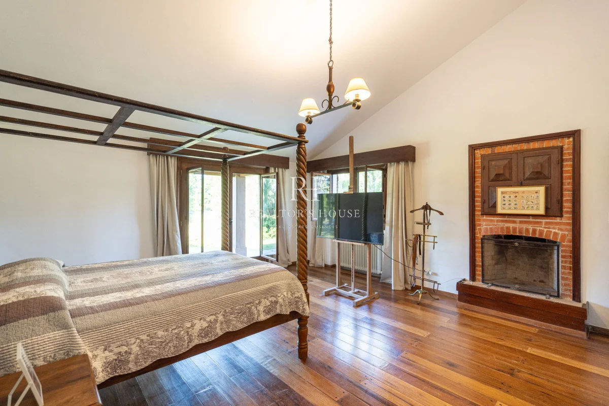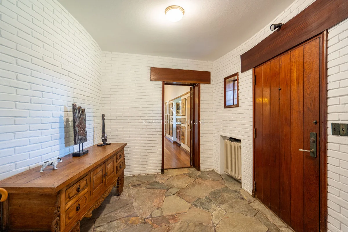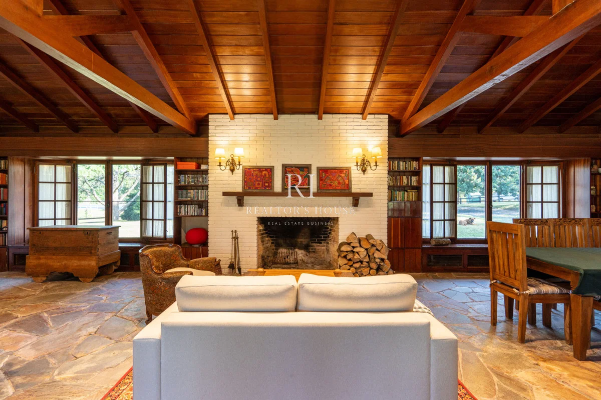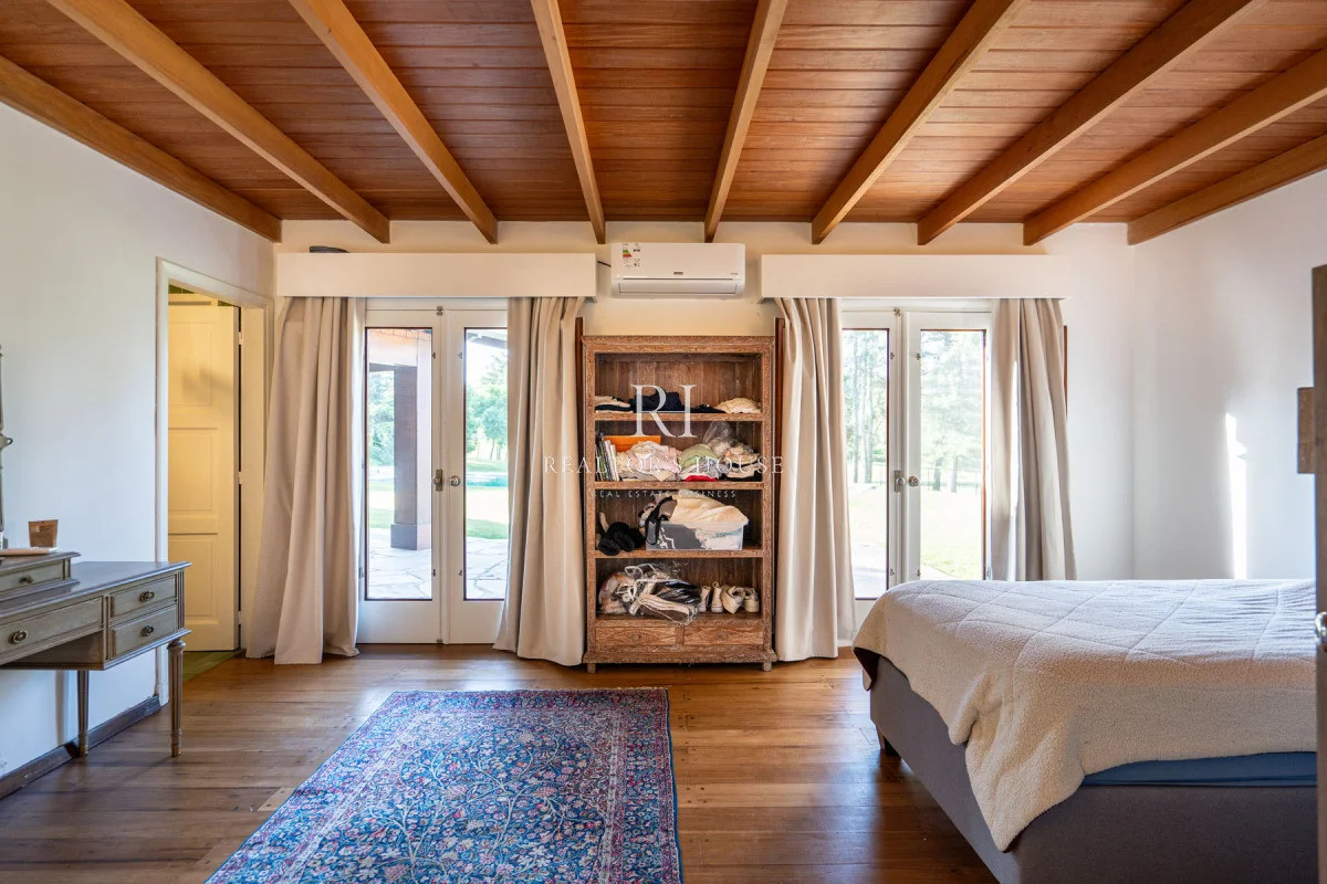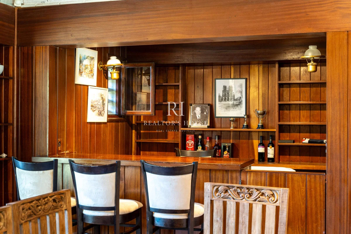 Ala Derecha: Al ingresar por la puerta principal te recibirá un hall amplio, a su derecha un living comedor con techos a doble altura y un acogedor barcito todo revestido en cedro. Con una puerta vaivén conectando a una antecocina y cocina irregular de generosas dimensiones, ofrece un espacio perfectamente equipado, living íntimo, lavadero, puerta de servicio. Un pasillo elegante te guiará hacia el garaje con capacidad para dos automóviles, garantizando un acceso directo y conveniente. Dos dependencias de servicio, cada una con su propio baño, están diseñadas para mantener la privacidad y por ultimo acceso al área de huéspedes con un living, estar y dormitorio.